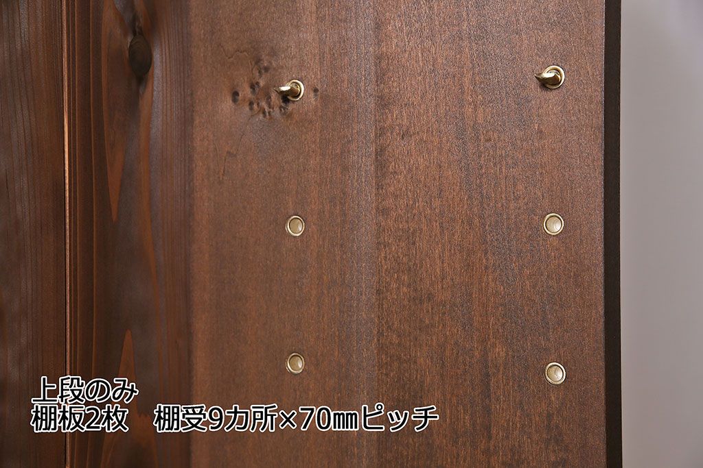 上段の棚板は取り外しできます。棚板は2枚あります。棚受けは9ヶ所、70mmピッチで調整できます。棚幅サイズのものが1枚の作りです。