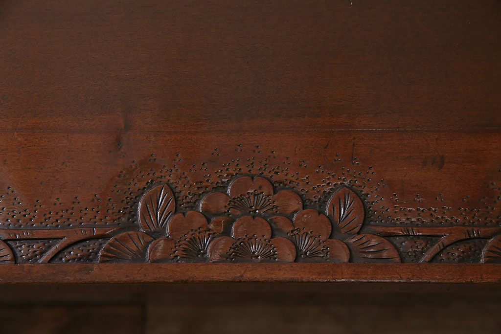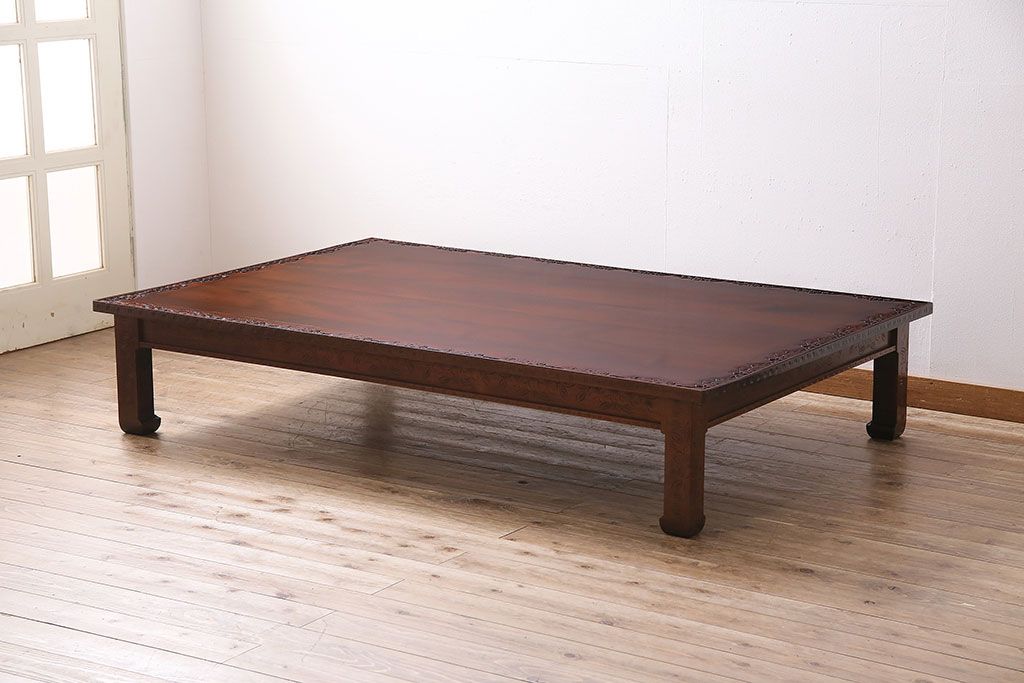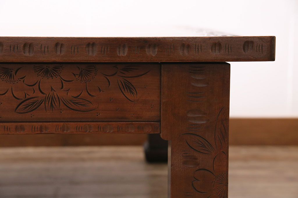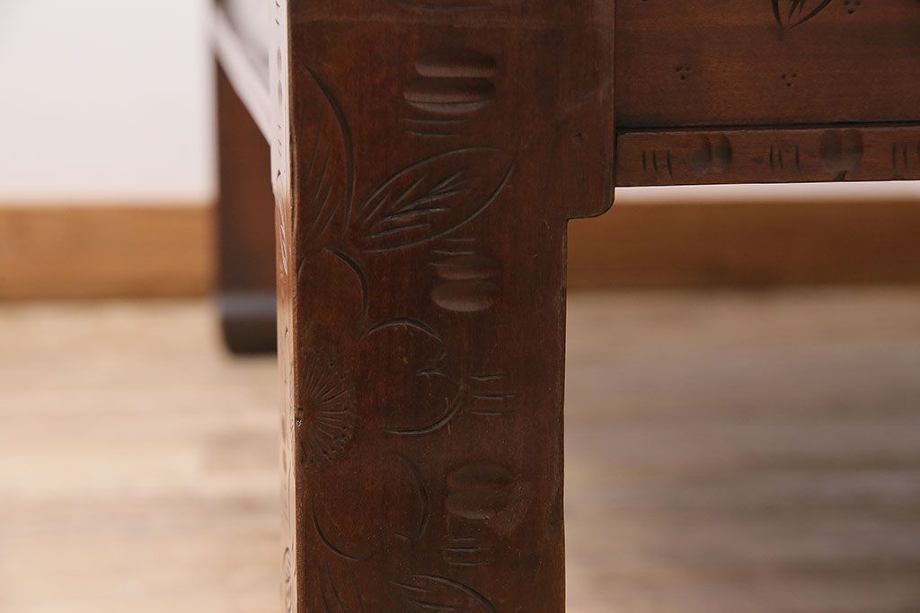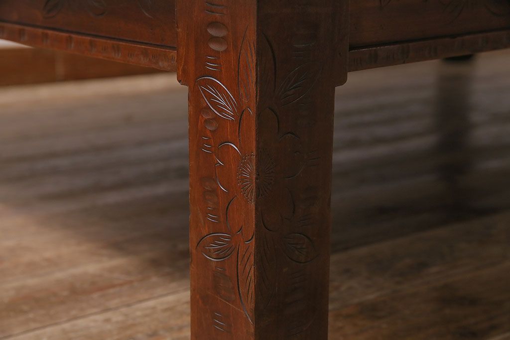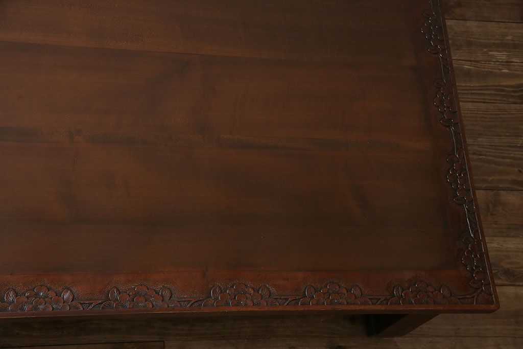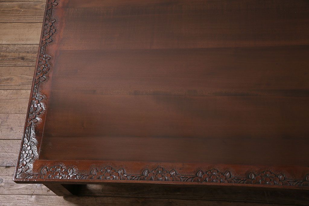 民芸家具 > ヴィンテージ家具 伝統工芸 軽井沢彫り サクラの彫刻をあしらった特大サイズの座卓(センターテーブル、ビンテージ)(R-046141)