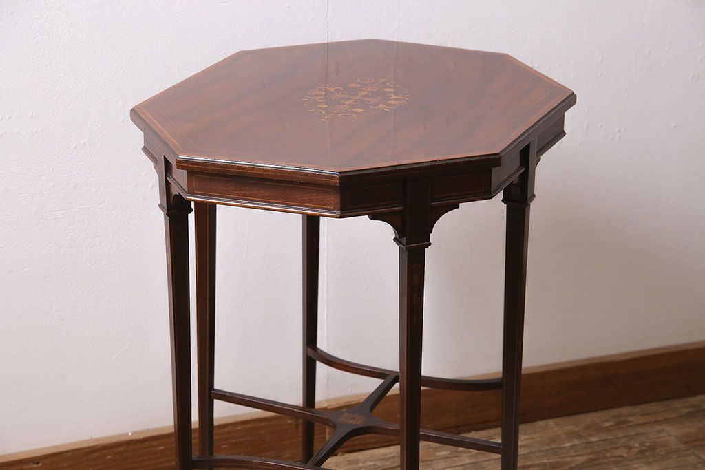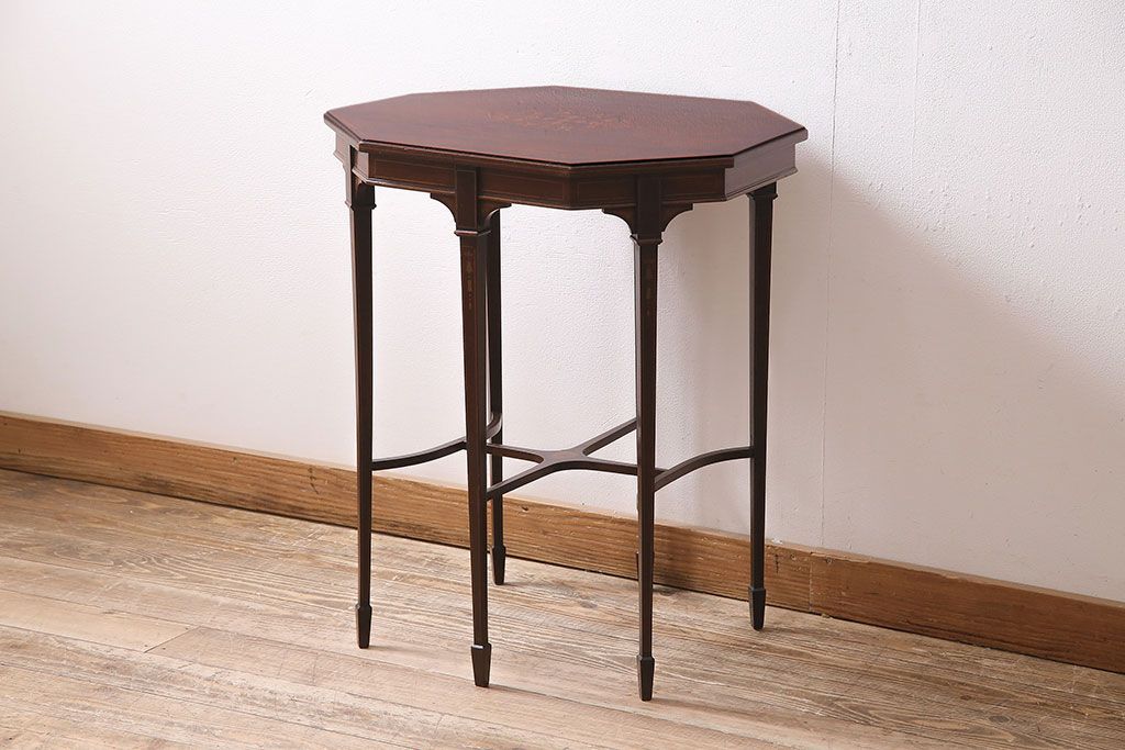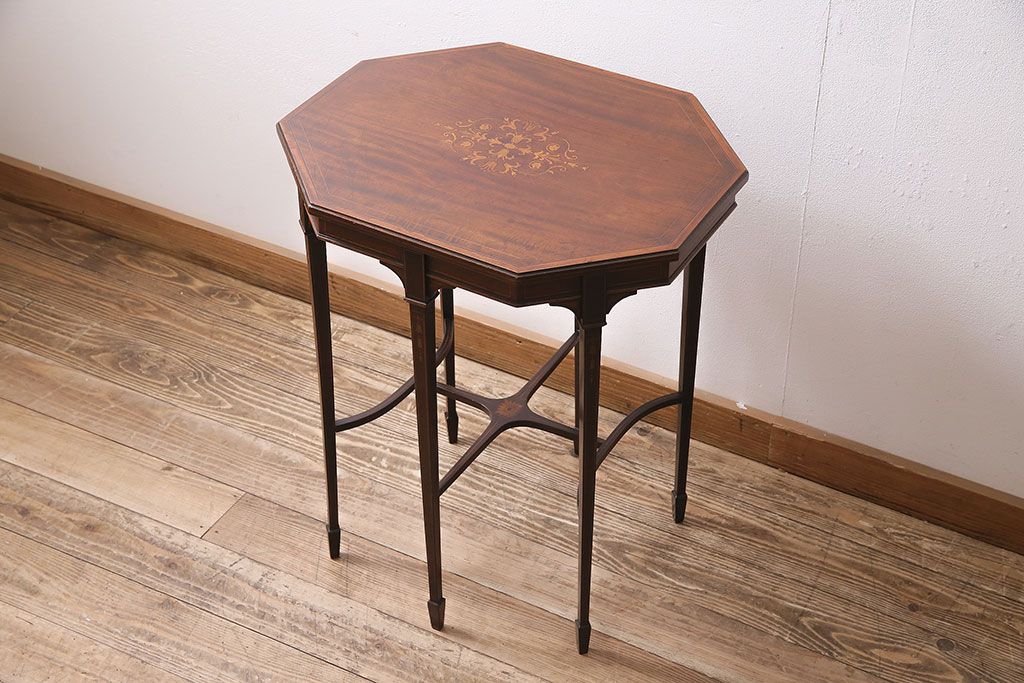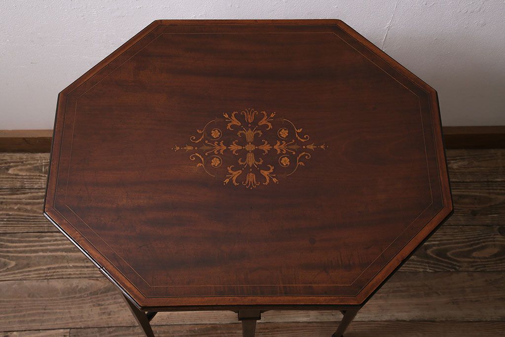 ラフジュ工房> テーブル> サイドテーブル > アンティーク家具 イギリスアンティーク 上手物 マホガニー材 象嵌細工 八角形の天板がお洒落なオケージョナルテーブル(サイドテーブル、花台、オーバルテーブル、カフェテーブル)(R-046153)