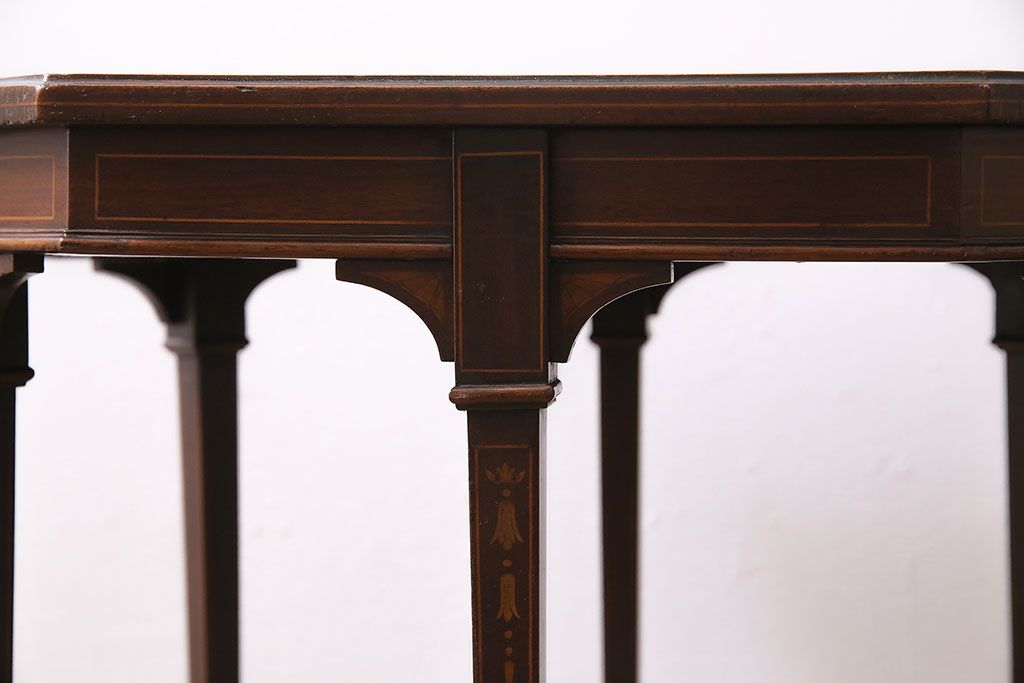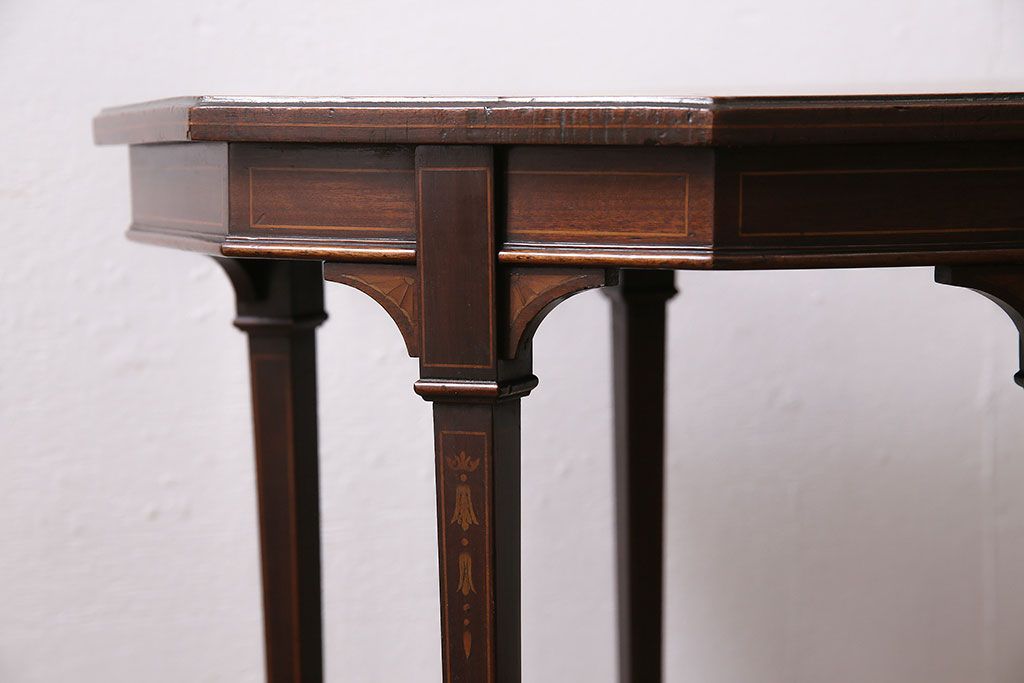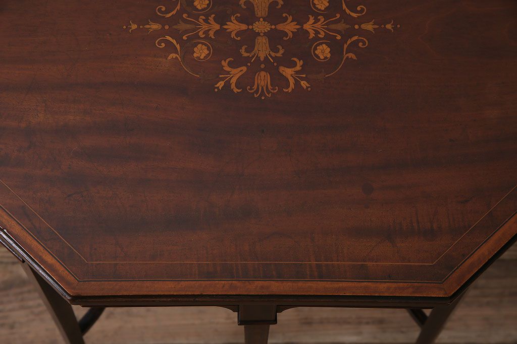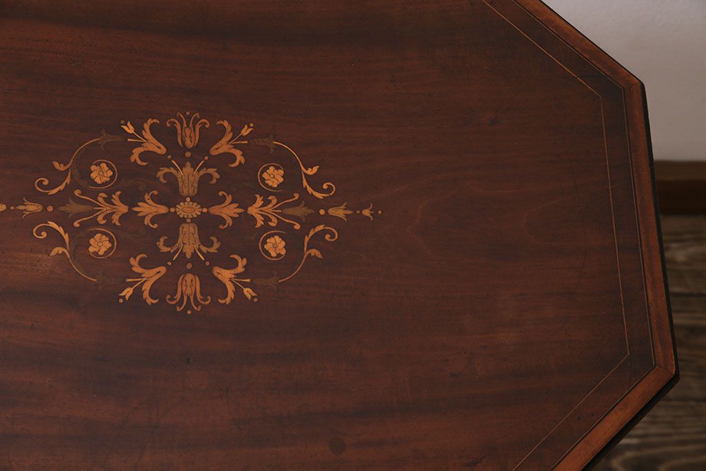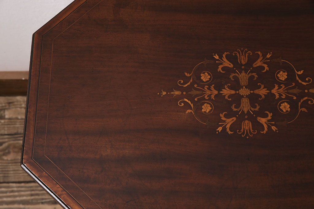 ラフジュ工房> テーブル> コンソールテーブル > アンティーク家具 イギリスアンティーク 上手物 マホガニー材 象嵌細工 八角形の天板がお洒落なオケージョナルテーブル(サイドテーブル、花台、オーバルテーブル、カフェテーブル)(R-046153)