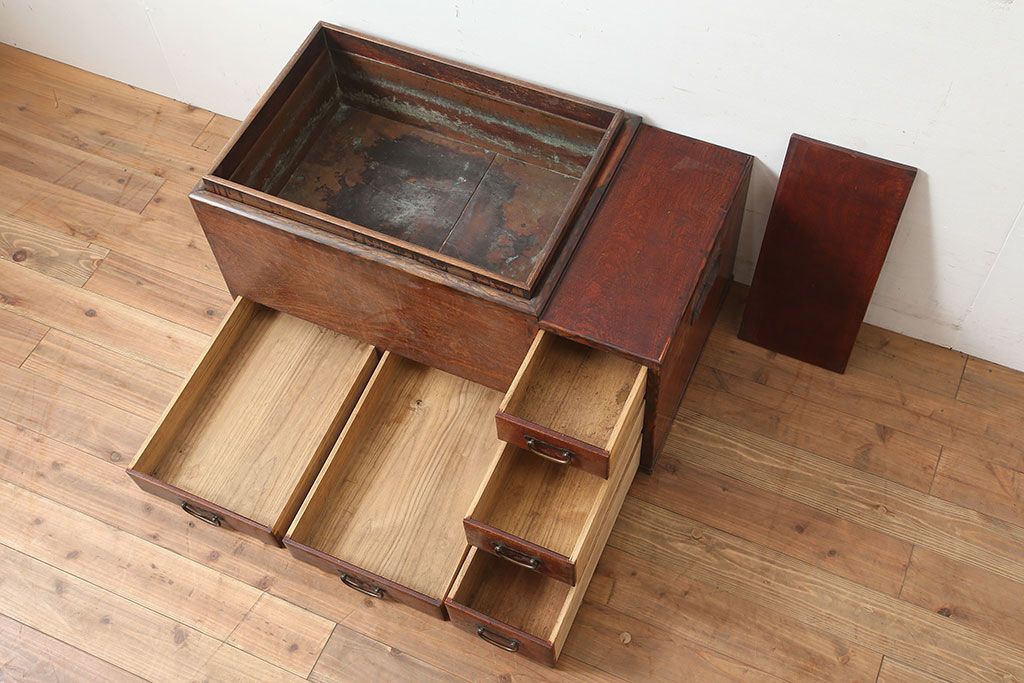 アンティーク雑貨 昭和初期 ケヤキ材・黒柿 年月を重ねた風合いが味わい深い長火鉢(木製火鉢)(R-046246)です。