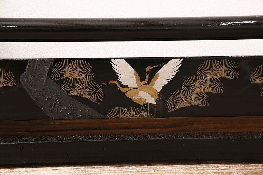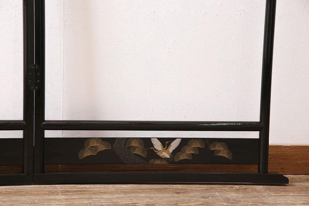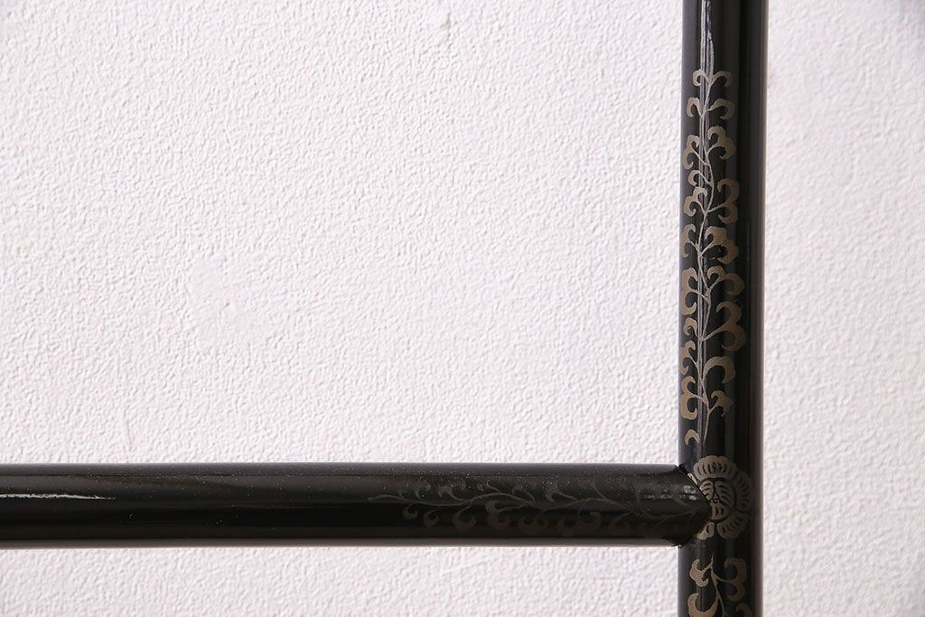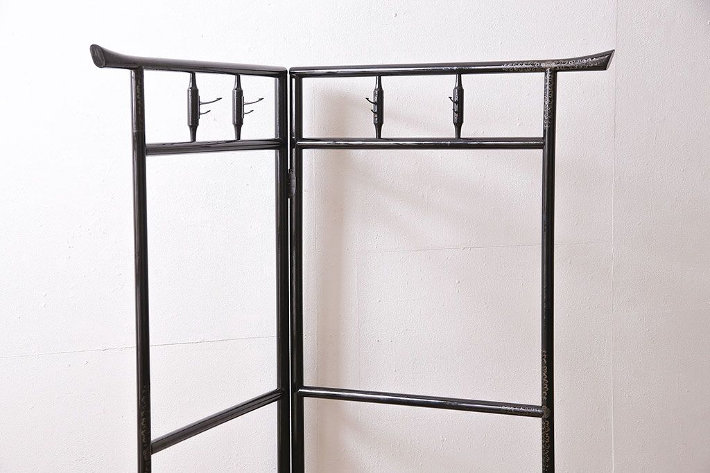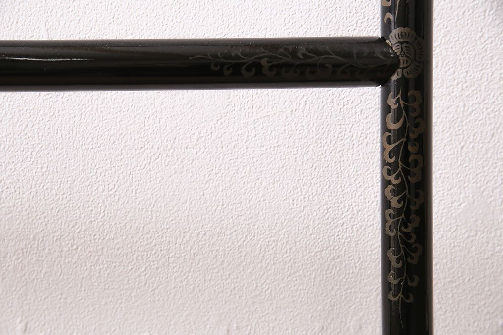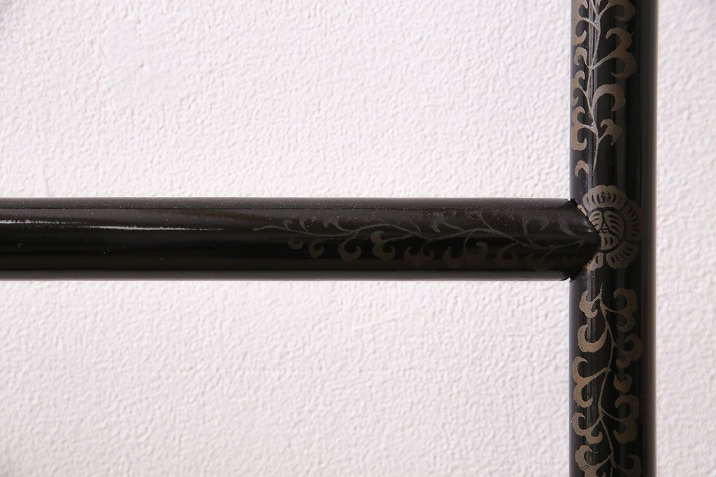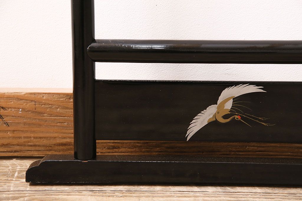 ヴィンテージ家具 昭和中期 鶴と松 漆塗りが高級感を漂わせるフック付きの衣桁(着物掛け、ハンガーラック、ビンテージ)(R-046266)