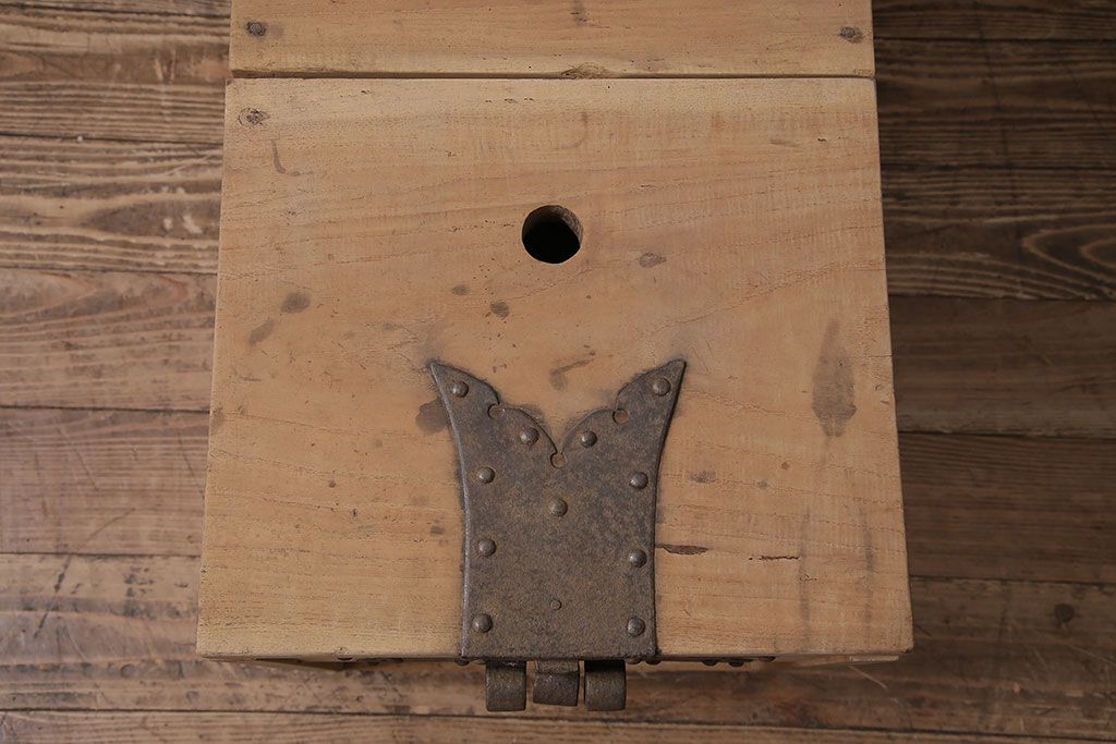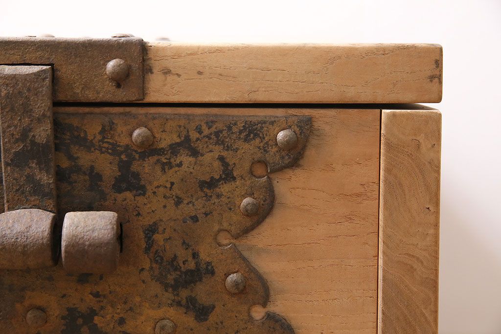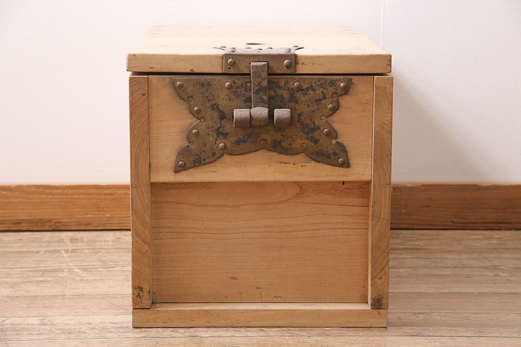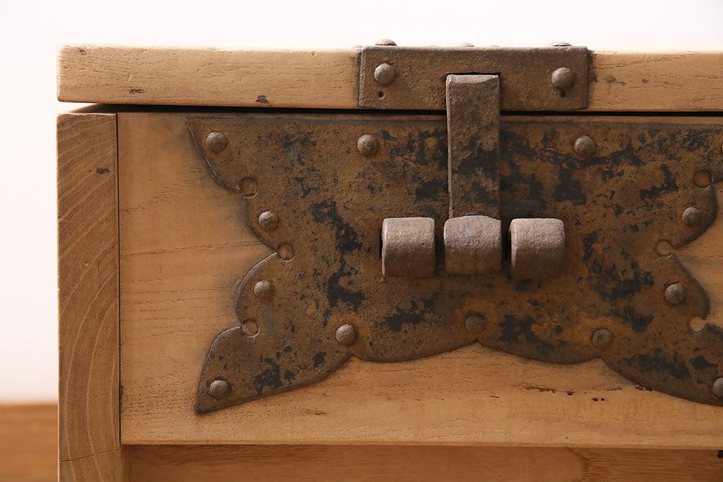 アンティーク雑貨 明治大正期 栗材 ストリップド(剥離) 錆びついた金具が味わい深い銭箱(銭函)(R-046230)