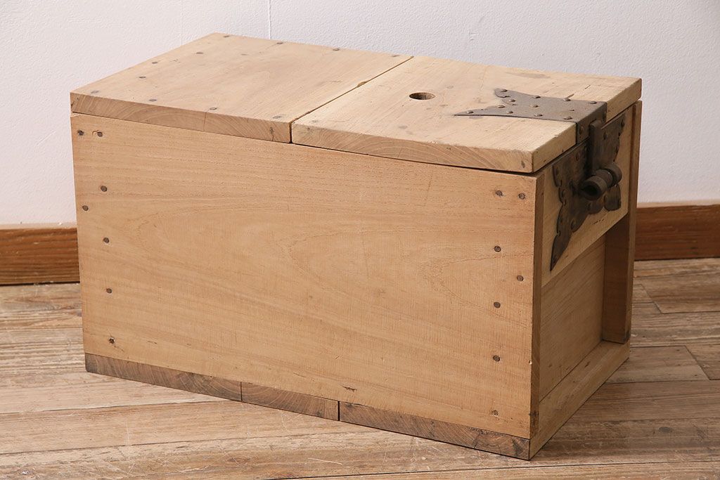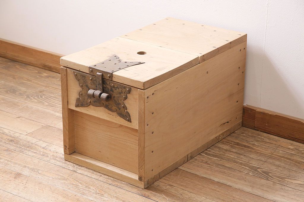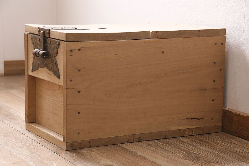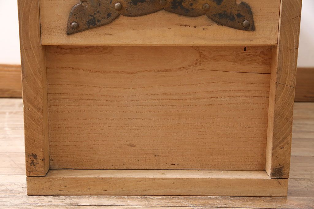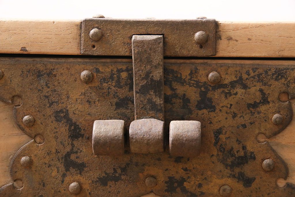 アンティーク雑貨 明治大正期 栗材 ストリップド(剥離) 錆びついた金具が味わい深い銭箱(銭函)(R-046230)