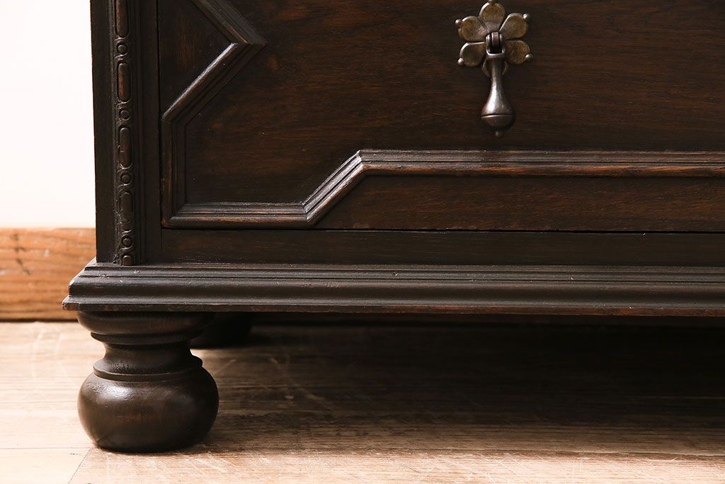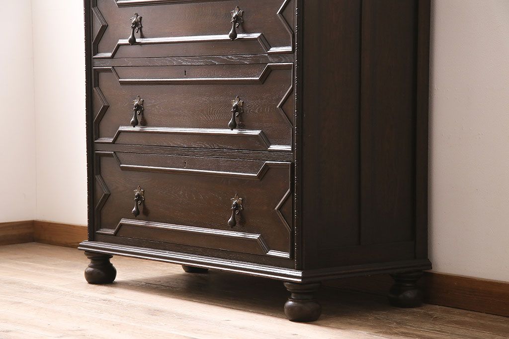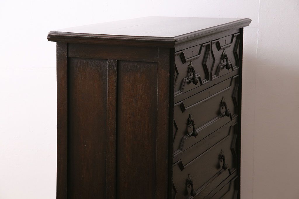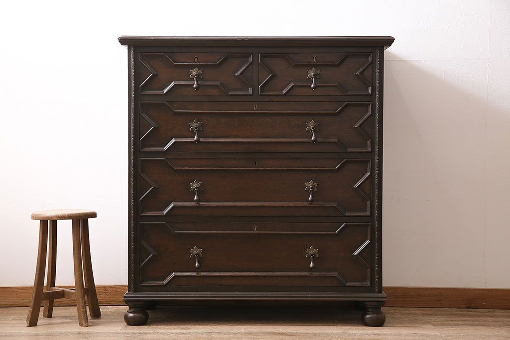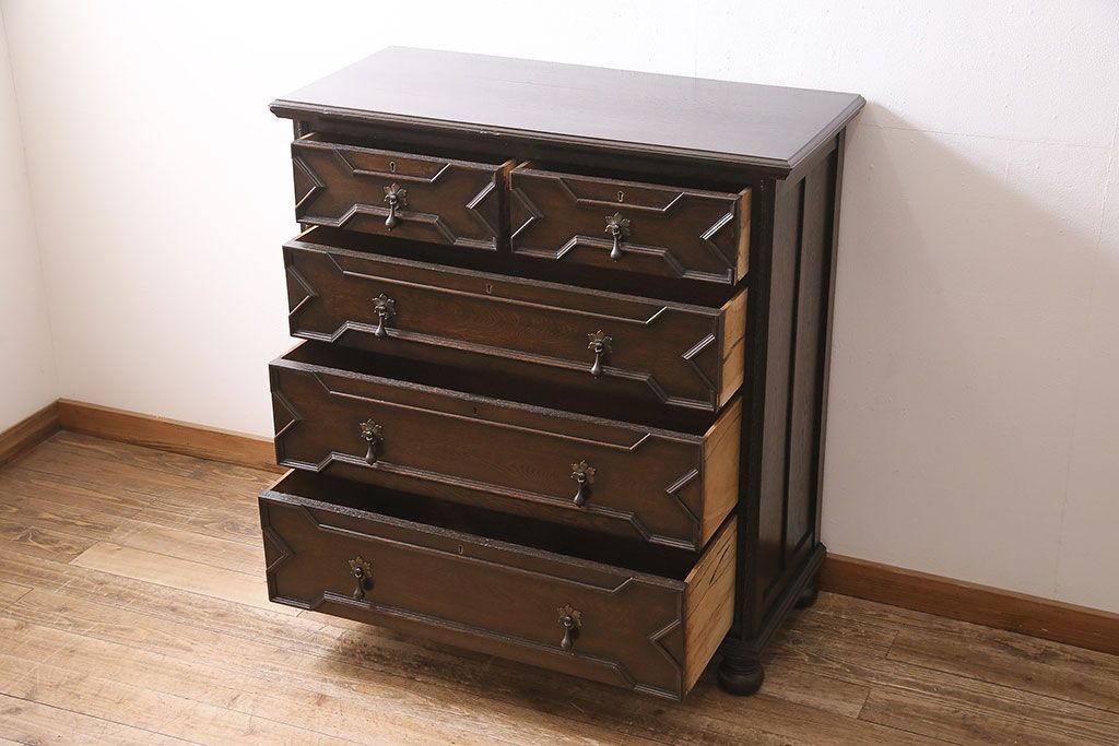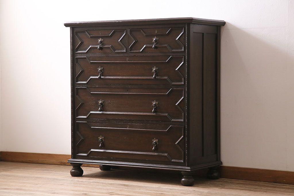 イギリスアンティーク オーク材 シックな中にも可憐なデザインが光るチェスト(引き出し、キャビネット、収納棚)(R-046247)