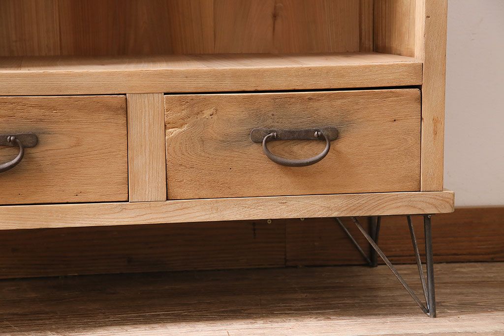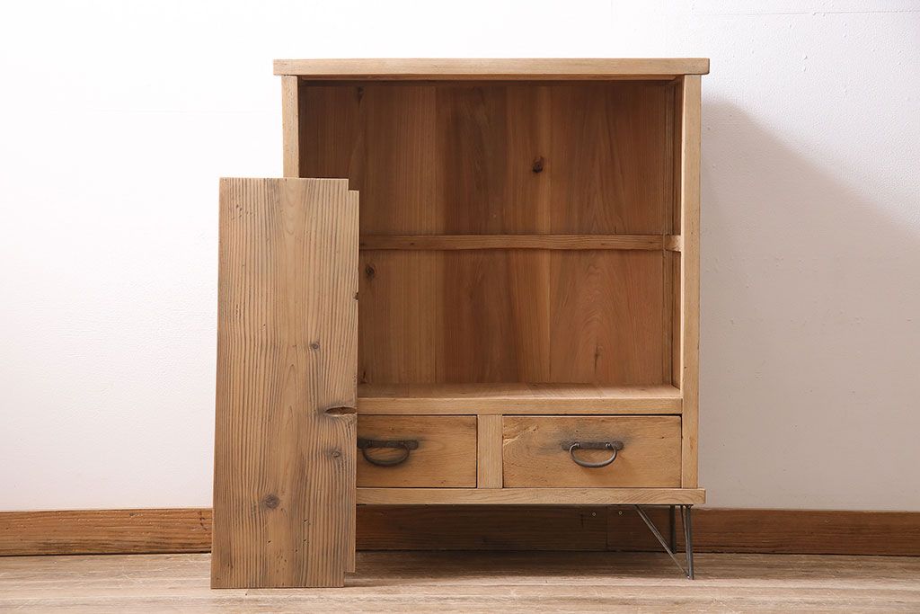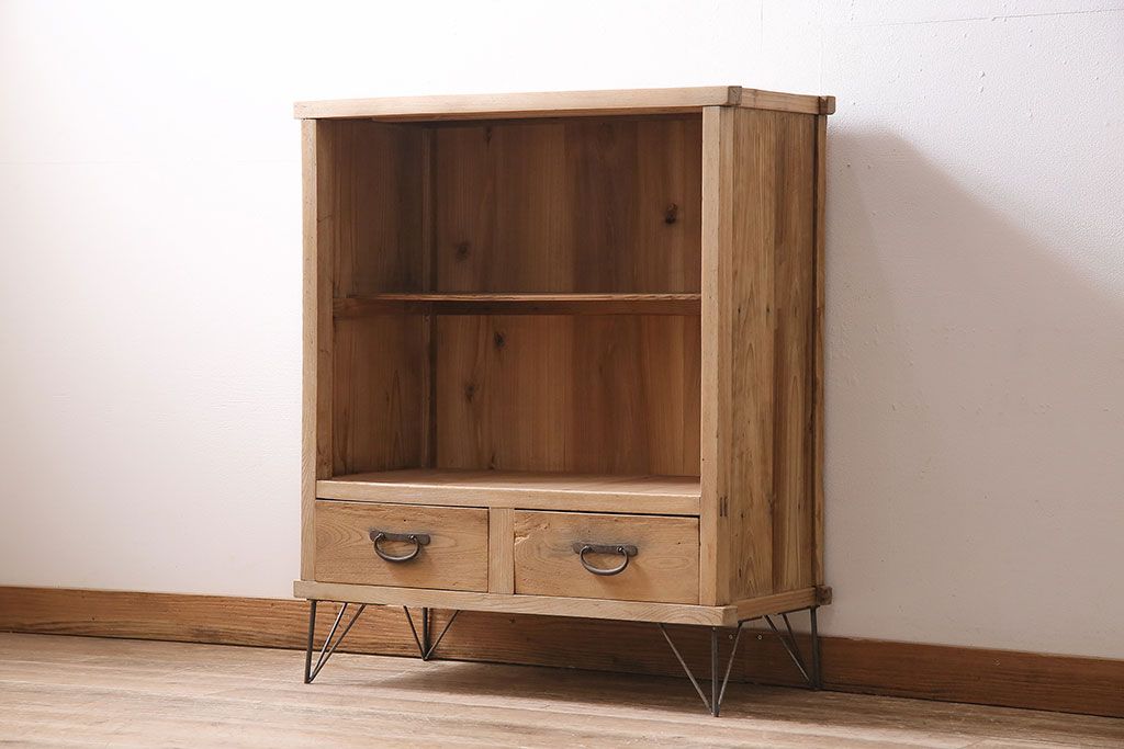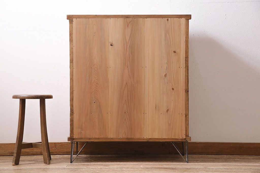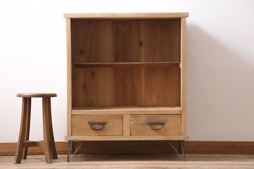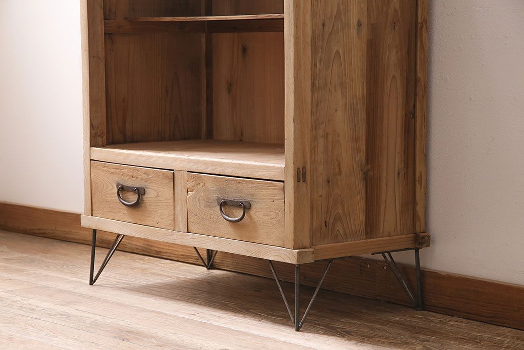 ストリップド(剥離)家具 > アンティーク家具 和製 昭和中期 ストリップド(剥離) ニレ材 素朴な木の質感が楽しめる鉄脚付き収納棚(戸棚、オープン棚)(R-046156)