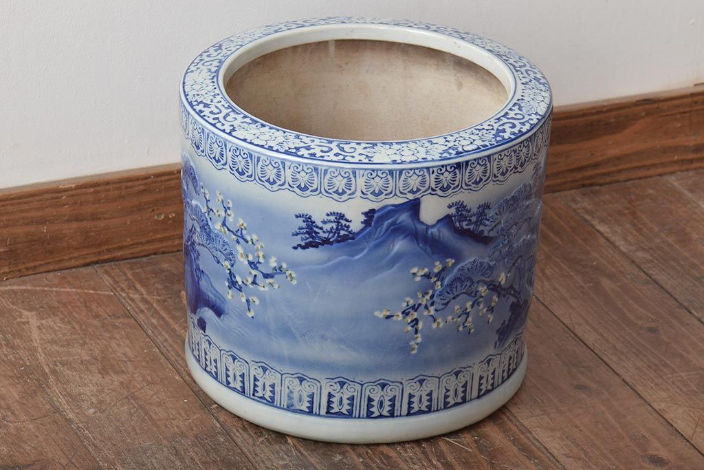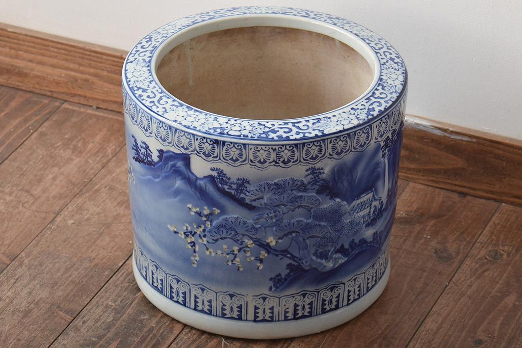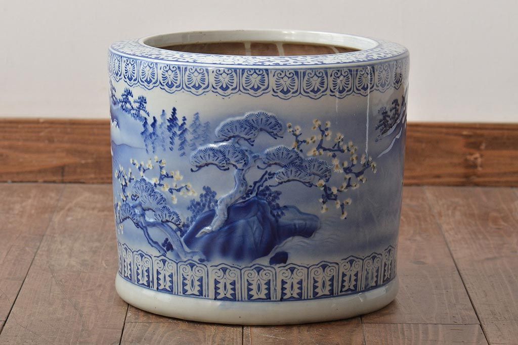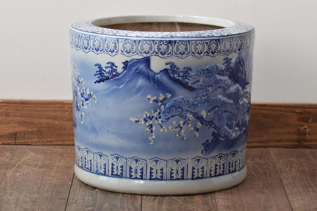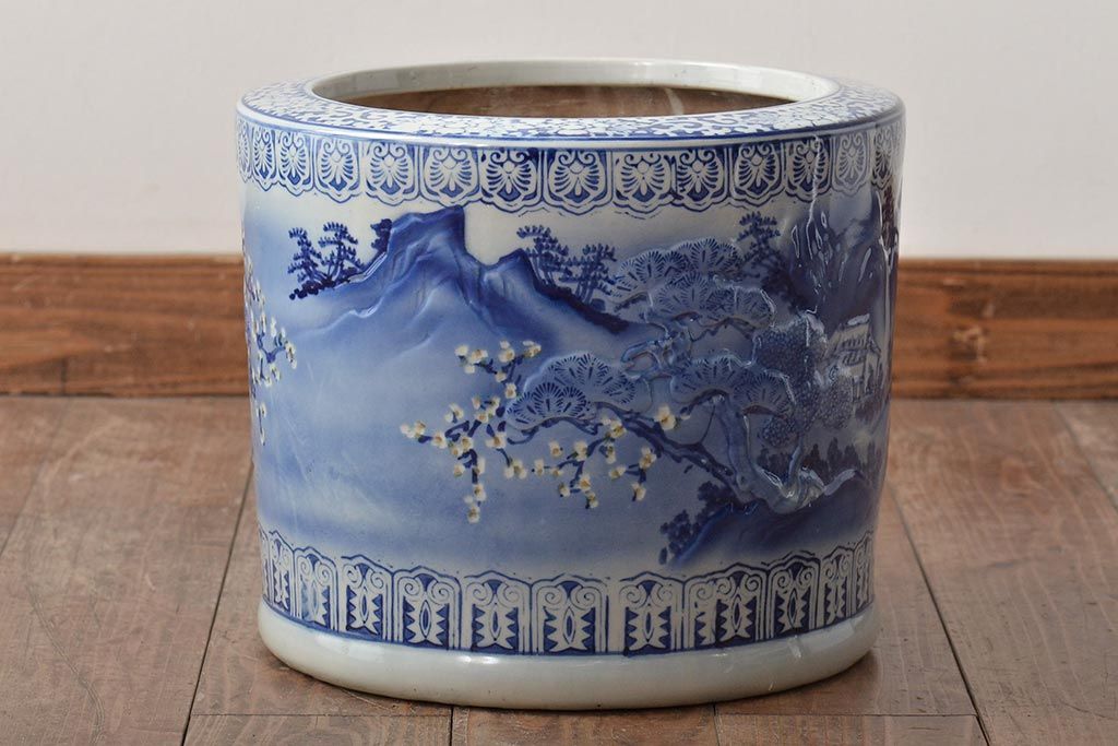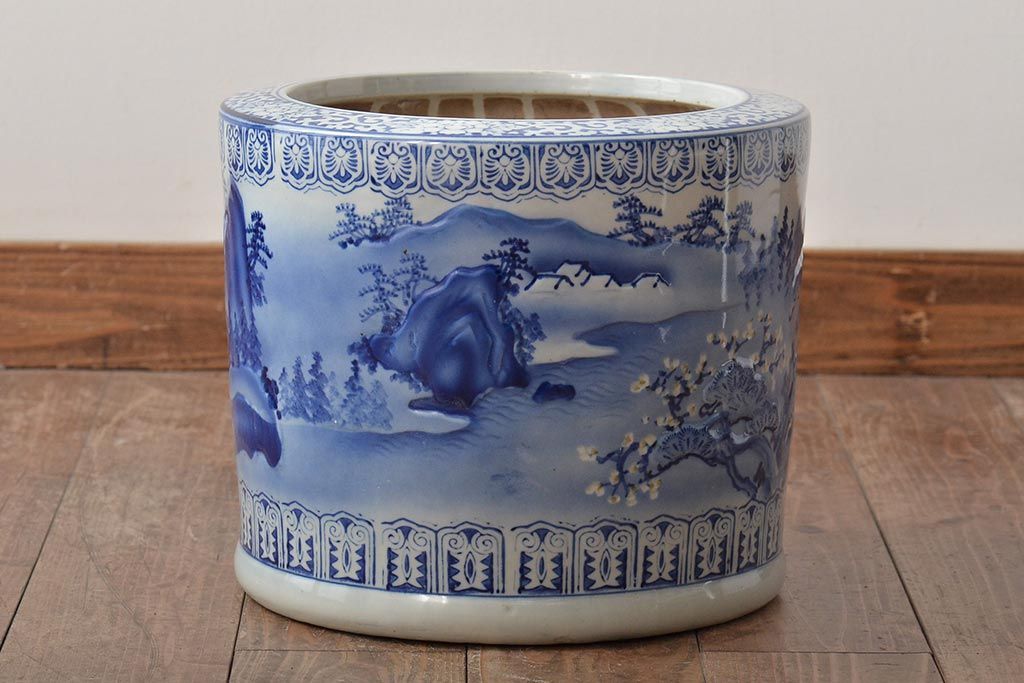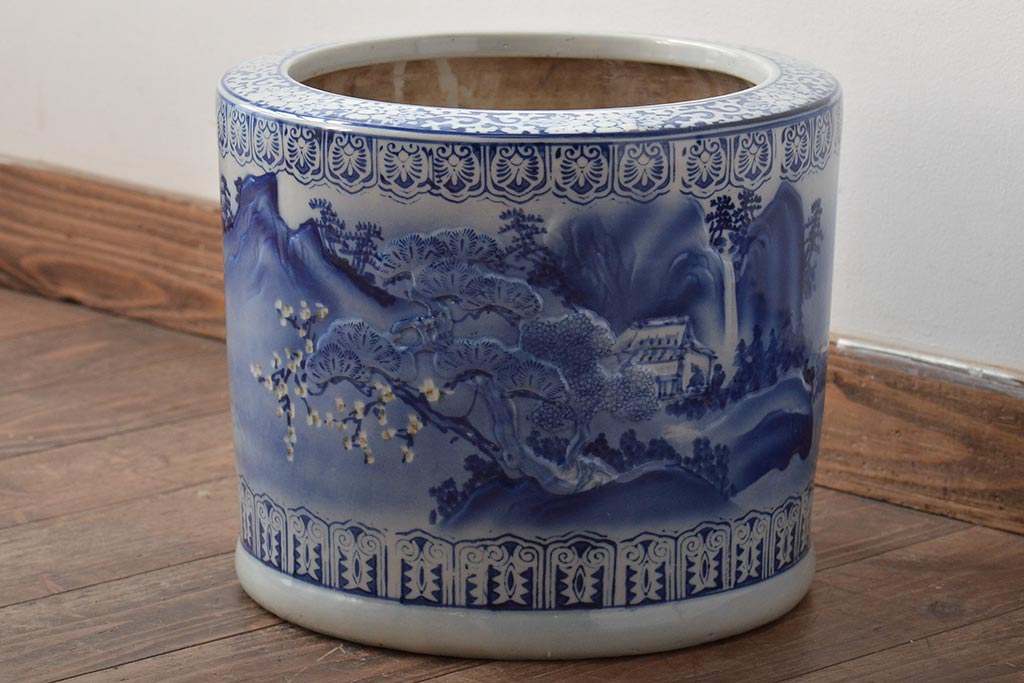 アンティーク雑貨 大正〜昭和初期 松・花・風景の図 瀬戸火鉢(鉢カバー)(R-045998)