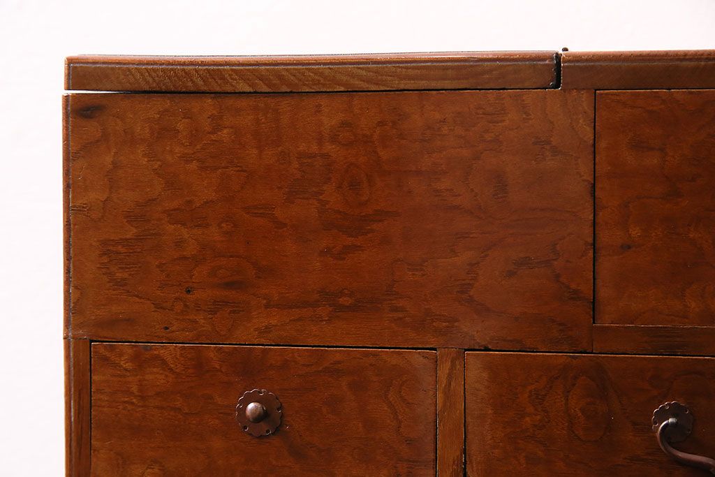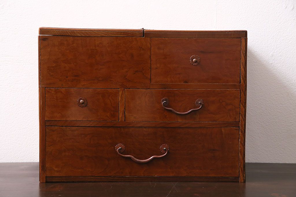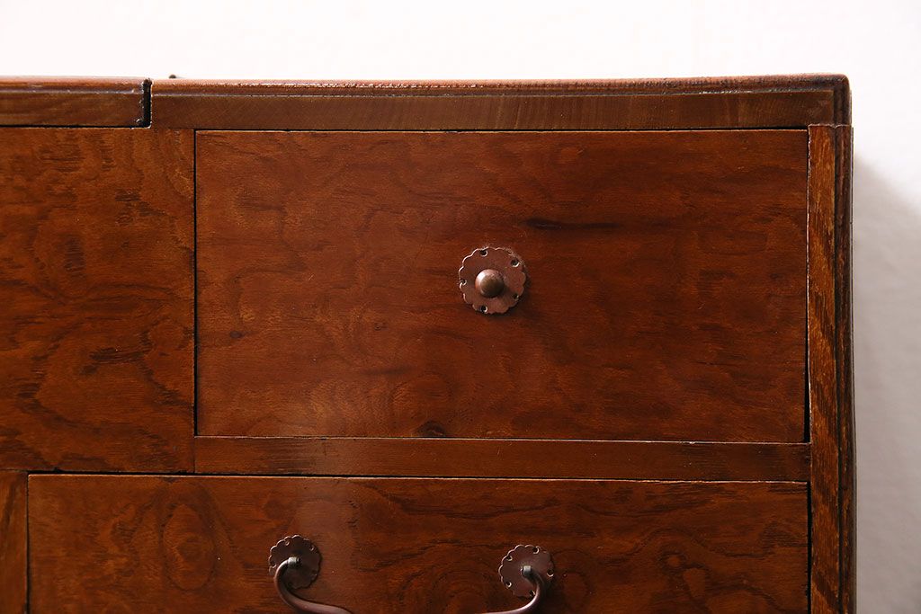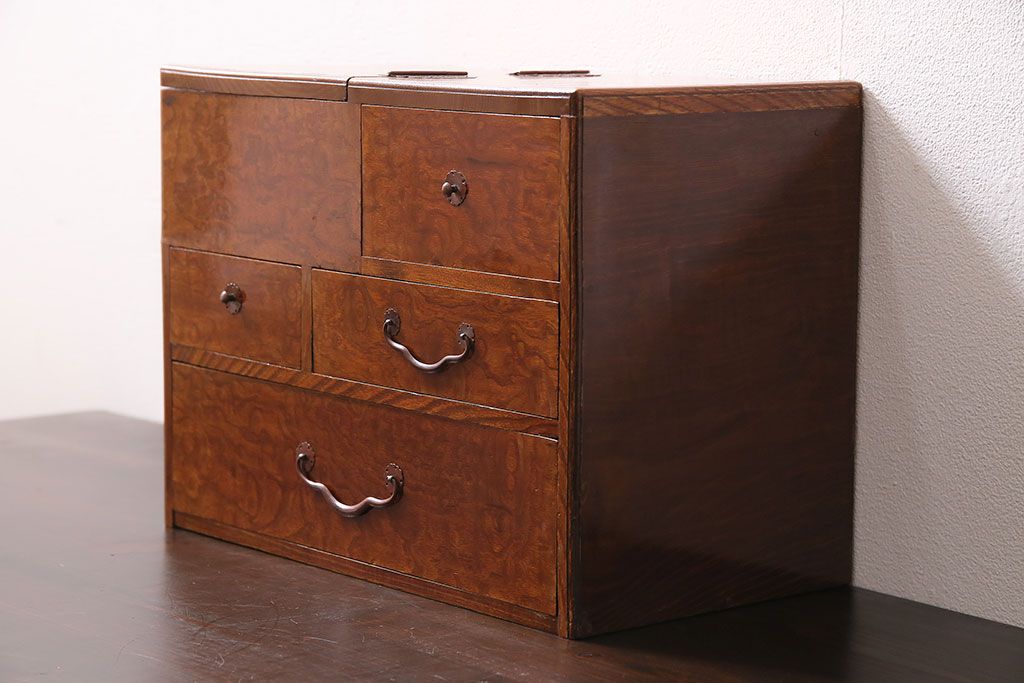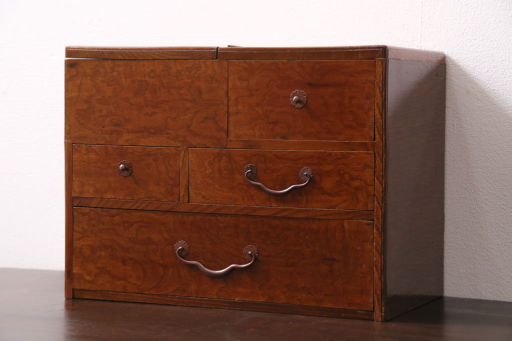 レトロ雑貨 明治大正期 高級!ケヤキ玉杢が美しい裁縫箱(ソーイングボックス、針箱、小引き出し、小物収納)(R-046279)
