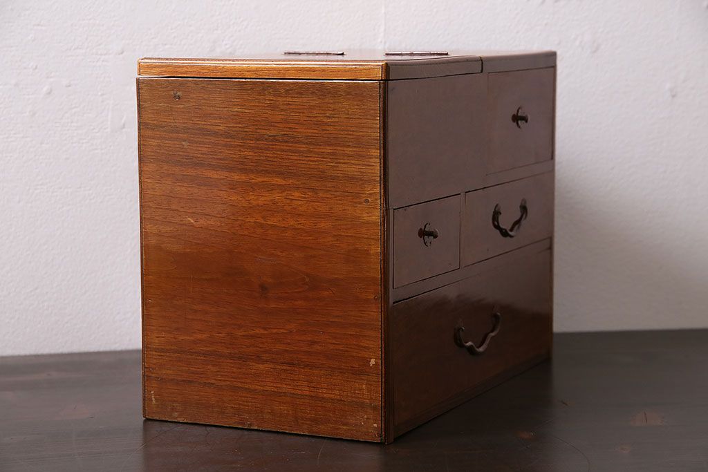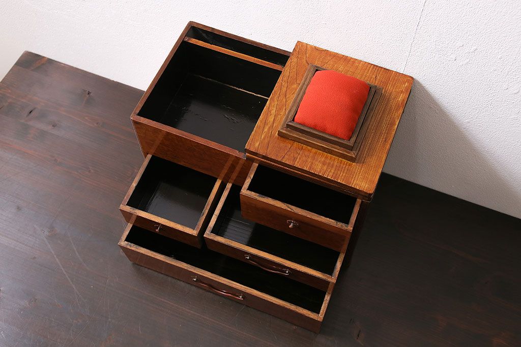 ラフジュ工房> 小物収納・トランク> 小引き出し > レトロ雑貨 明治大正期 高級!ケヤキ玉杢が美しい裁縫箱(ソーイングボックス、針箱、小引き出し、小物収納)(R-046279)