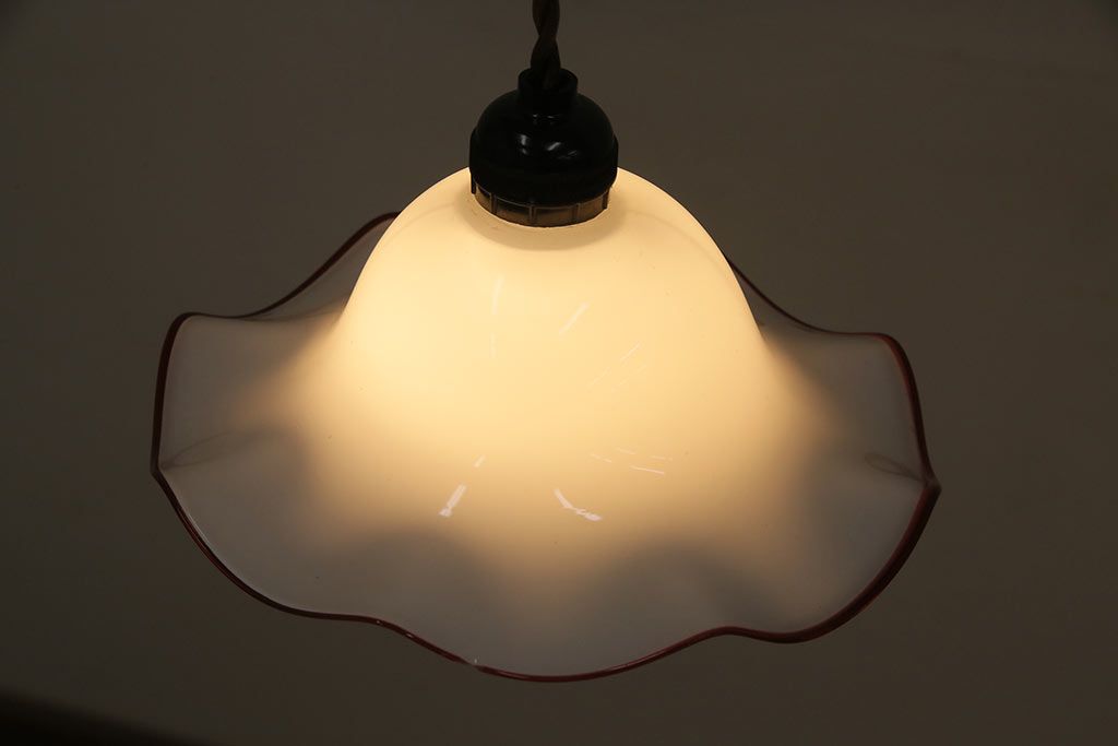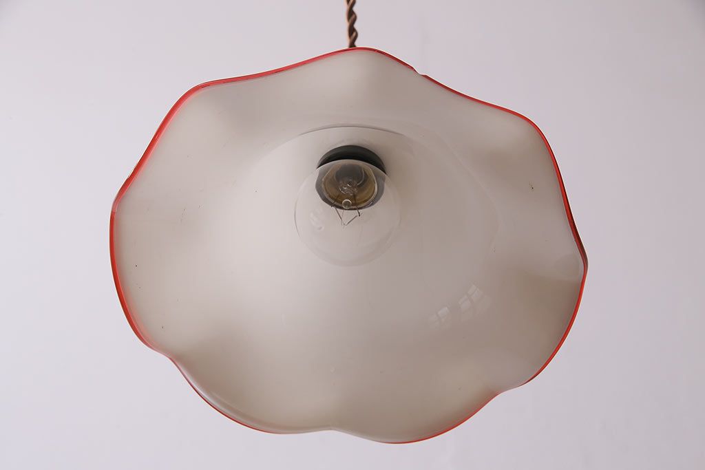 ヴィンテージ照明 イギリスビンテージ 赤色の縁が可愛らしいフリルシェードのペンダントライト(ランプシェード、天井照明)(R-046425)です。