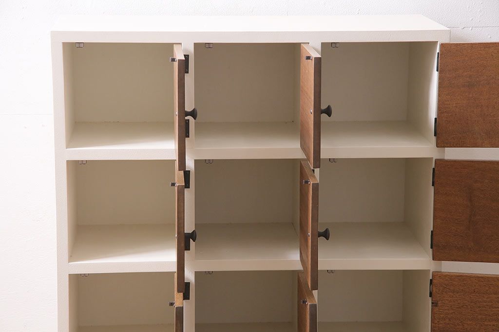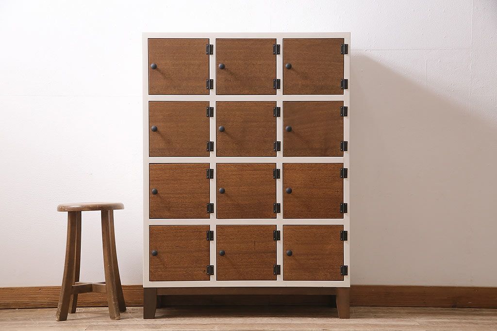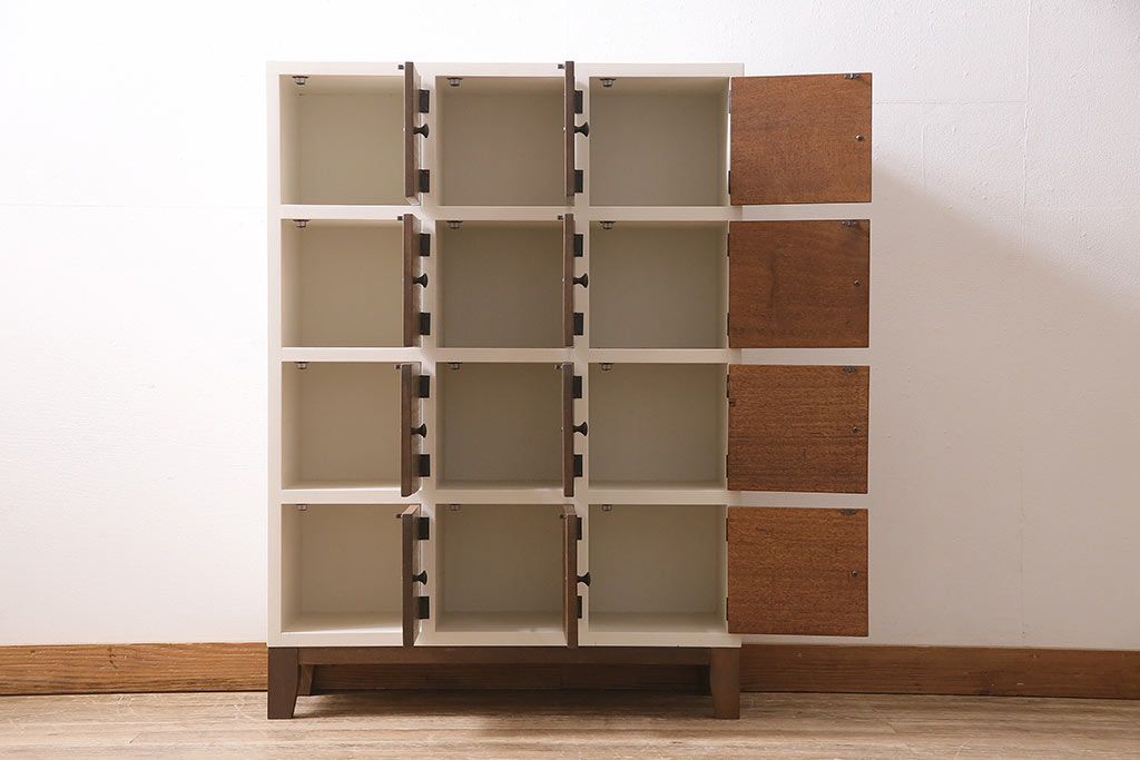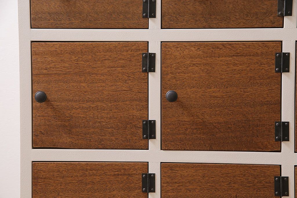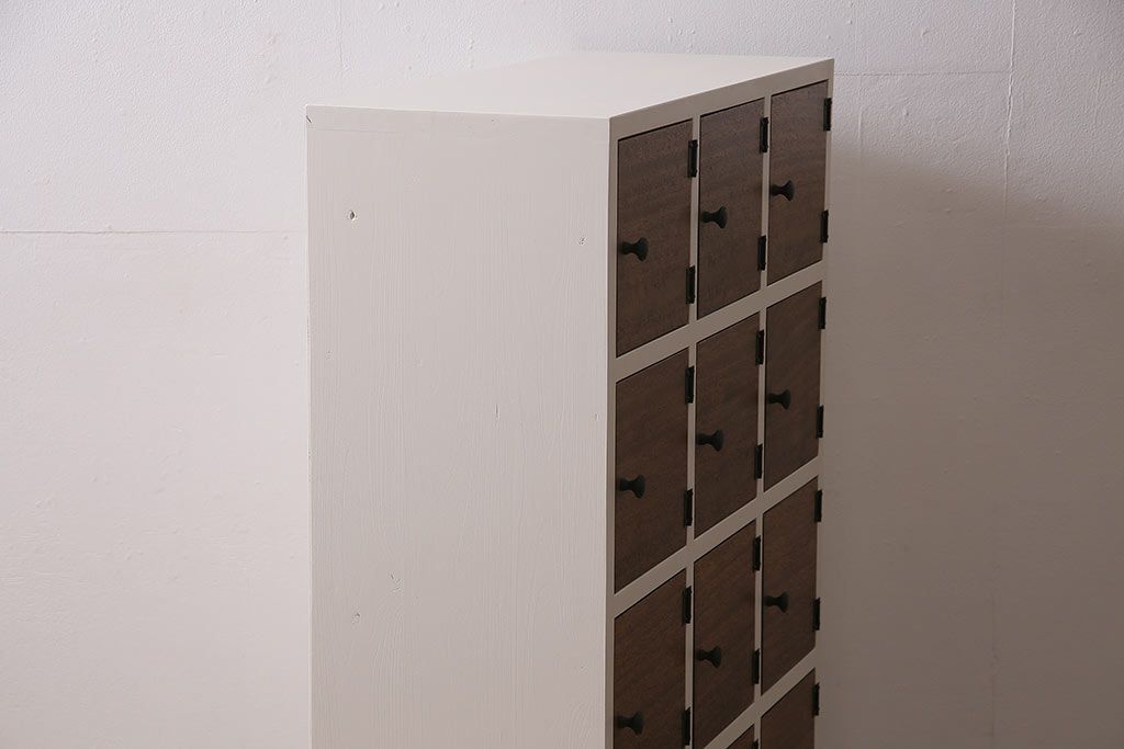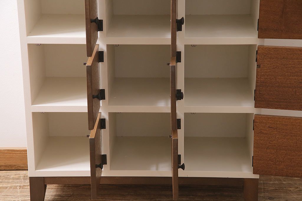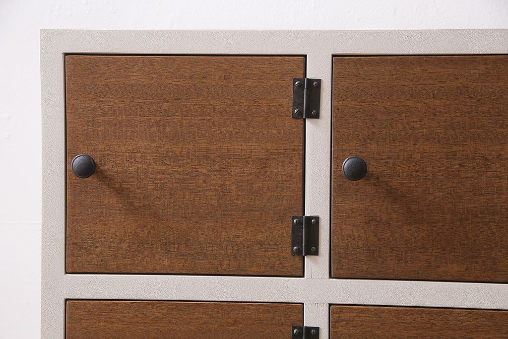 ワードローブ・ロッカー> ロッカー > 扉付きマス目棚を新規製作!本体はヒノキ無垢材、前板は古材を使用。木製脚を取り付け。アンティークホワイトのペイント仕上げ。(収納棚、戸棚、キャビネット、ロッカー)