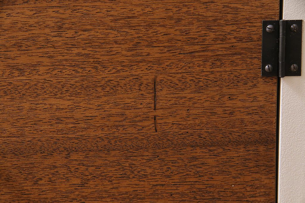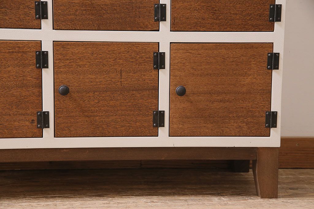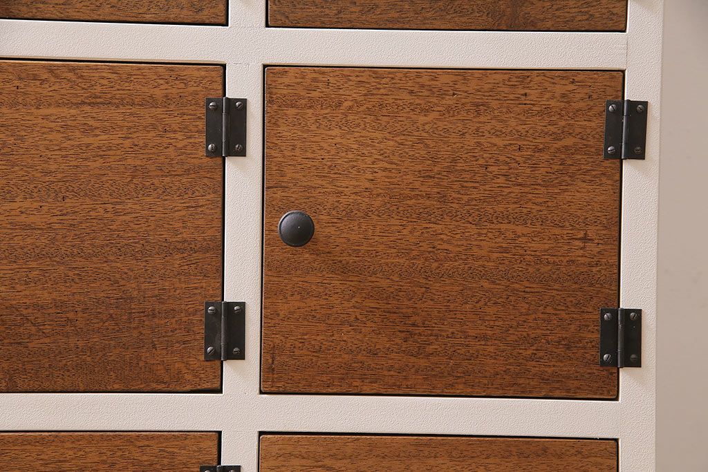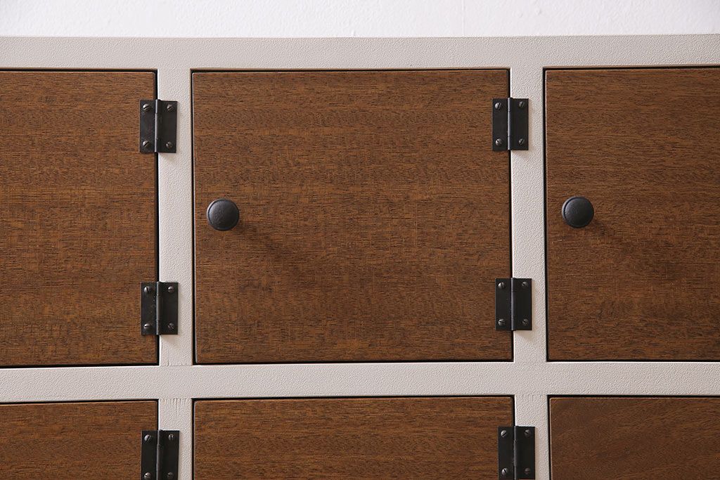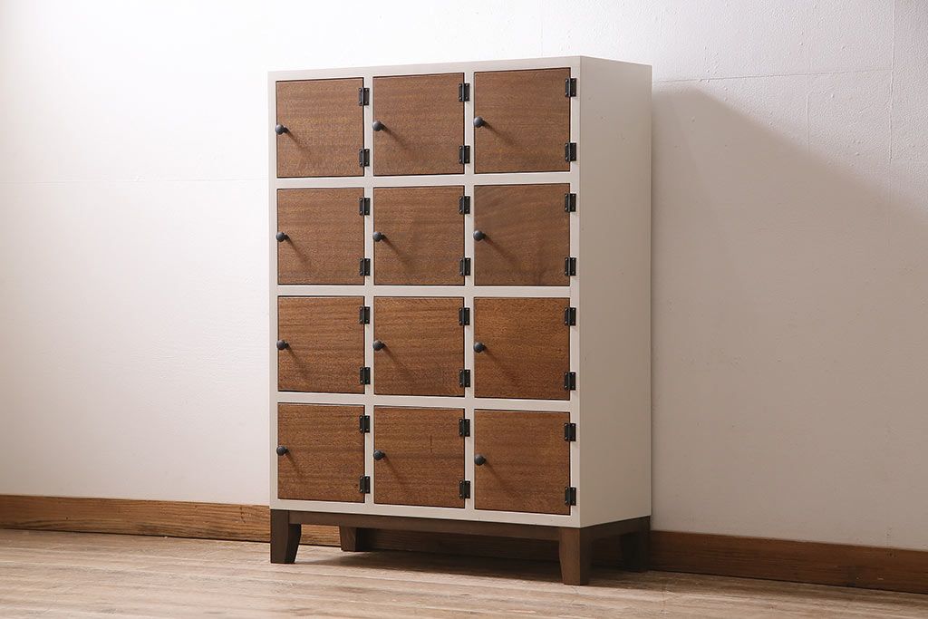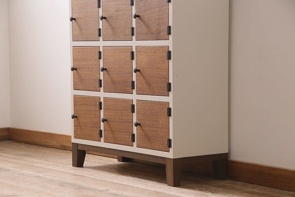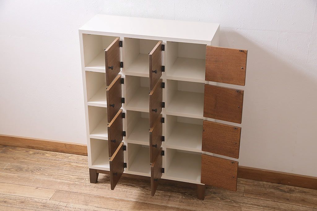 ワードローブ・ロッカー> ロッカー > 扉付きマス目棚を新規製作!本体はヒノキ無垢材、前板は古材を使用。木製脚を取り付け。アンティークホワイトのペイント仕上げ。(収納棚、戸棚、キャビネット、ロッカー)