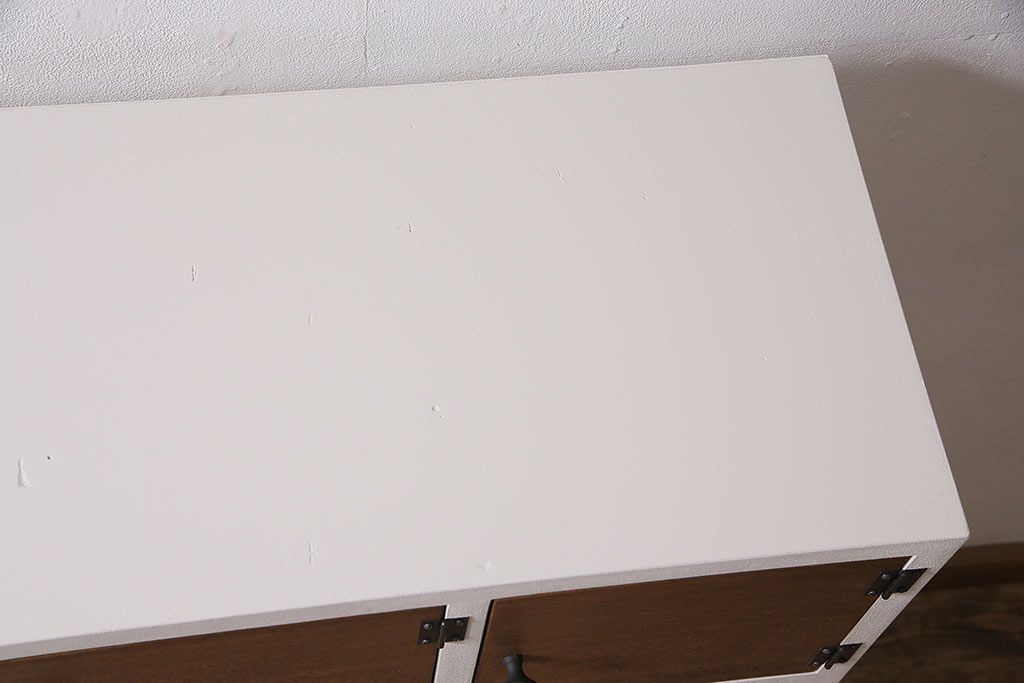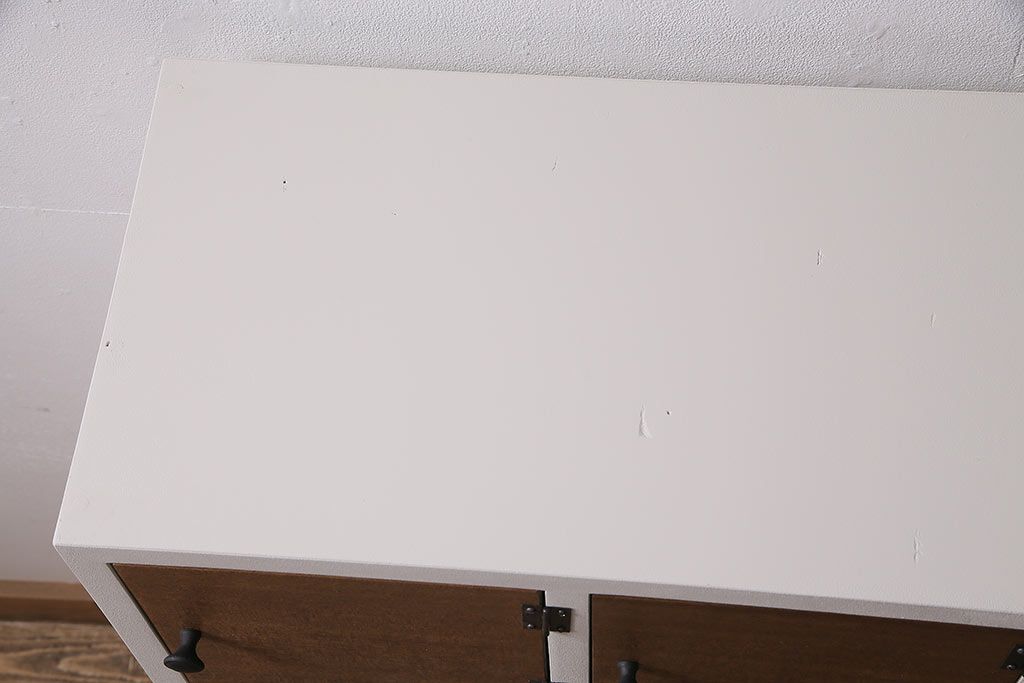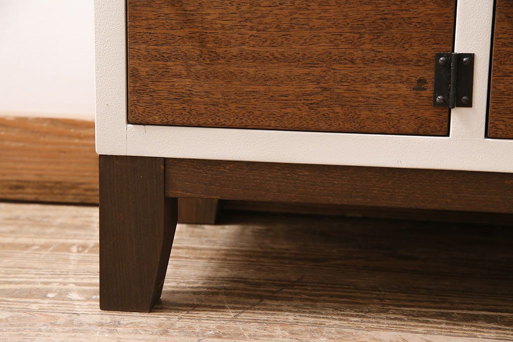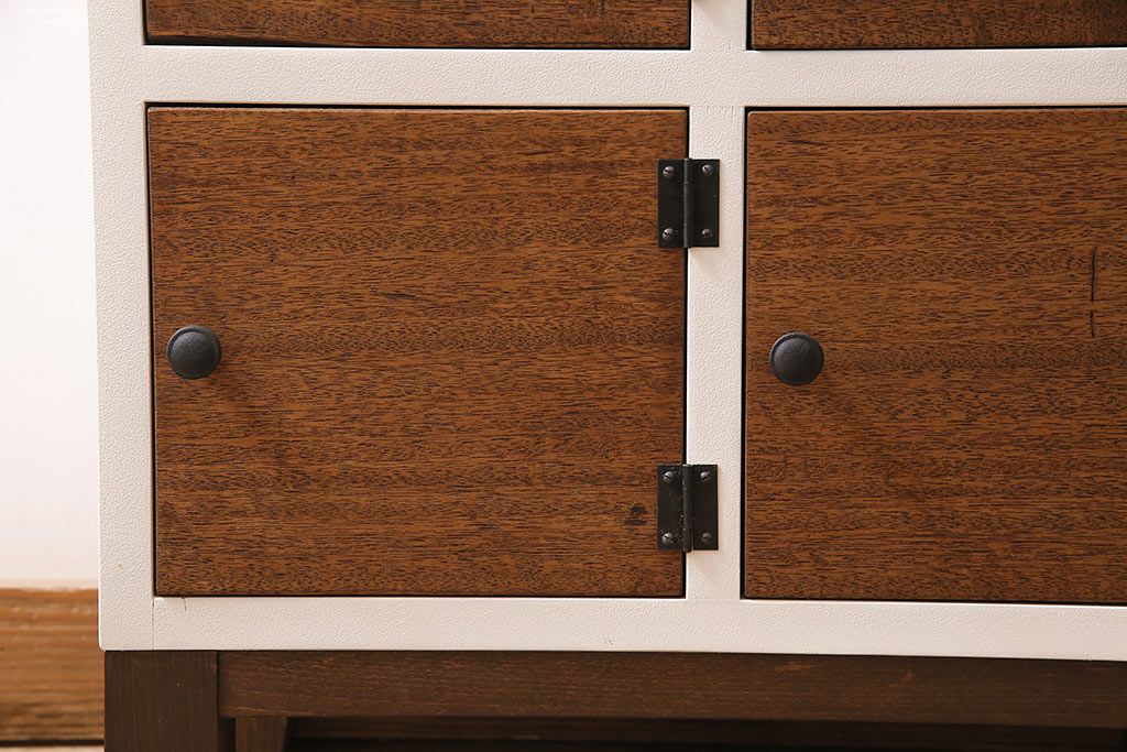 フルオーダー家具実績 > 扉付きマス目棚を新規製作!本体はヒノキ無垢材、前板は古材を使用。木製脚を取り付け。アンティークホワイトのペイント仕上げ。(収納棚、戸棚、キャビネット、ロッカー)