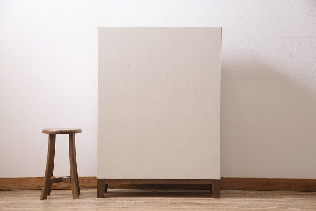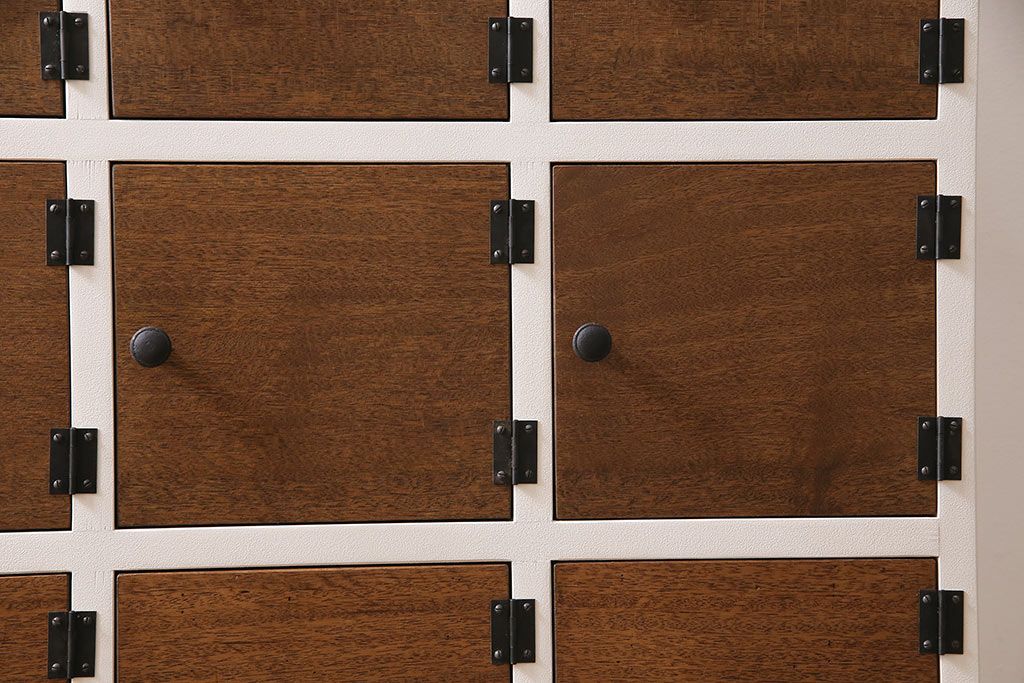 ワードローブ・ロッカー > 扉付きマス目棚を新規製作!本体はヒノキ無垢材、前板は古材を使用。木製脚を取り付け。アンティークホワイトのペイント仕上げ。(収納棚、戸棚、キャビネット、ロッカー)