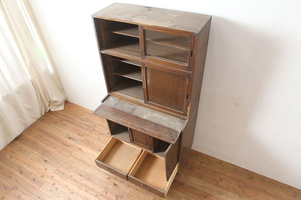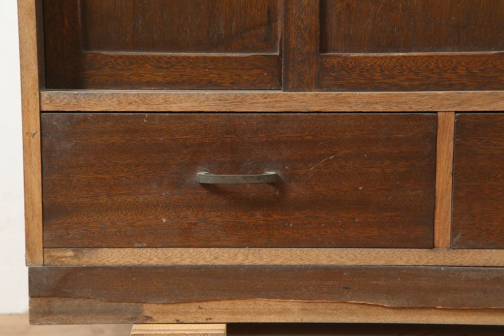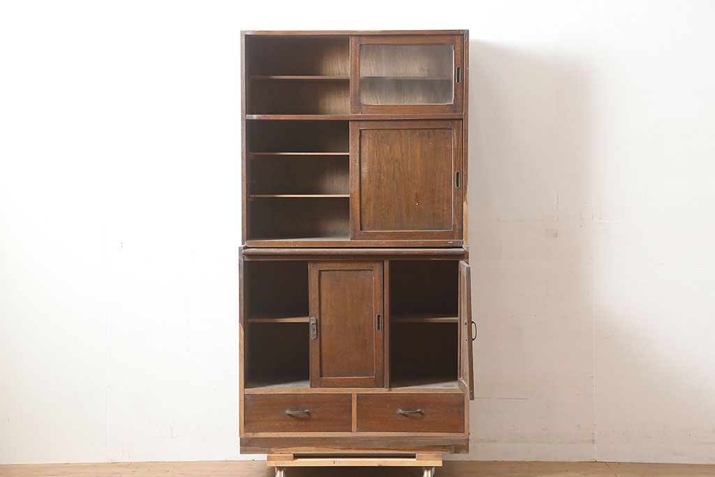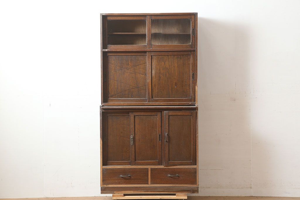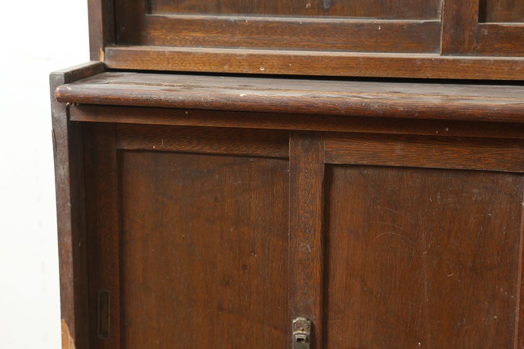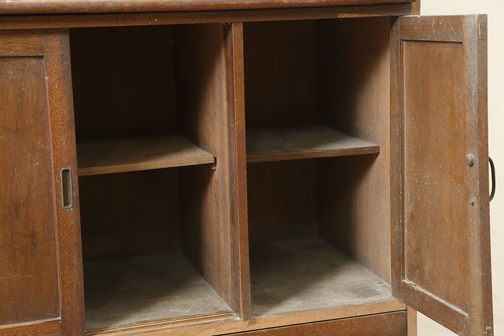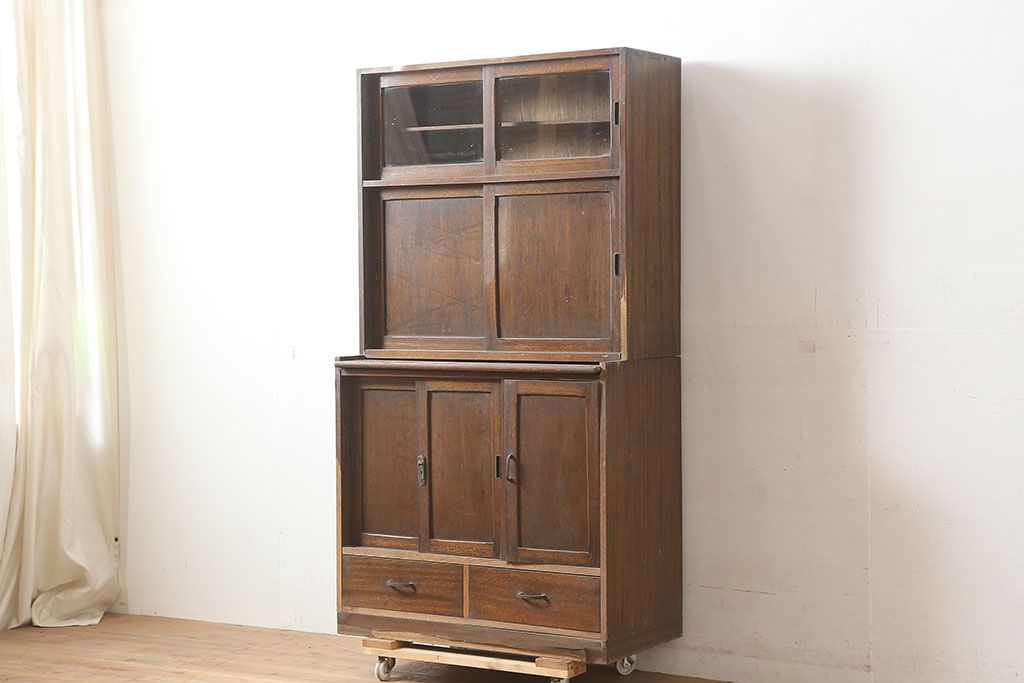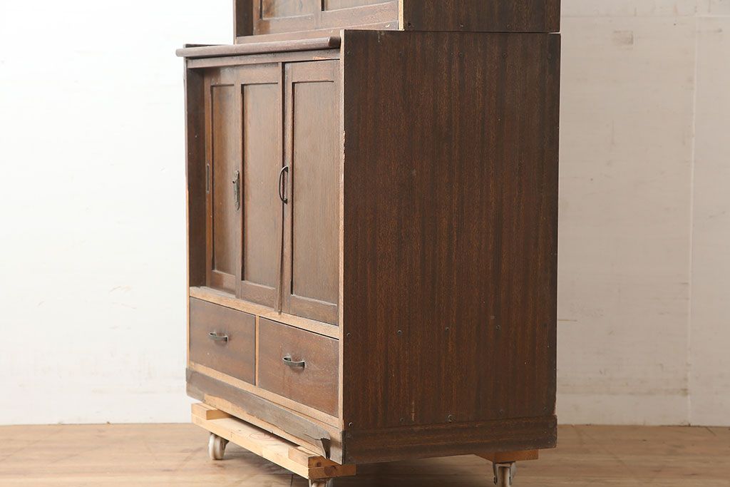 和製アンティーク 昭和中期 ワラン材 作業台付き たっぷり収納できる昭和レトロな木製食器棚(カップボード、収納棚、戸棚)(R-039888)です。