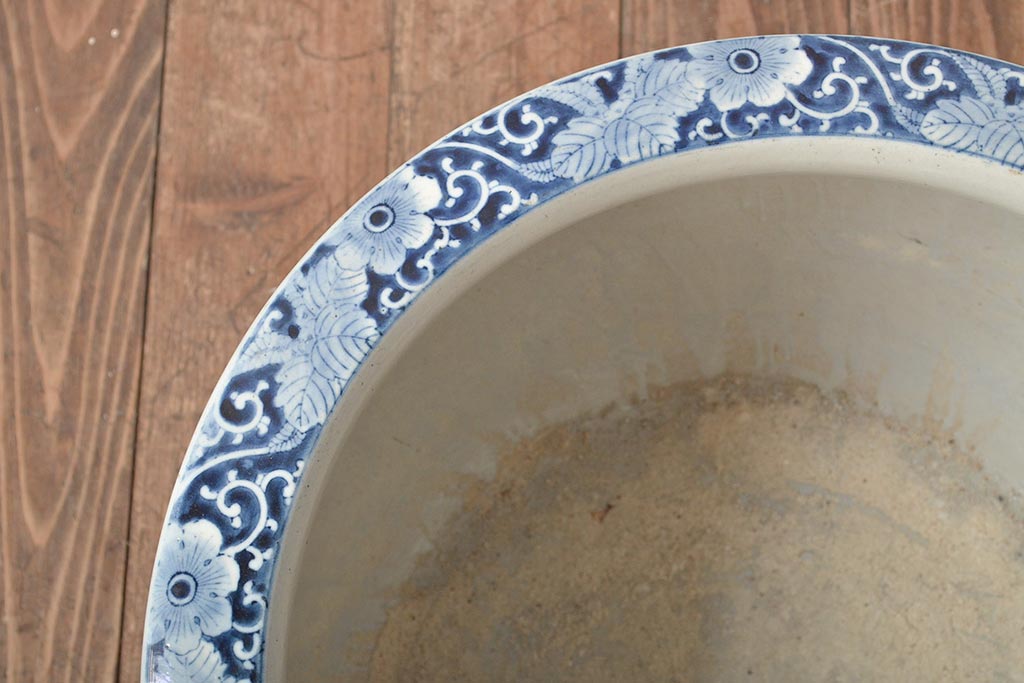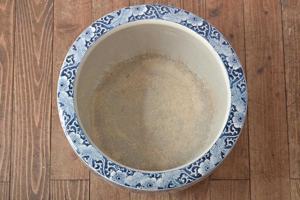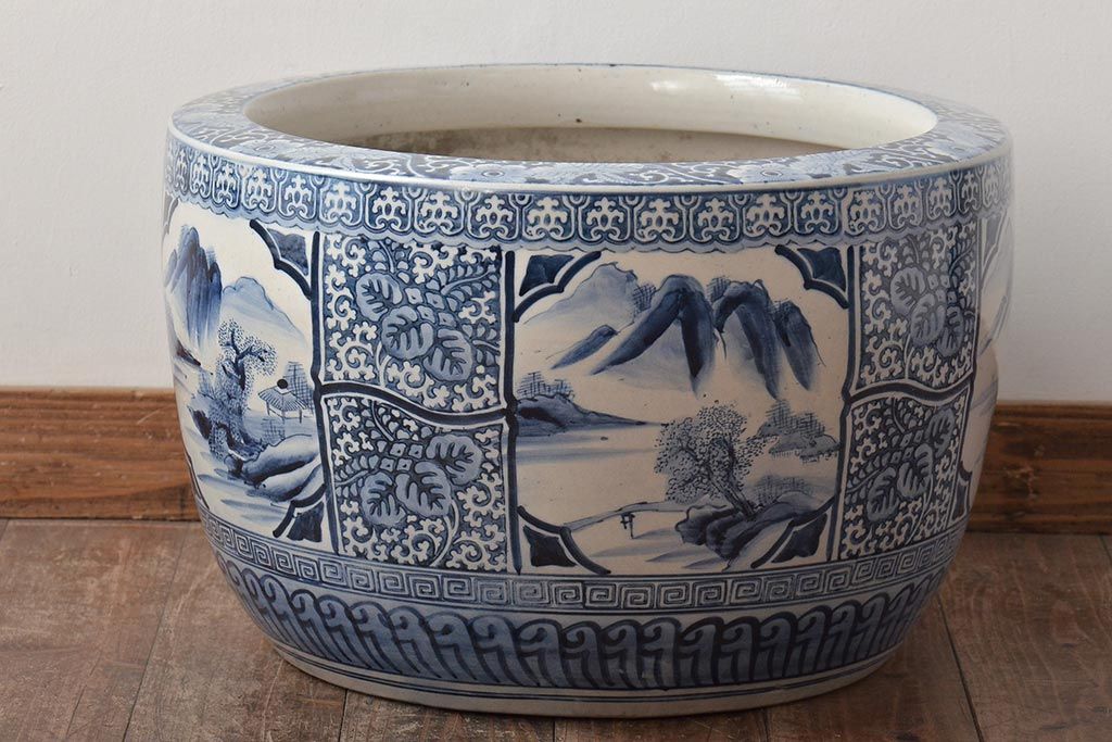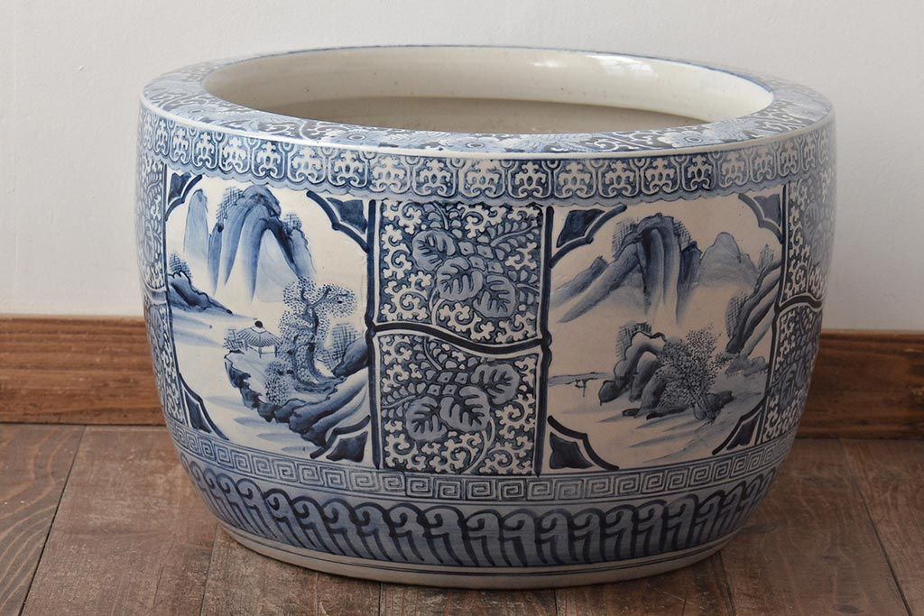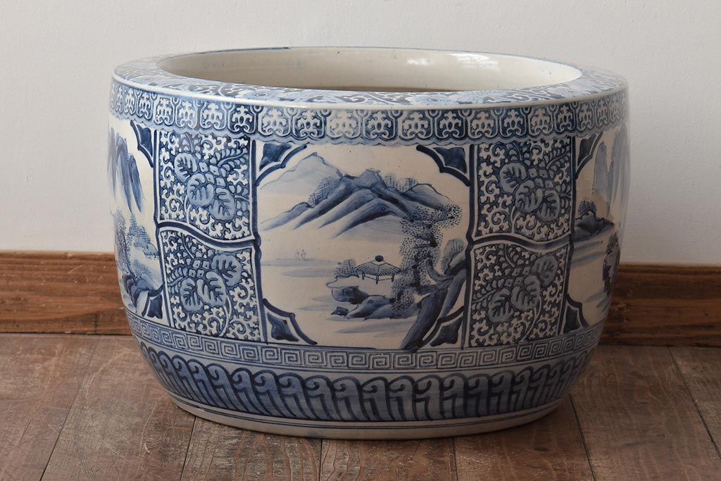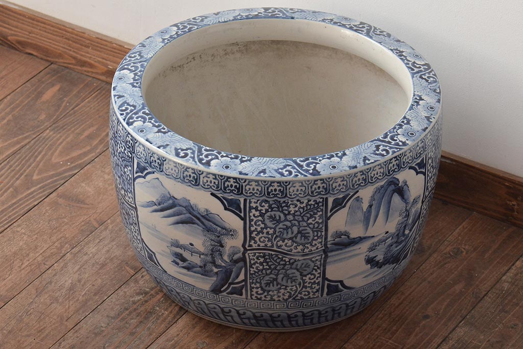 火鉢> 瀬戸火鉢 > 大正〜昭和初期 山水・五三桐図 染付 瀬戸火鉢(鉢カバー、傘立て)(R-046418)