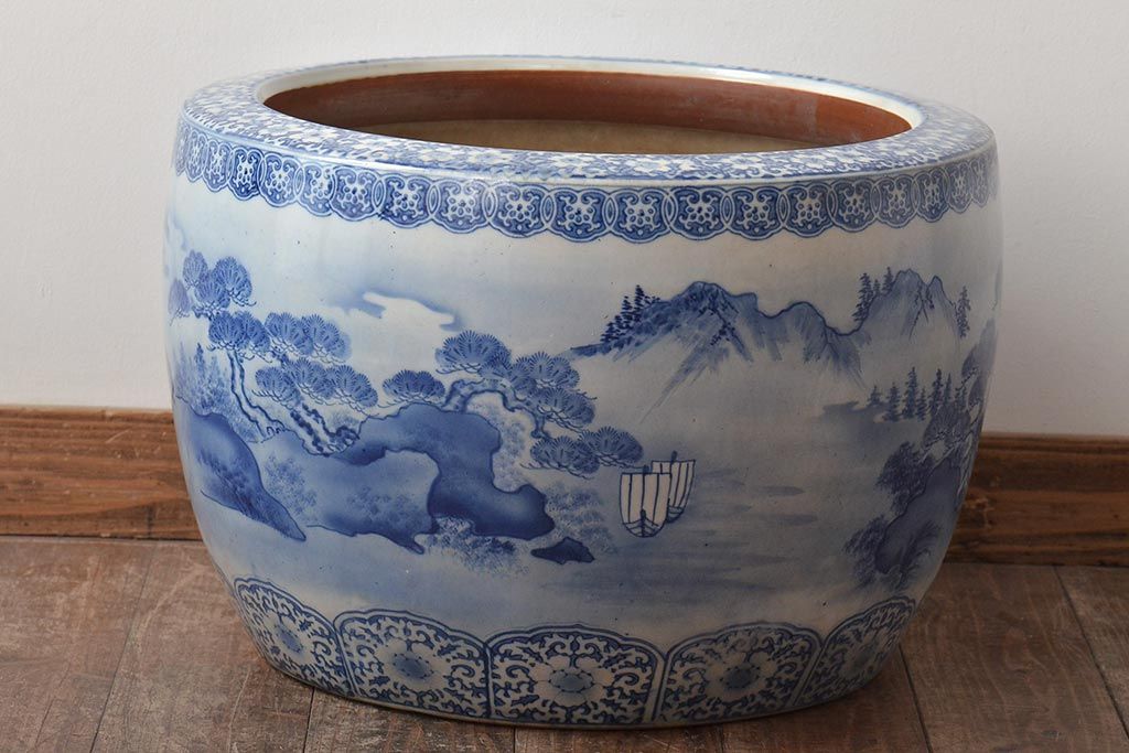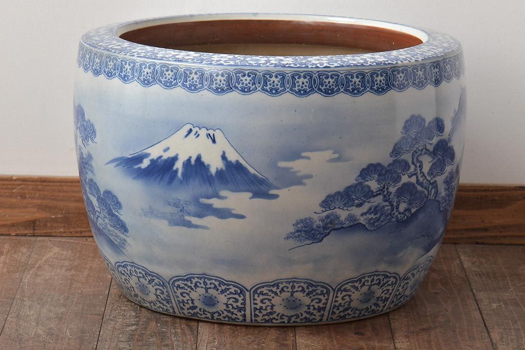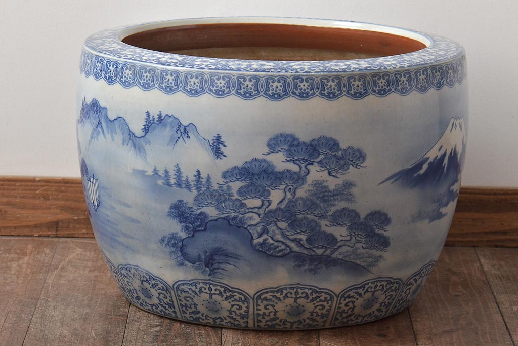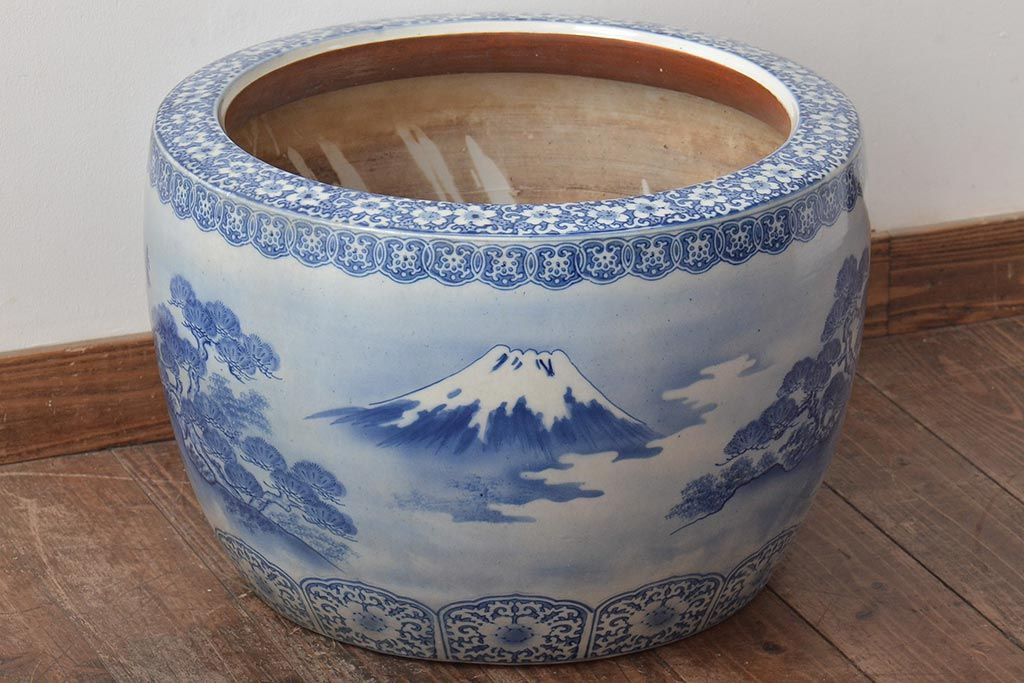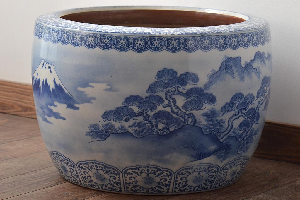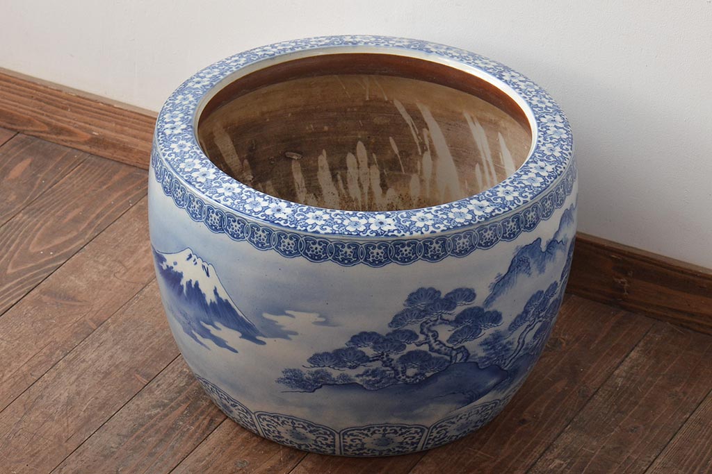 火鉢> 瀬戸火鉢 > 大正〜昭和初期 富士山・松・山水・桜の図 染付 瀬戸火鉢(鉢カバー、傘立て)(R-046419)