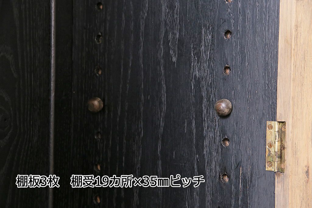 棚板は取り外しできます。棚板は3枚あります。棚受けは19ヶ所、35mmピッチで調整できます。棚幅サイズのものが1枚の作りです。