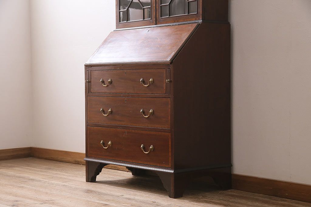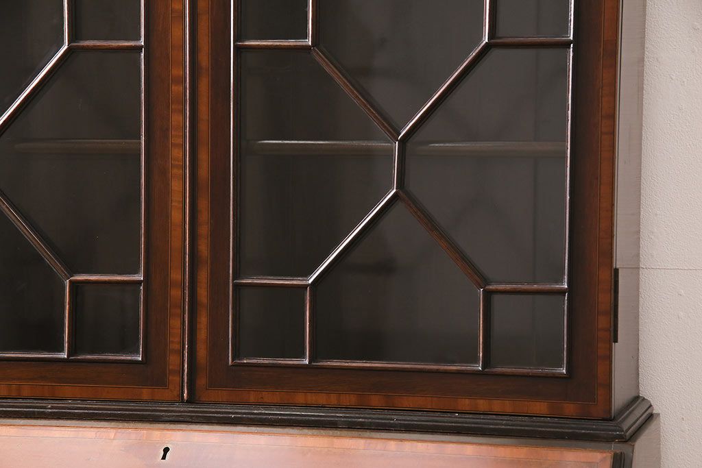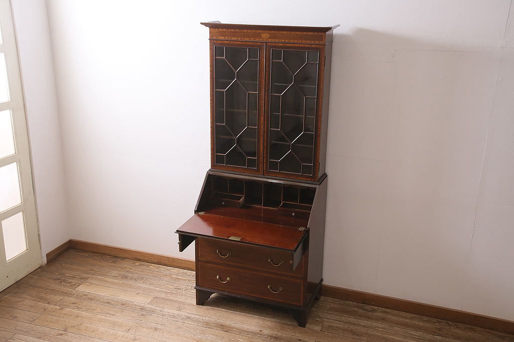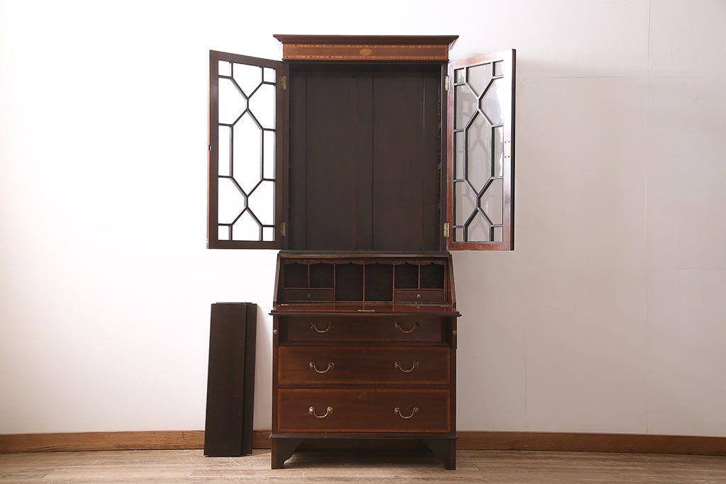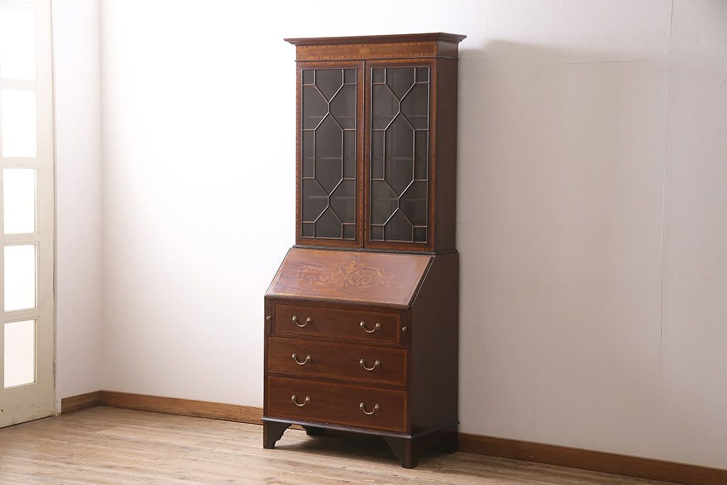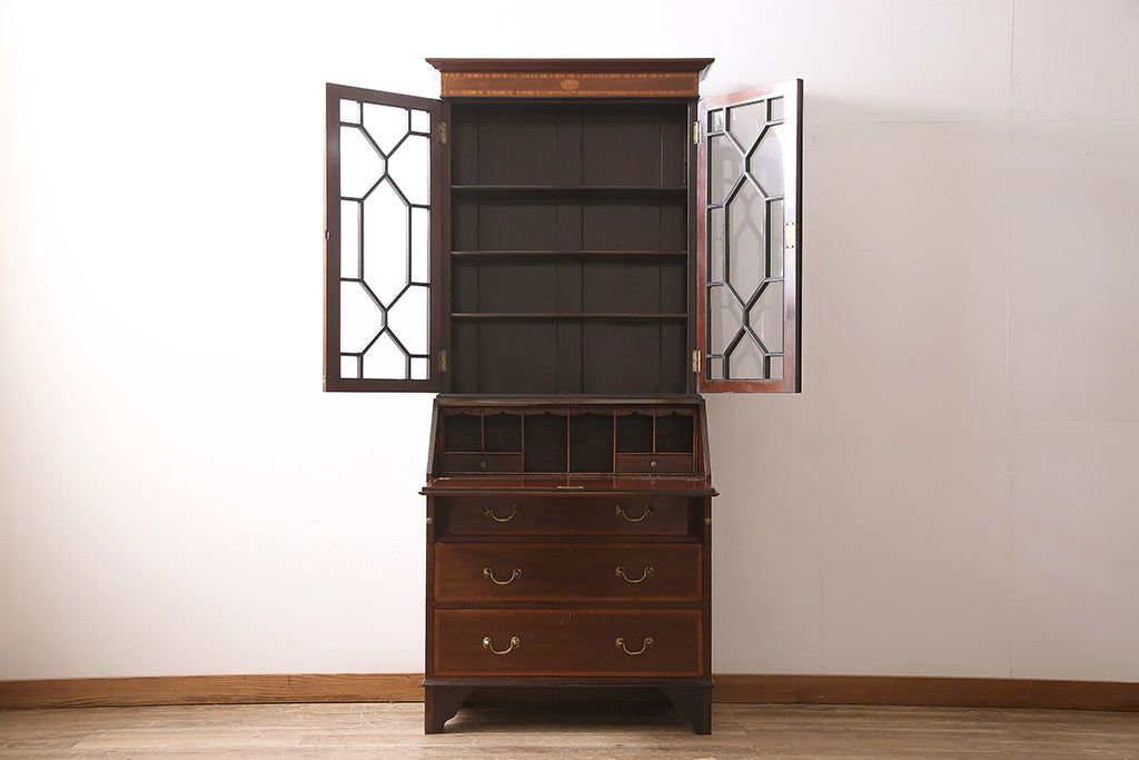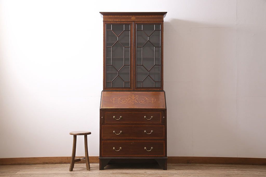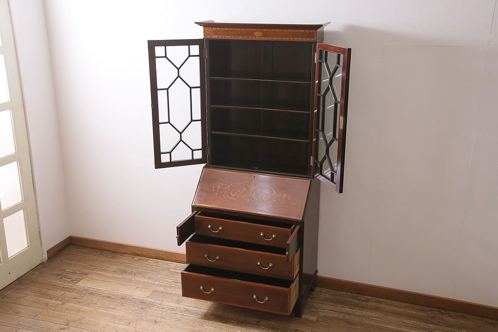 アンティーク家具 イギリス マホガニー材 象嵌入り 上品な佇まいのライティングビューロー(ビューローブックケース、簿記机、在宅ワーク、在宅用収納棚、本箱、ワークデスク)(R-046439)
