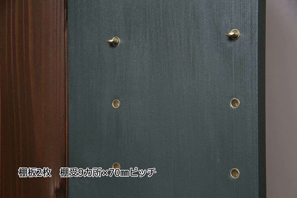 上段のみ棚板は取り外しできます。棚板は2枚あります。棚受けは9ヶ所、70mmピッチで調整できます。棚幅サイズのものが1枚の作りです。
