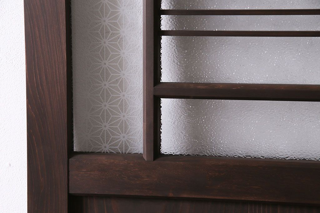 ドア・建具> 引き戸 > 引き戸を新規製作!当店商品を参考にデザイン。麻の葉模様ガラスを組み入れ。表示錠、引き手、戸車を取り付け。(建具)