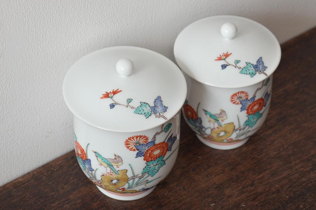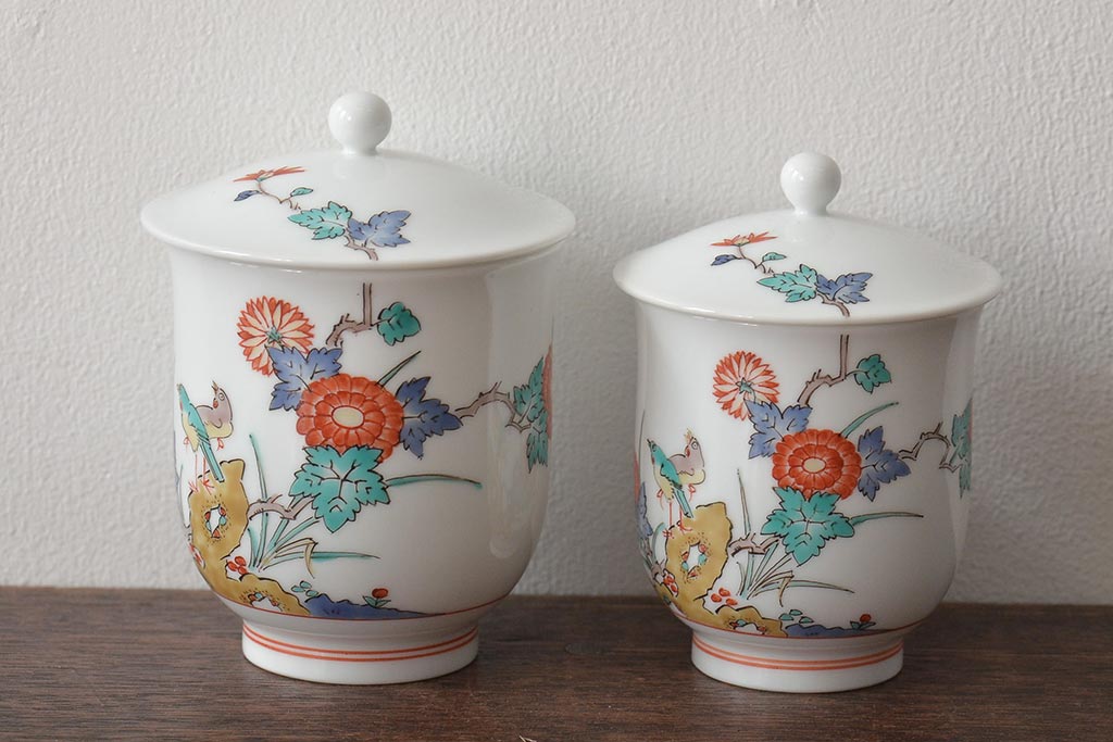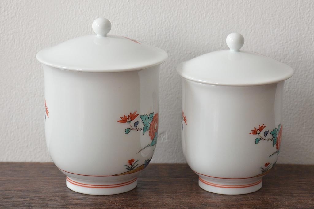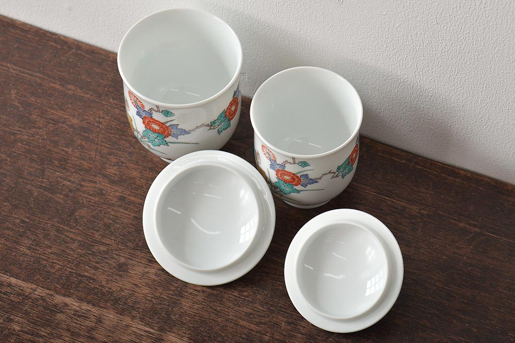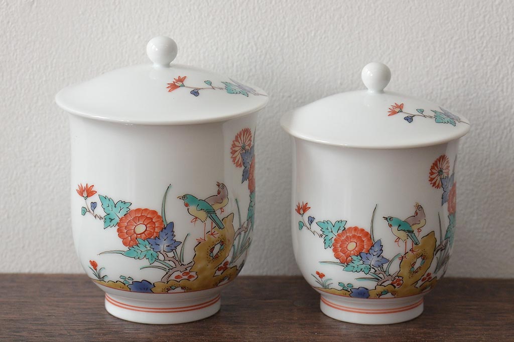 十三代 酒井田柿右衛門 花鳥文湯呑一対(茶碗、和食器、蓋付き)(R-046478)