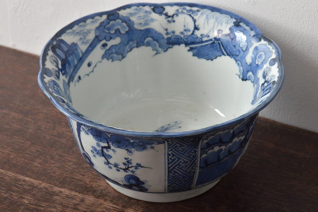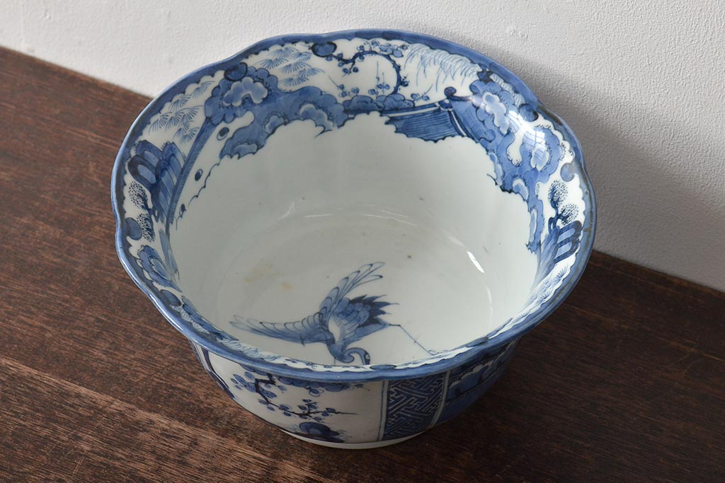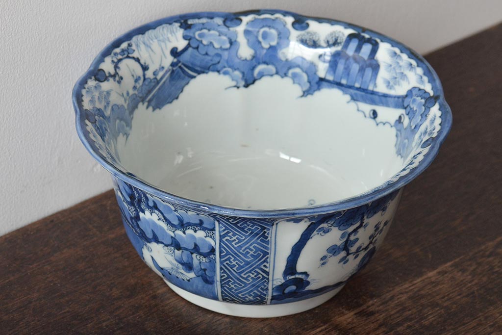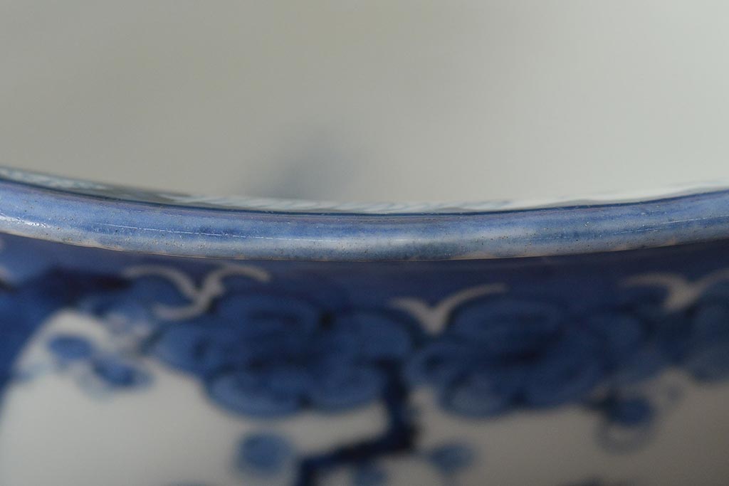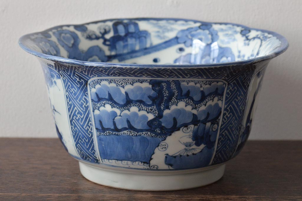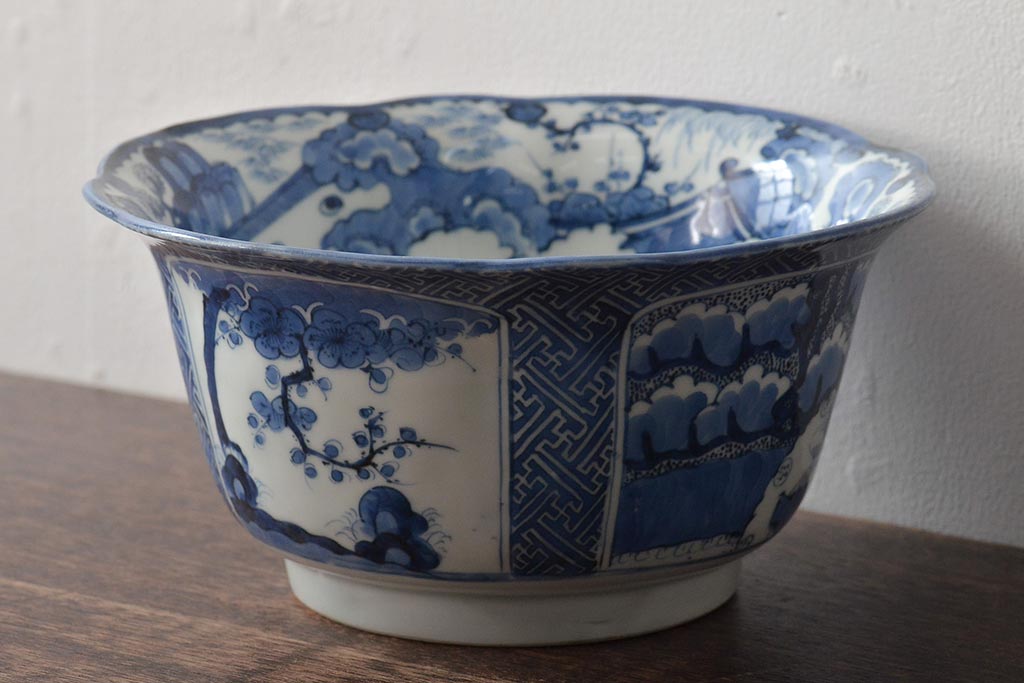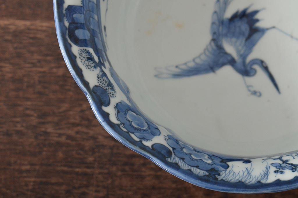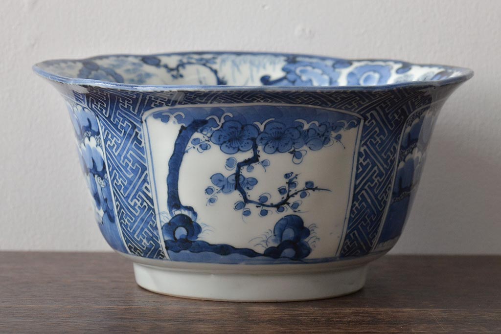 ラフジュ工房> 骨董・美術品> 骨董-陶磁器 > 江戸期 古伊万里 鶴に梅 窓絵染付深鉢(深皿、和食器)(R-046482)