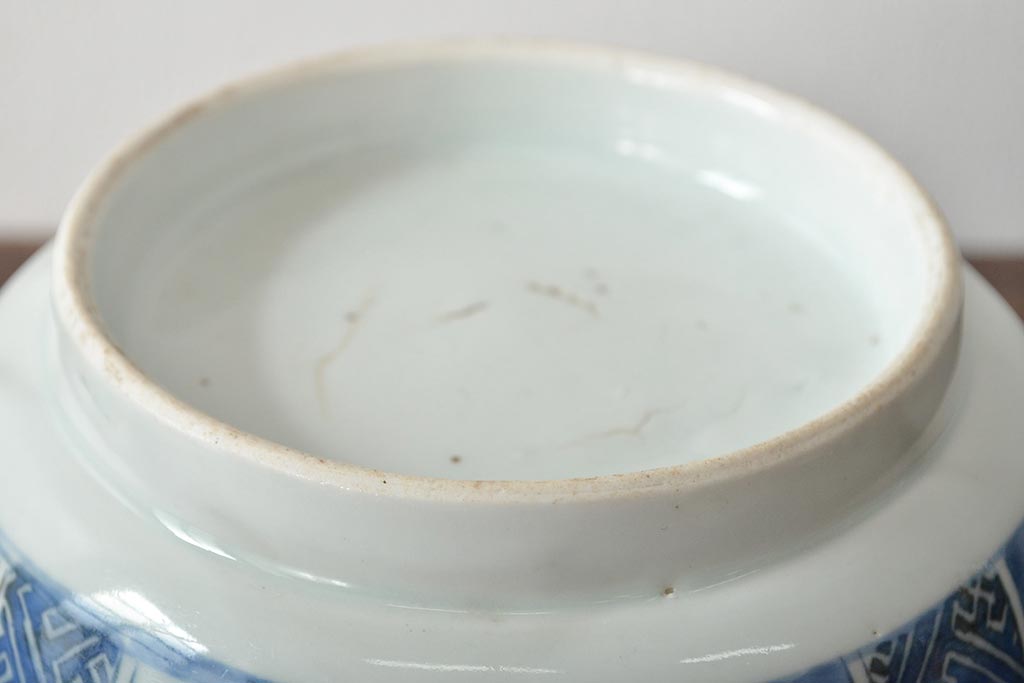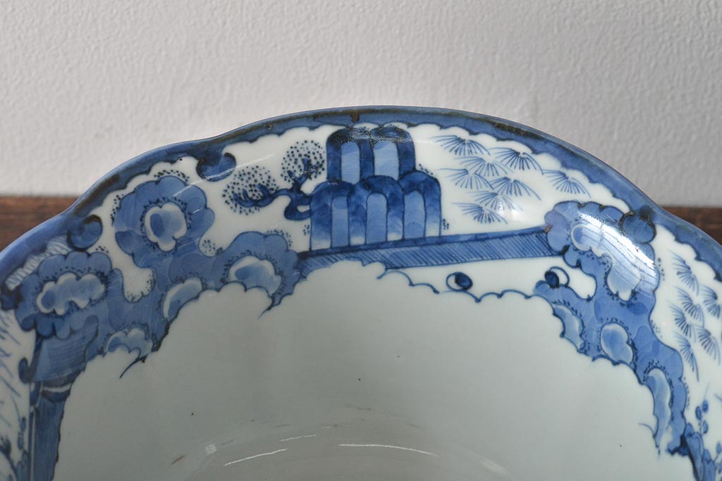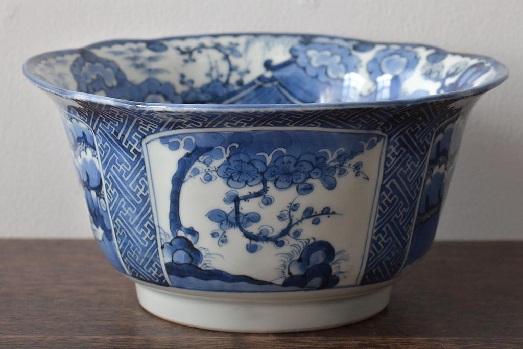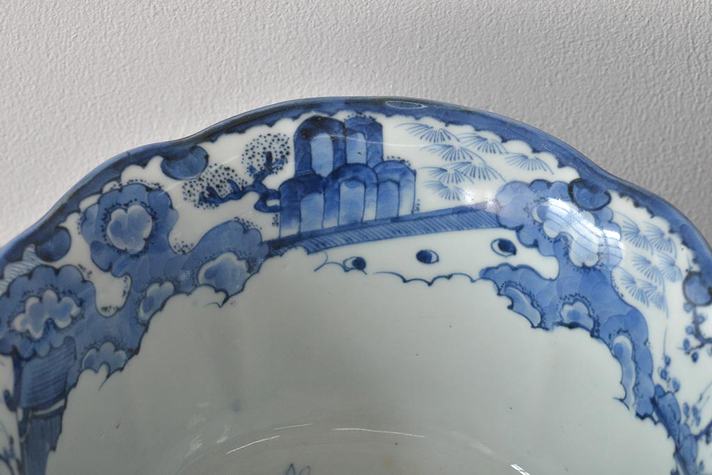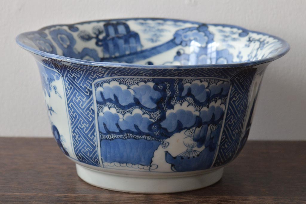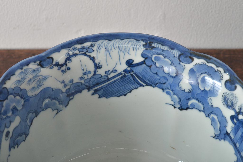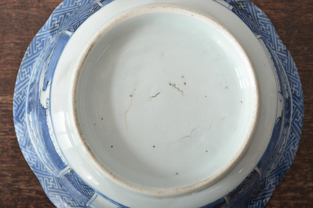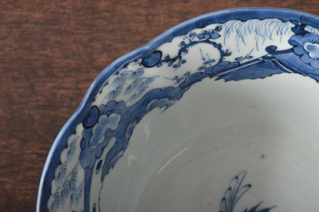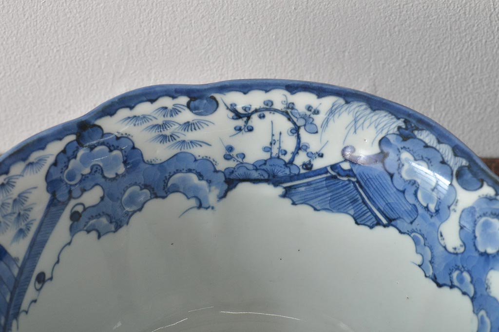 ラフジュ工房> 骨董・美術品> 骨董-陶磁器 > 江戸期 古伊万里 鶴に梅 窓絵染付深鉢(深皿、和食器)(R-046482)