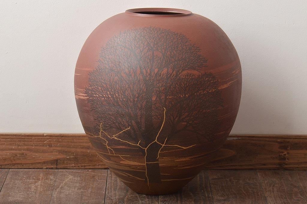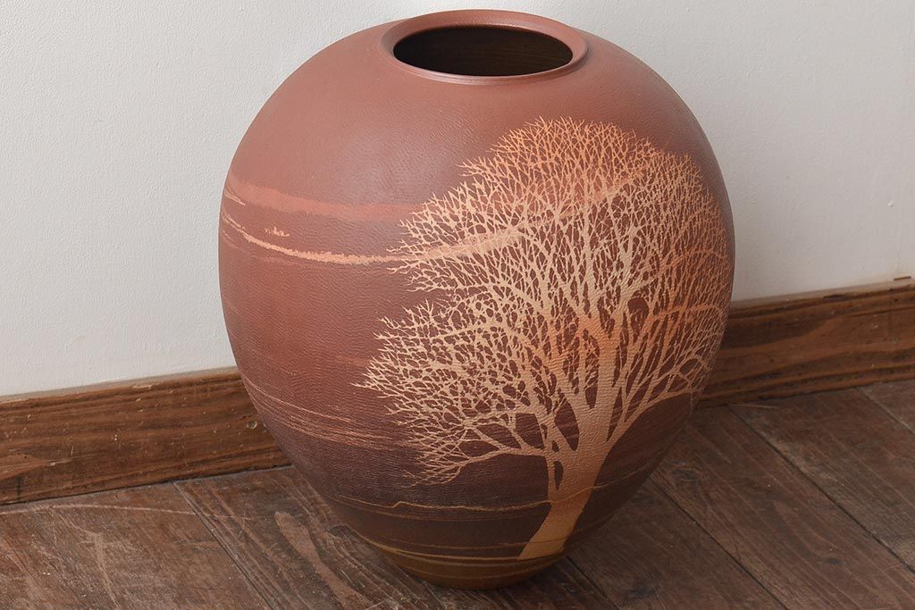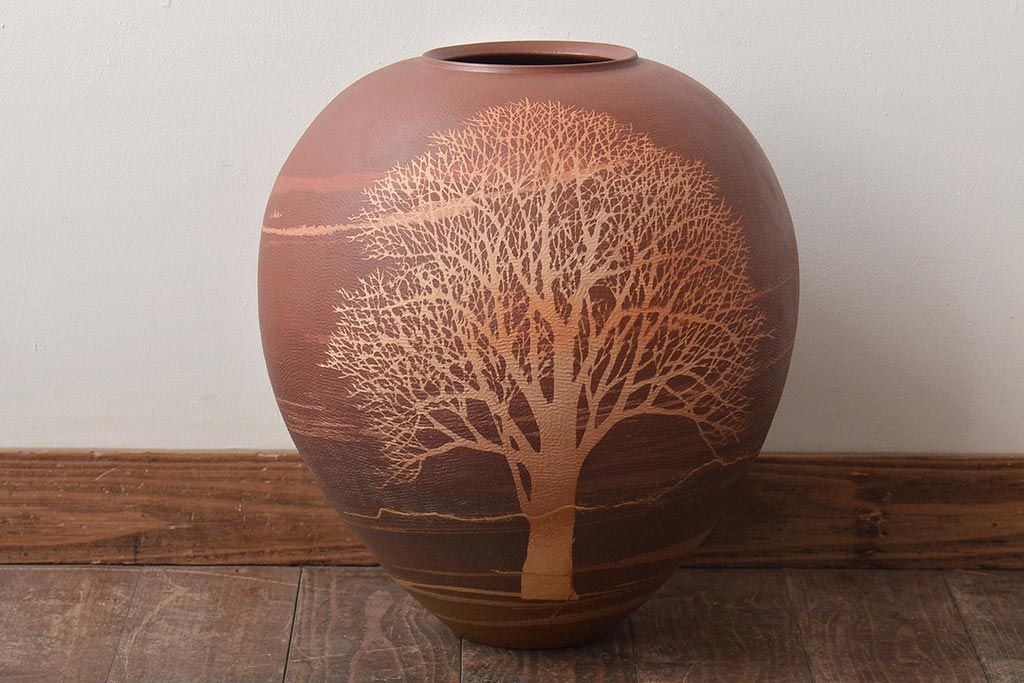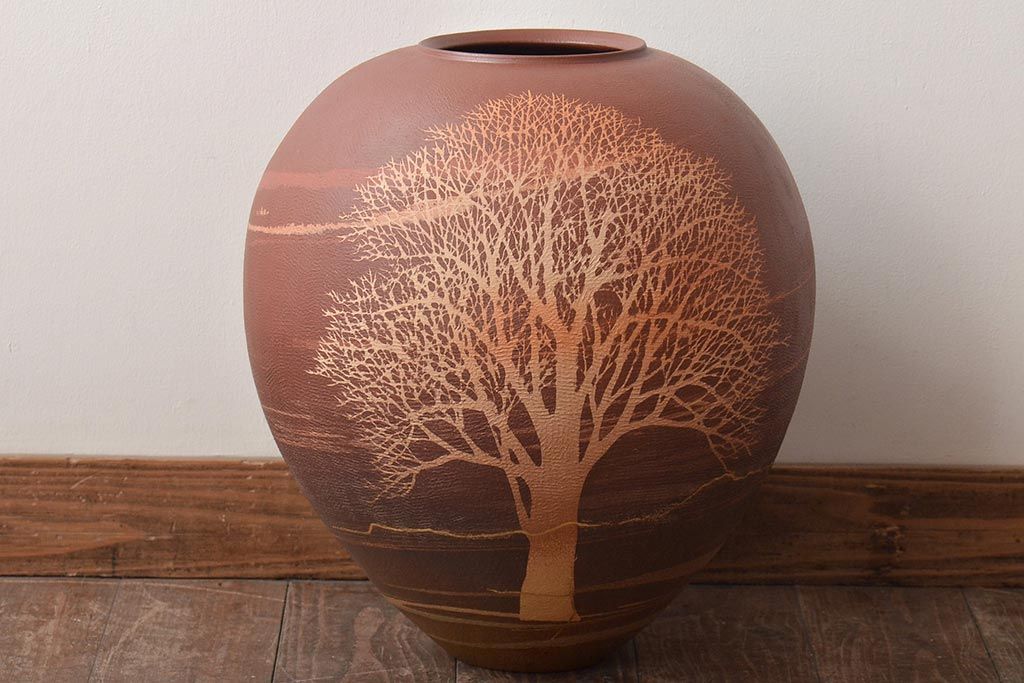 1986年 佐伯守美作 練上象嵌 樹木文壷(益子焼、花瓶、花器)(R-046484)