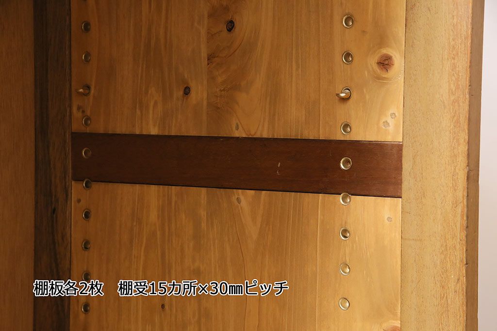 棚板は取り外しできます。棚板は各2枚あります。棚受けは15ヶ所、30mmピッチで調整できます。棚幅サイズのものが1枚の作りです。