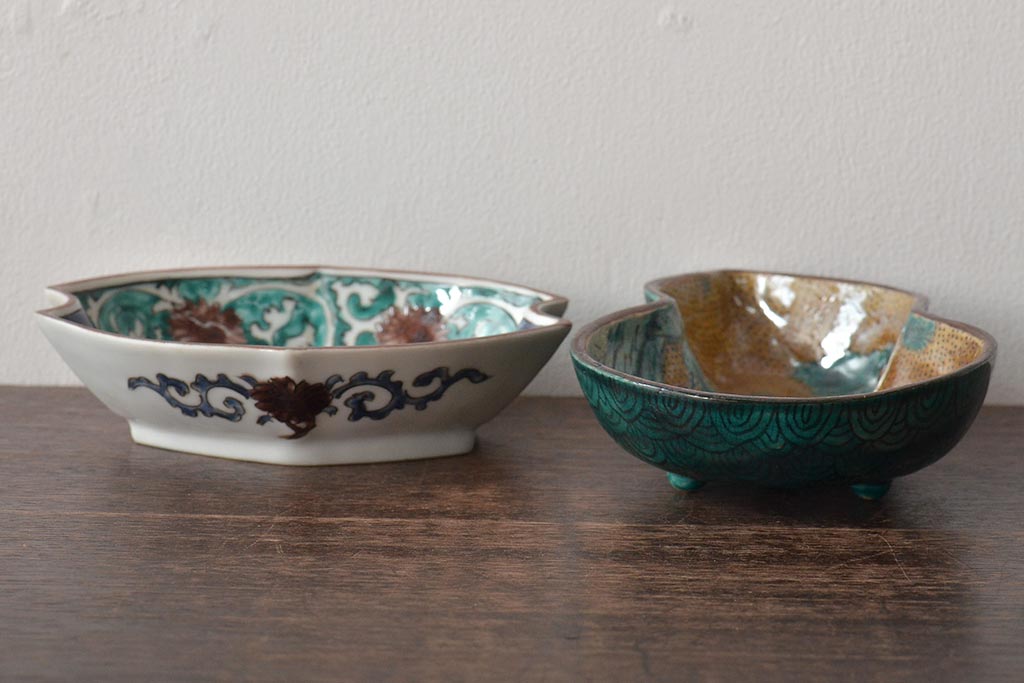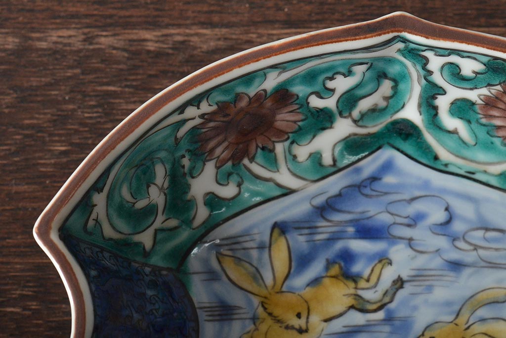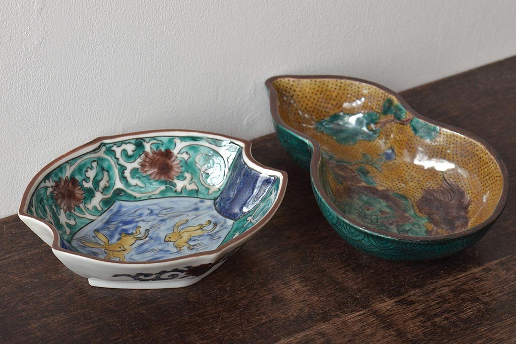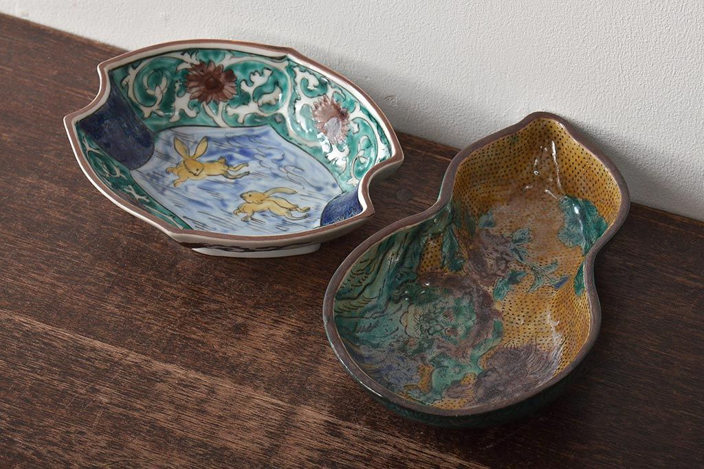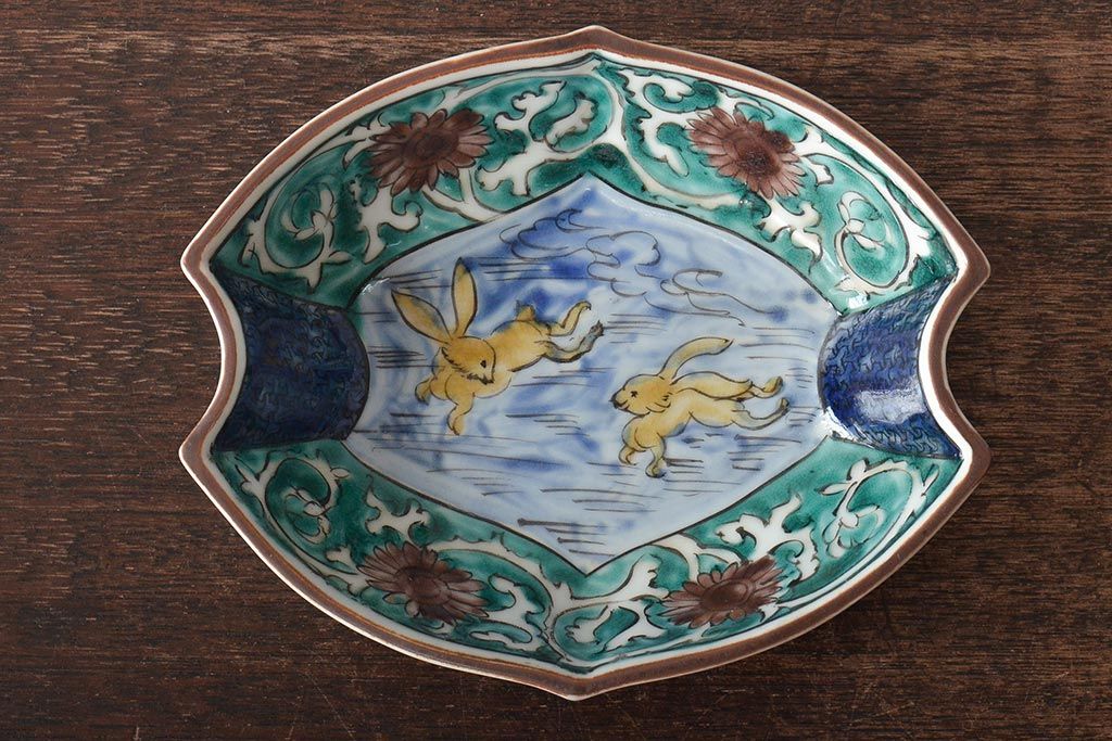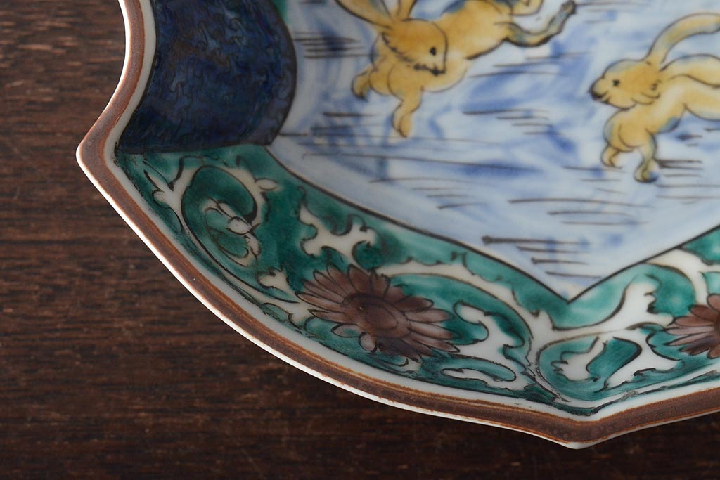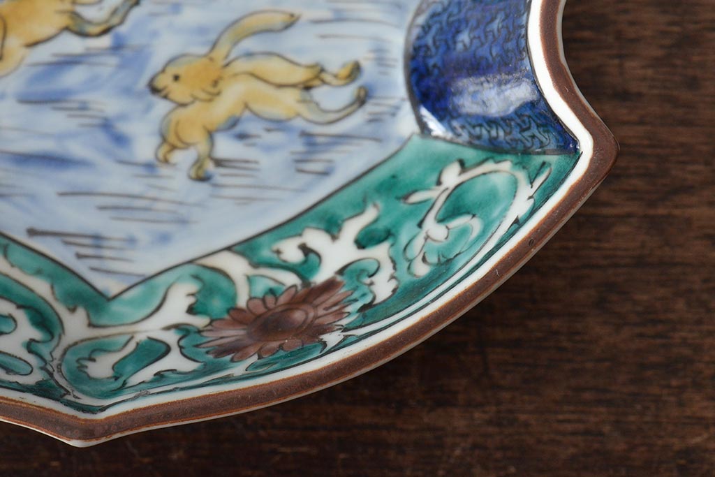 江戸〜明治 九谷焼 変形皿2枚(兎、獅子、角福、青手)(R-046518)