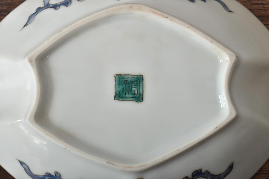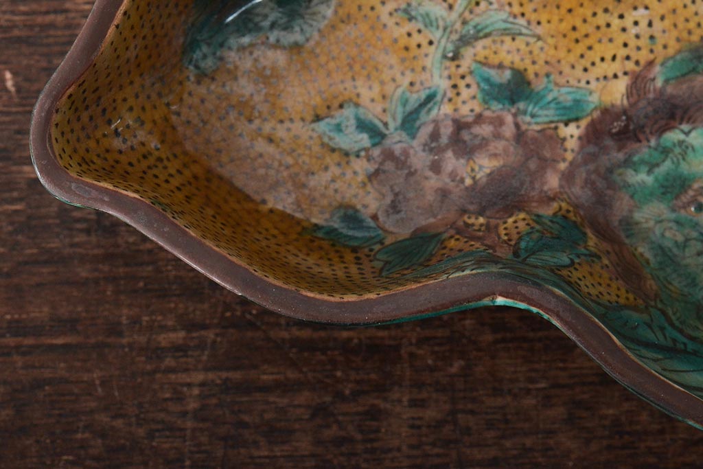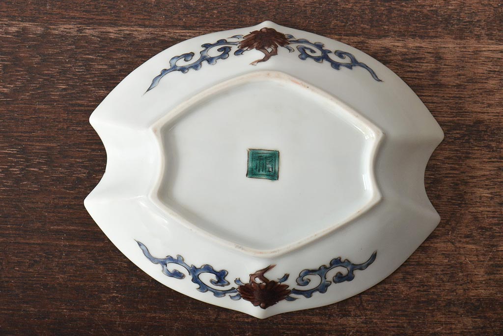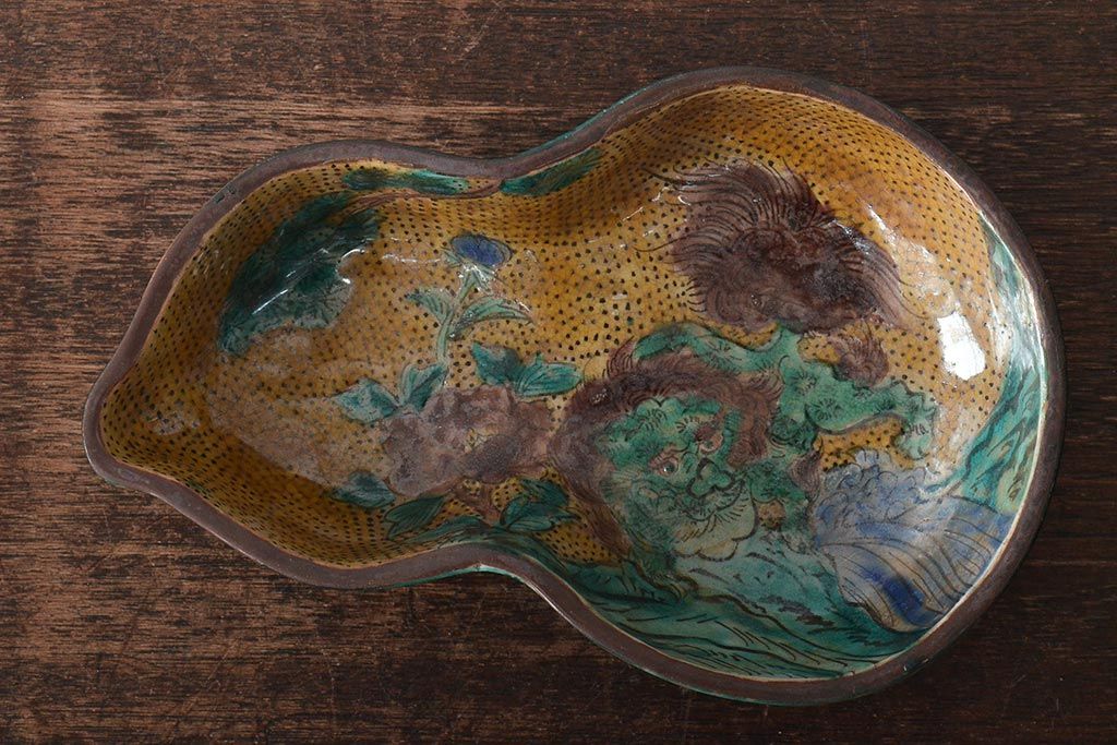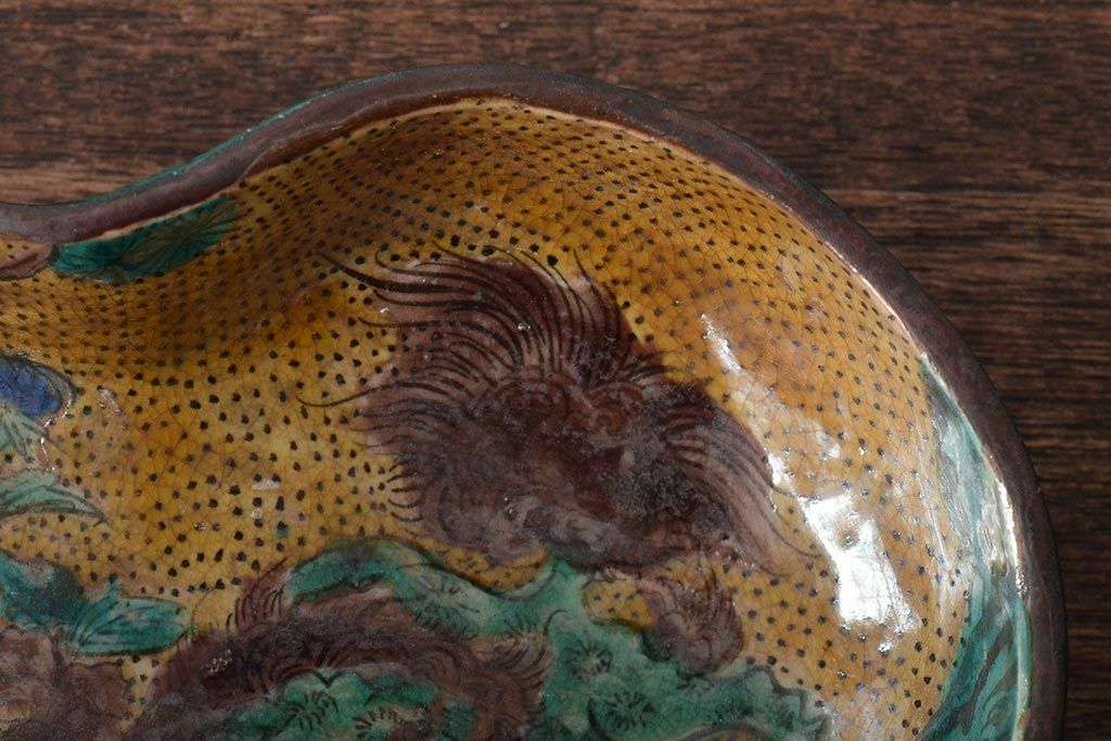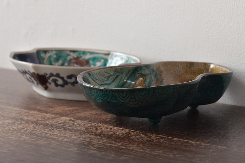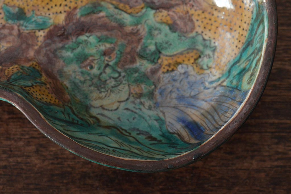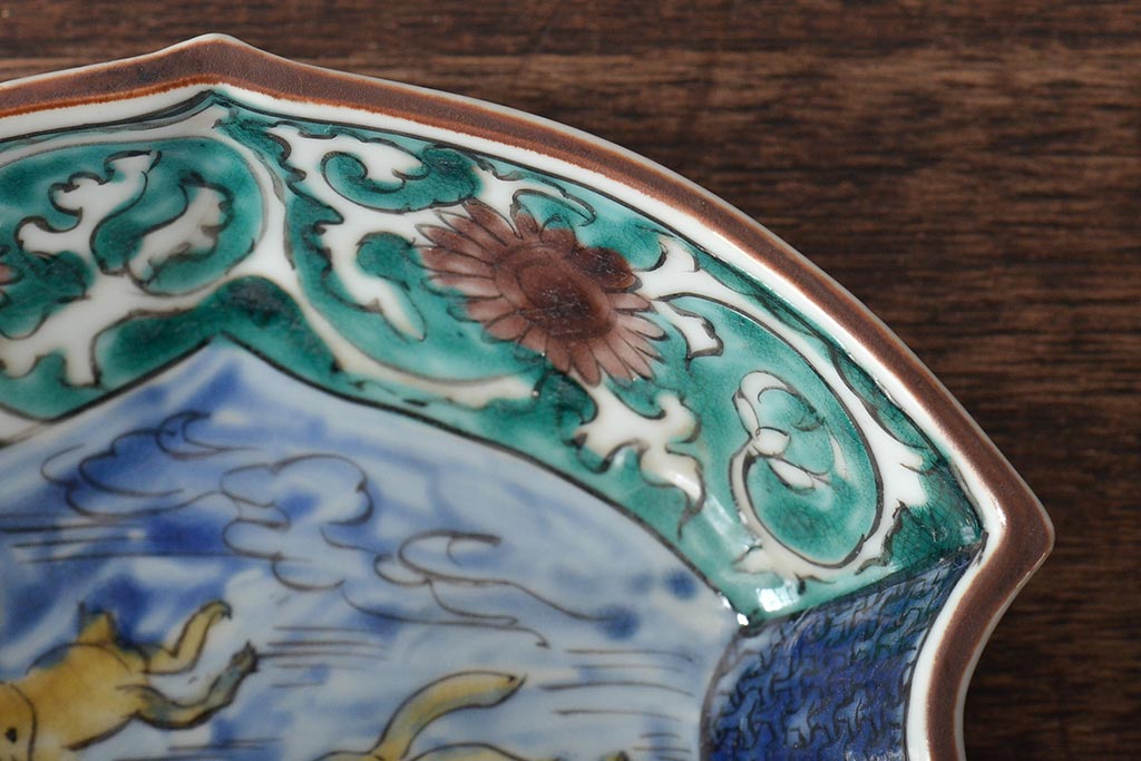 江戸〜明治 九谷焼 変形皿2枚(兎、獅子、角福、青手)(R-046518)