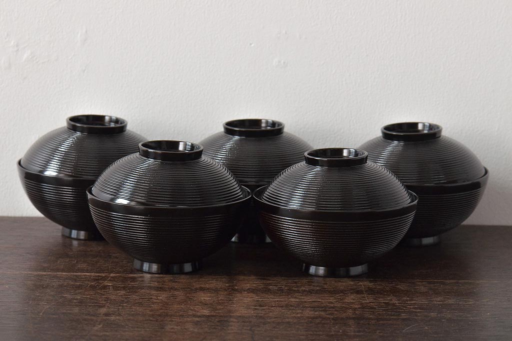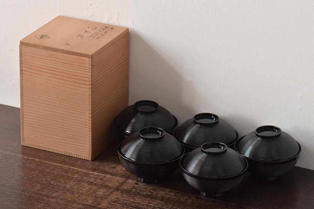 ラフジュ工房> 骨董・美術品> 骨董-漆器 > 初瀬川柳庵 糸目黒塗 切箔絵 木製 吸物椀5客(漆器)(R-046644)