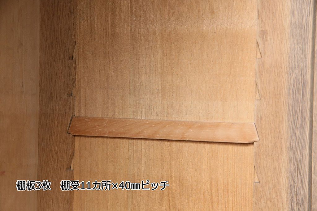 棚板は取り外しできます。棚板は3枚あります。棚受けは11ヶ所、40mmピッチで調整できます。棚幅サイズのものが1枚の作りです。