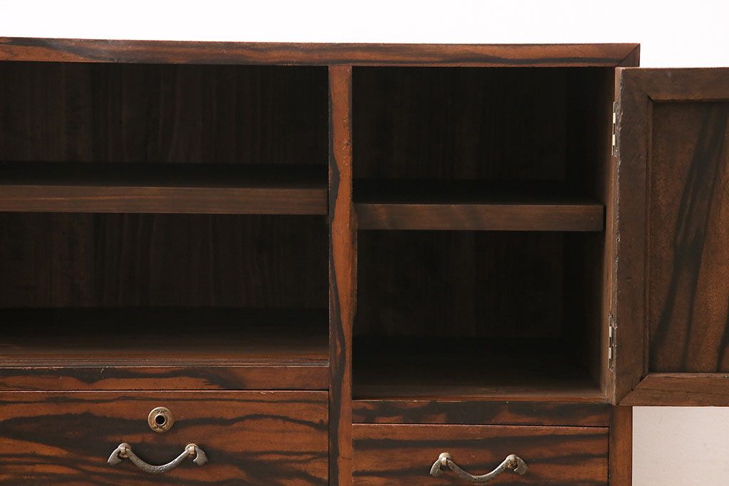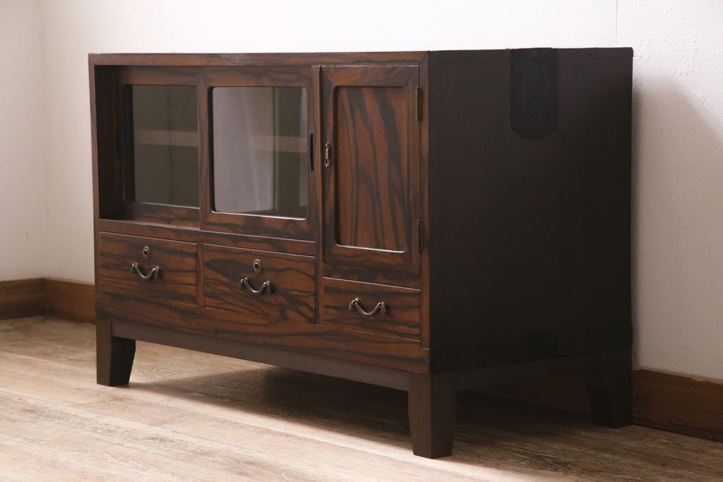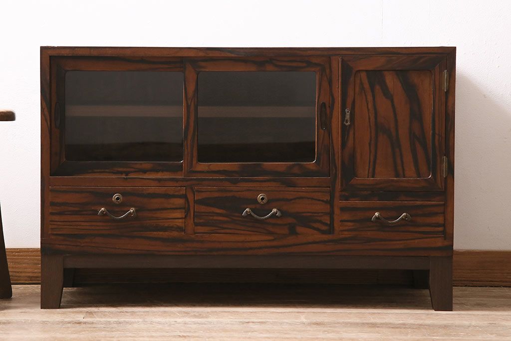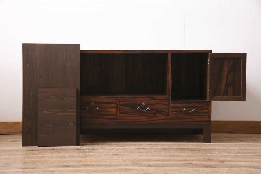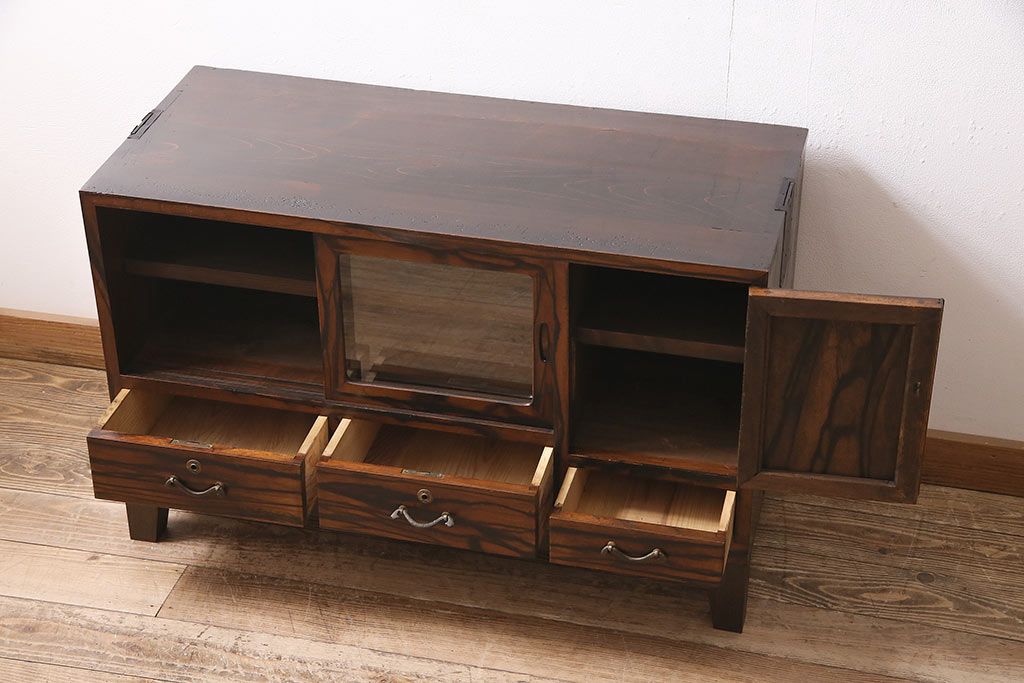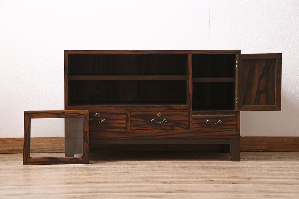 ビンテージ家具 前面黒柿材 引き出し付き 和風リビングにおすすめな脚付きローボード(戸棚、リビングボード)(R-046691)