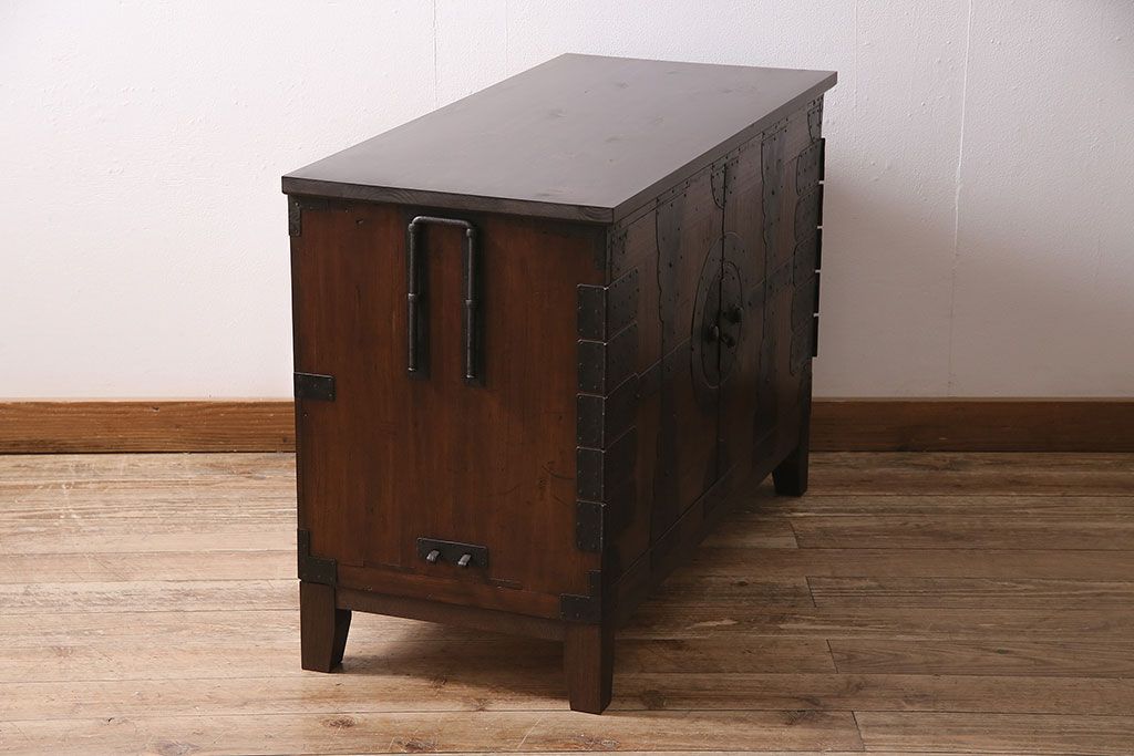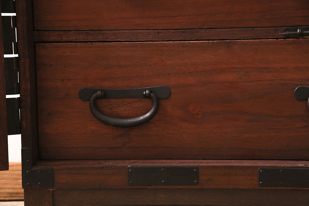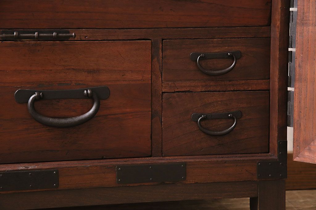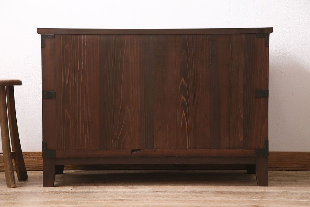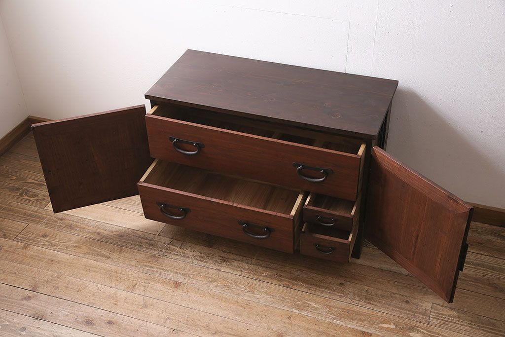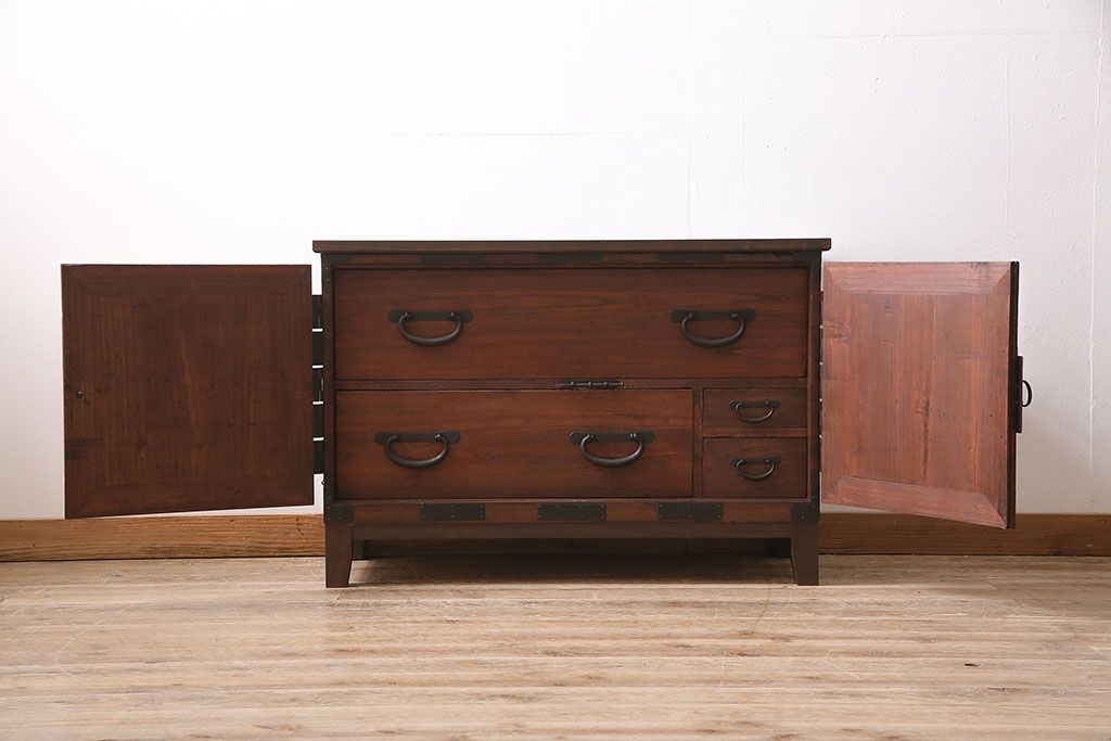 和箪笥> 衣装箪笥 > 和製アンティーク 前面桐材 和モダンスタイルにおすすめな観音開き戸の脚付き箪笥ローボード(テレビ台、リビングボード)(R-046506)