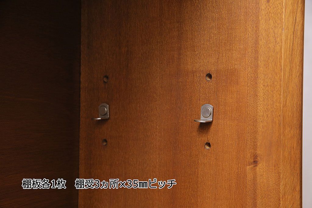 棚板は取り外しできます。棚板は上下各1枚あります。棚受けは3ヶ所、35mmピッチで調整できます。棚幅サイズのものが1枚の作りです。