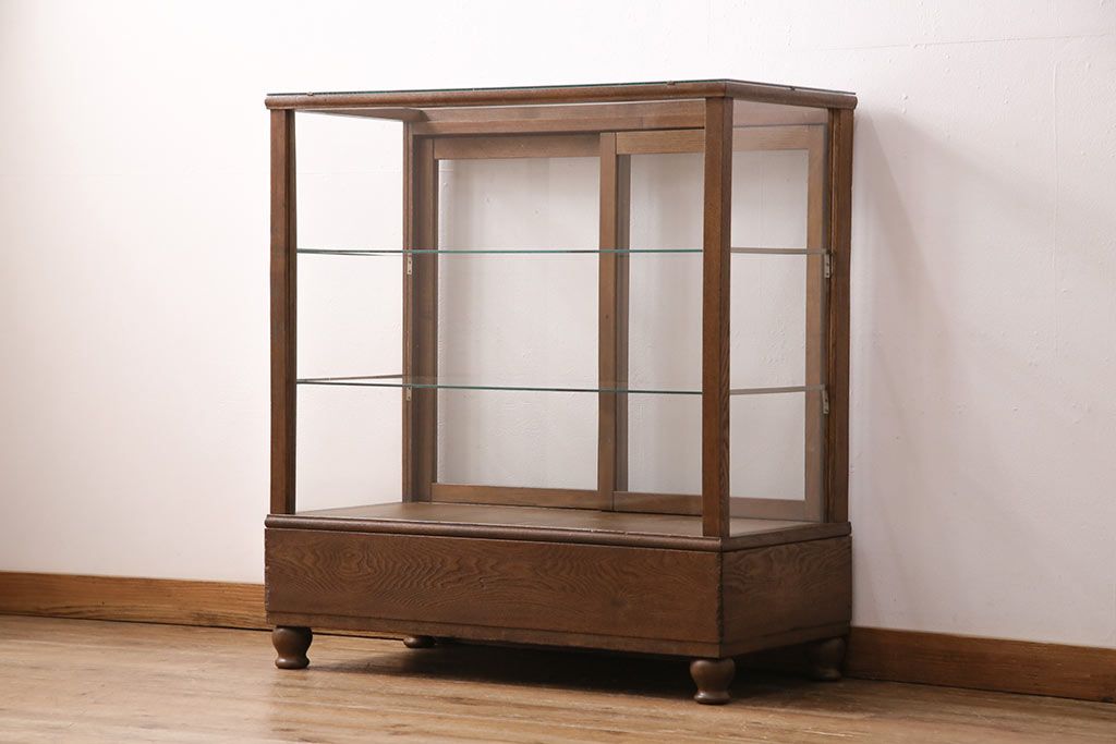 アンティーク家具 昭和中期 ナラ材 ころんとした脚が可愛いレトロなガラスケース(ショーケース、陳列棚)(R-046605)