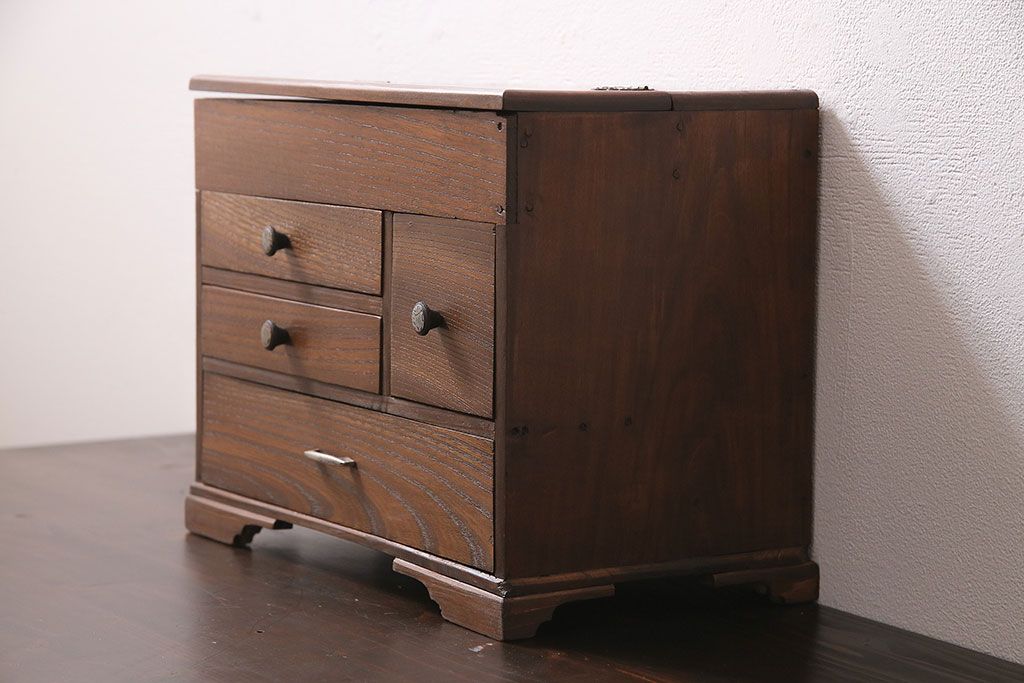 小物収納・トランク> 裁縫箱・ソーイングボックス > アンティーク雑貨 昭和初期 ケヤキ材 ノスタルジックな雰囲気が魅力の裁縫箱(ソーイングボックス、小引き出し、小物収納、針箱)(R-046882)