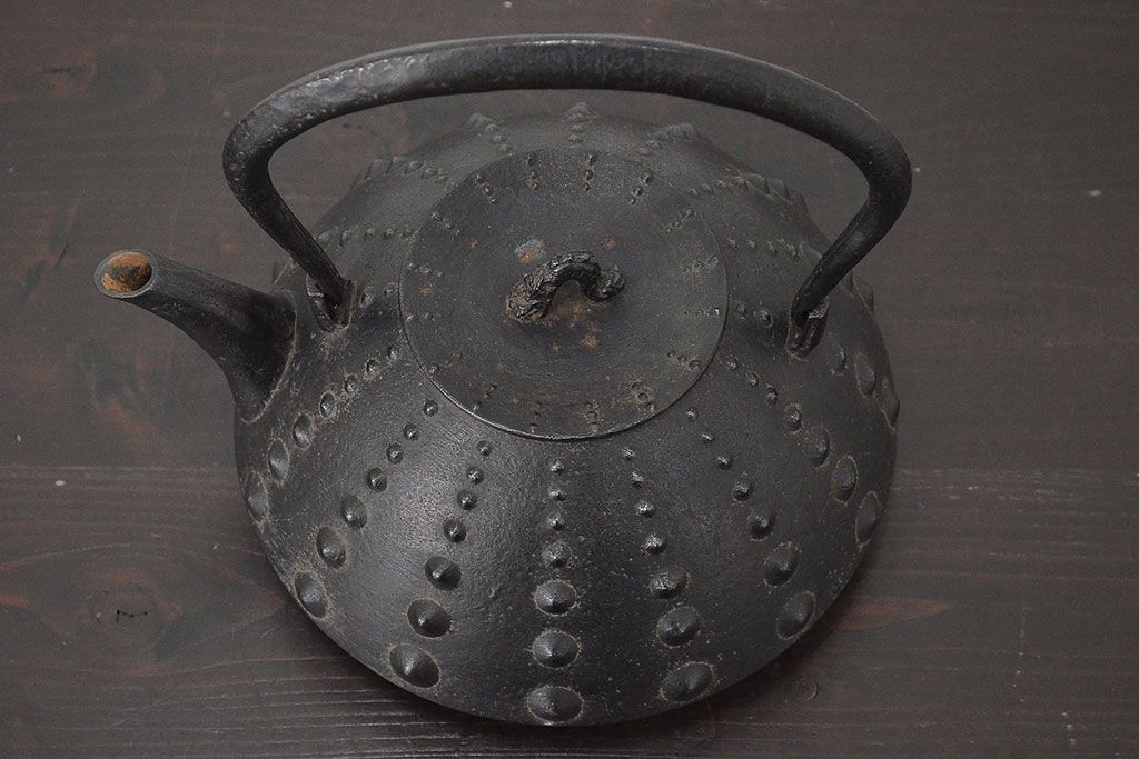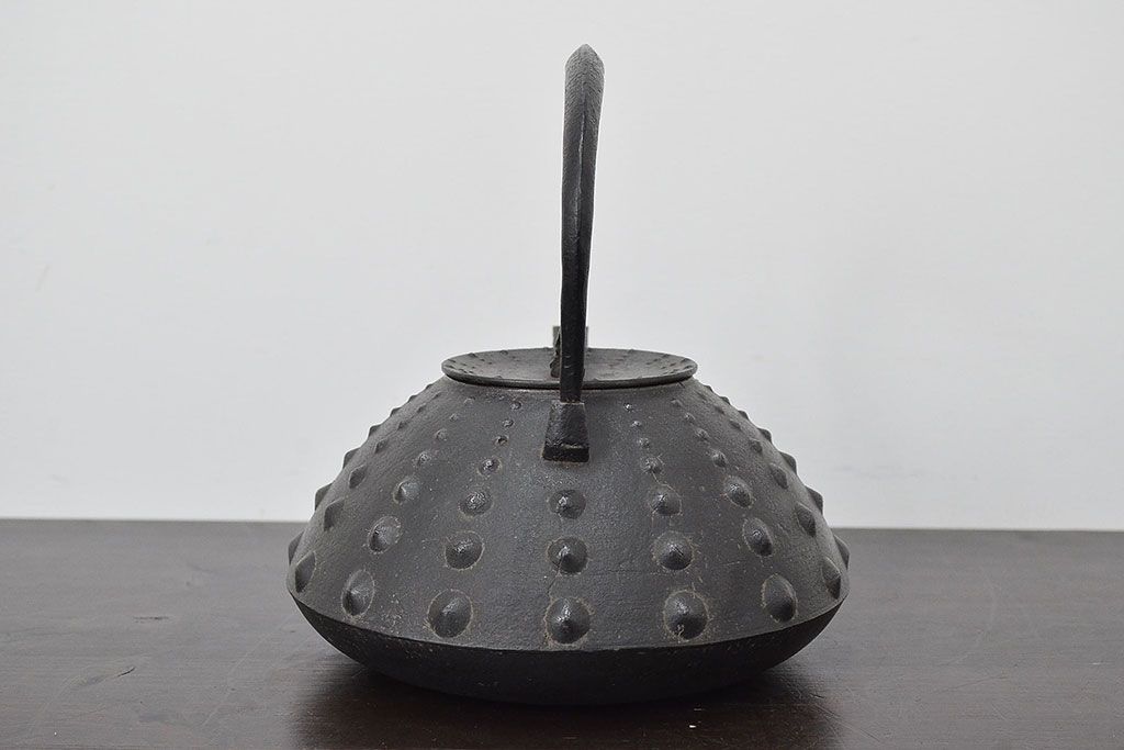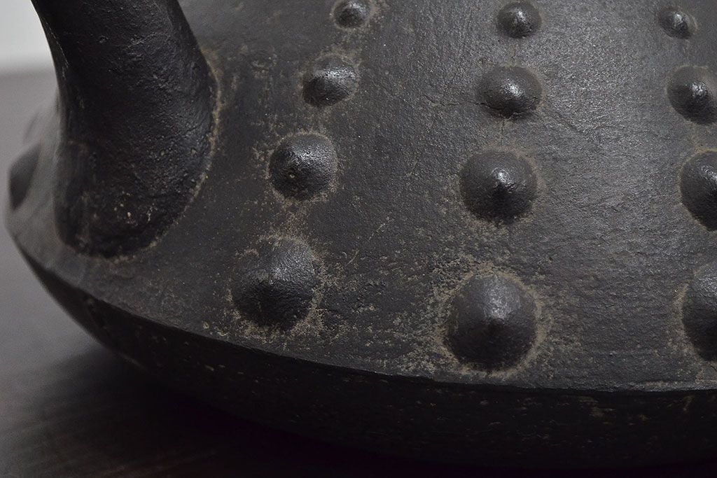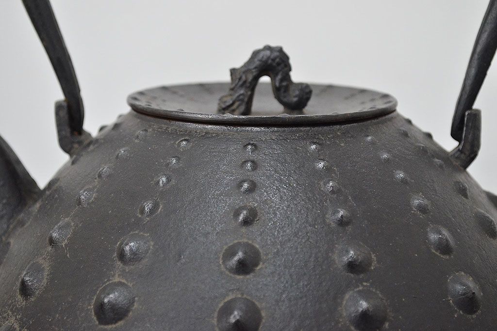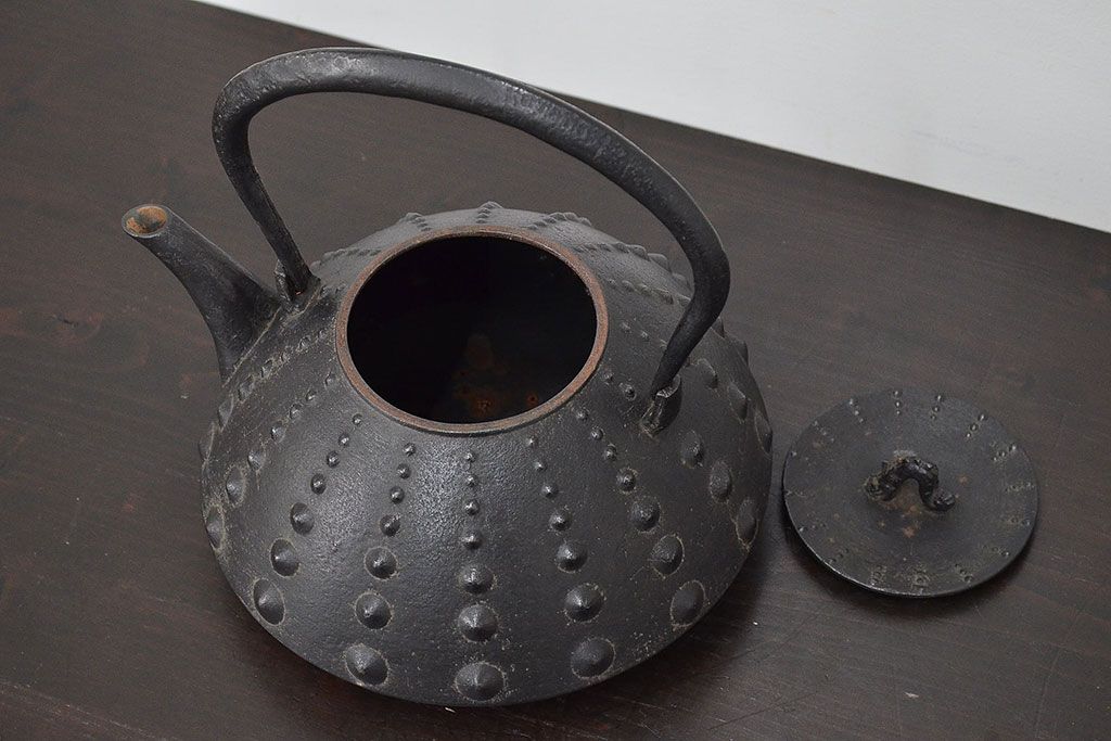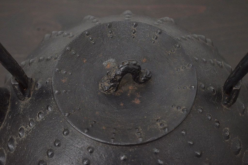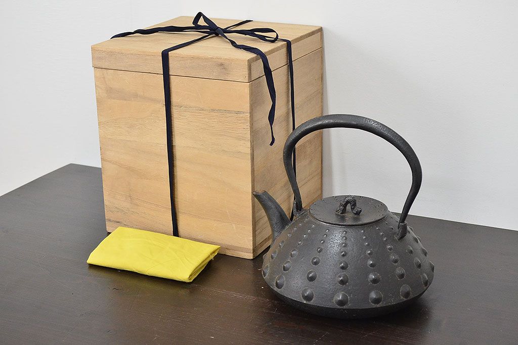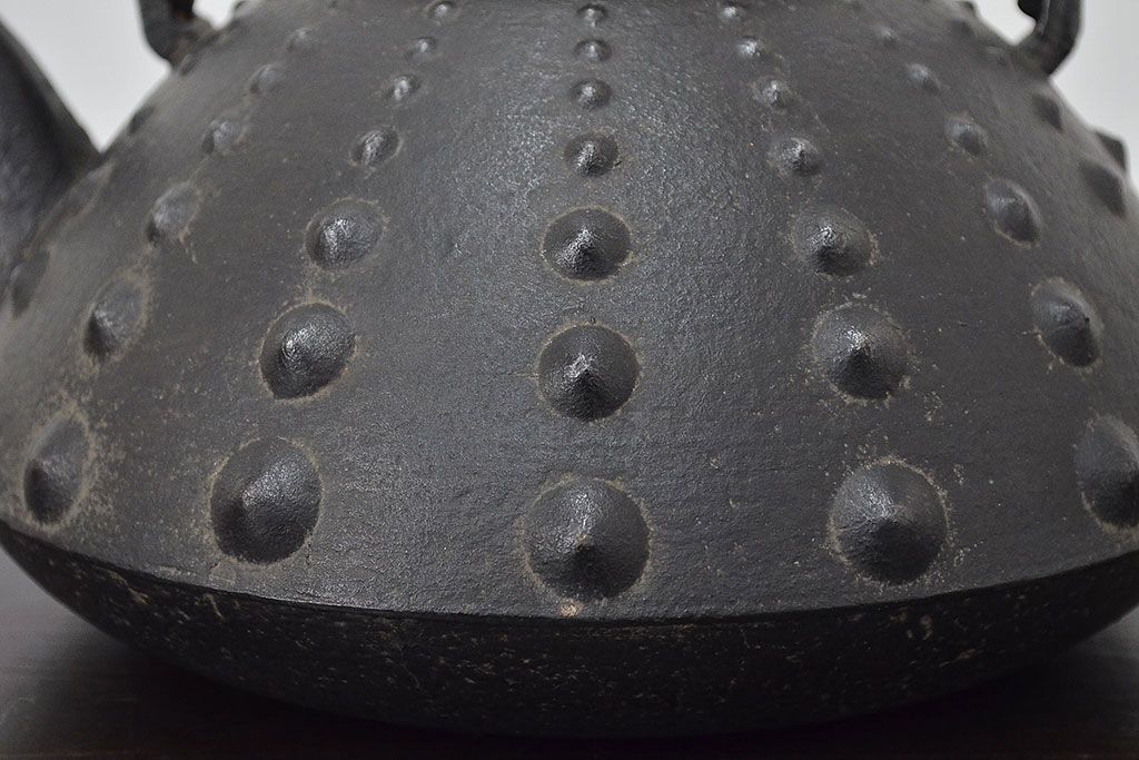 岩手南部 鉄作 兜形源氏霰鉄瓶 共箱(茶道具)(R-046803)