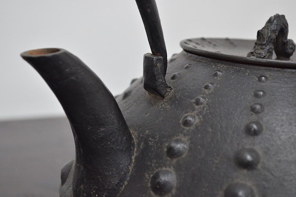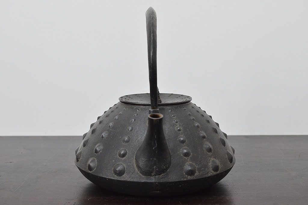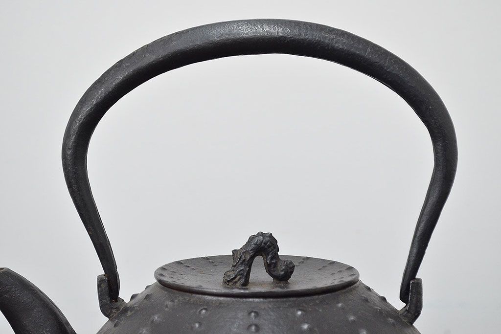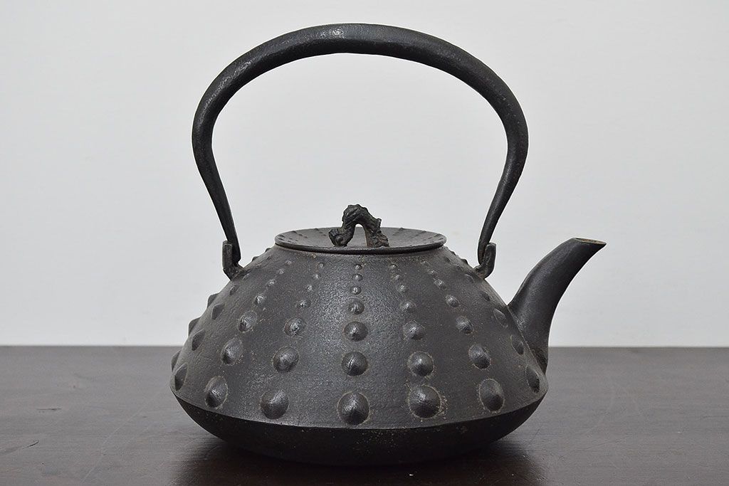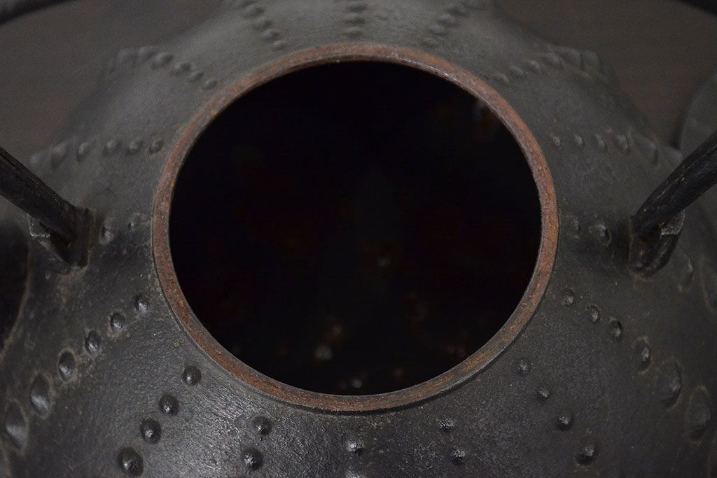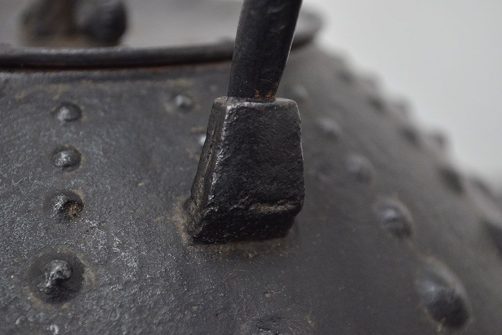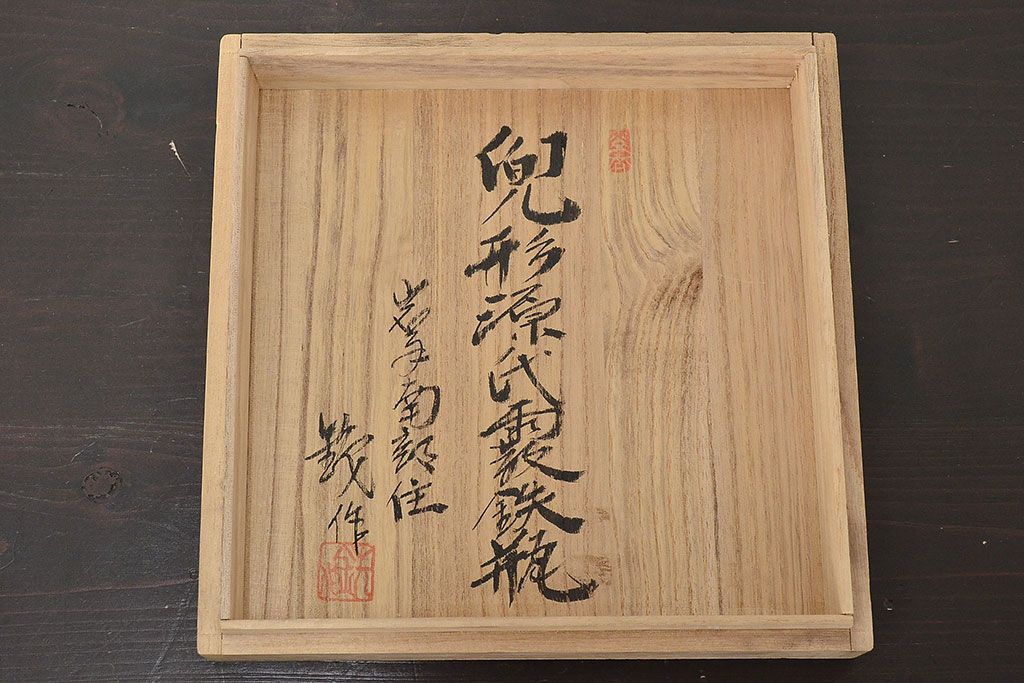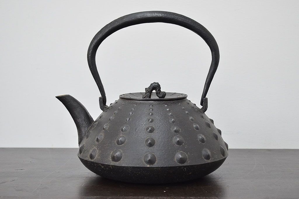 岩手南部 鉄作 兜形源氏霰鉄瓶 共箱(茶道具)(R-046803)