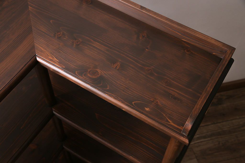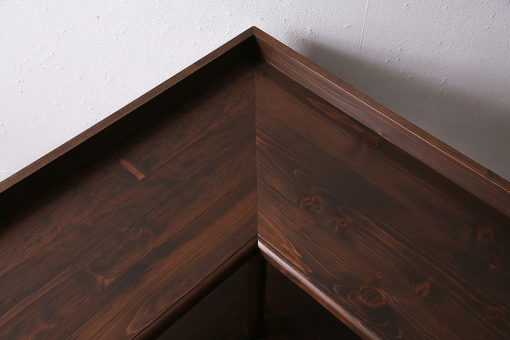 L字型飾り棚を新規製作!他店商品を参考にデザイン。タモ材、ヒノキ材、ヒバ材を使用。お手持ちの家具に近しい色味に着色し仕上げ。(コーナーラック、オープンラック)
