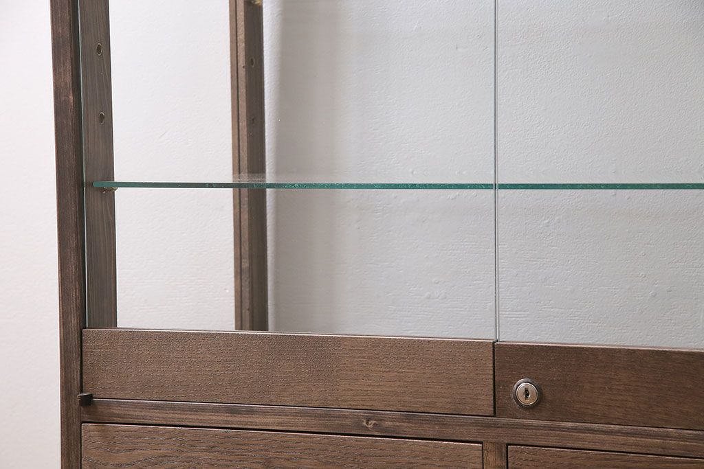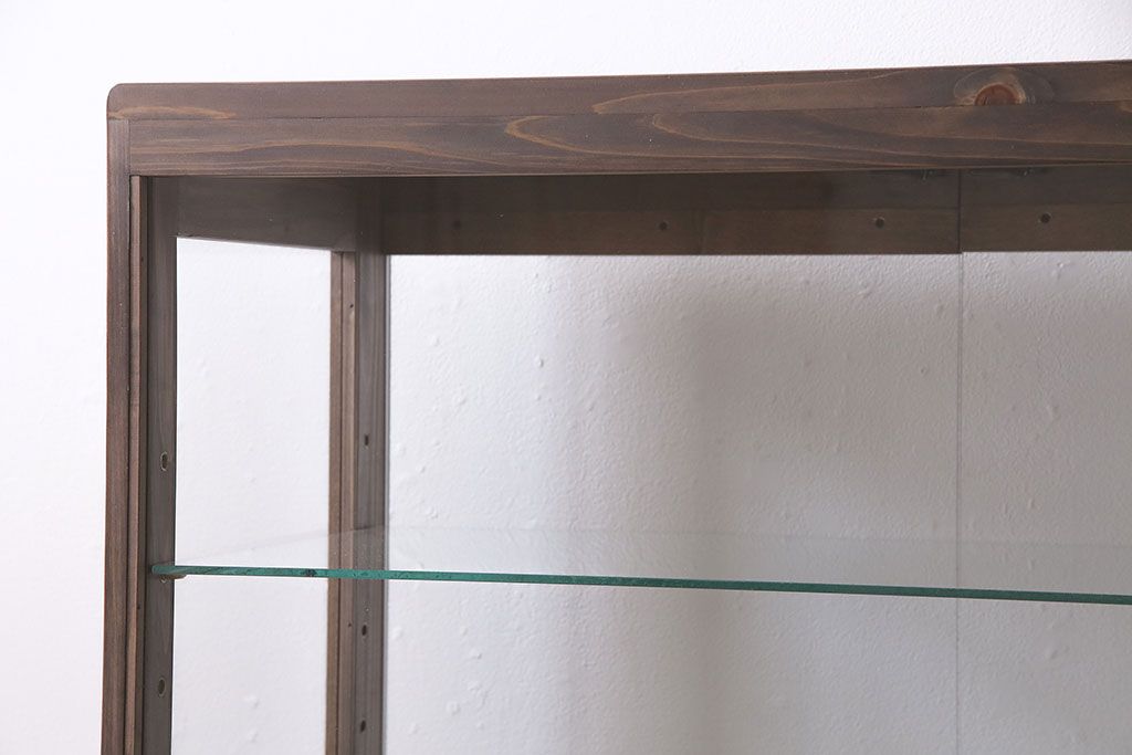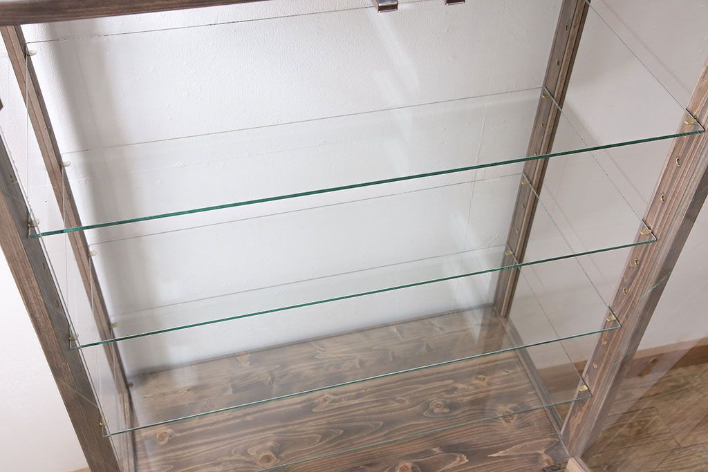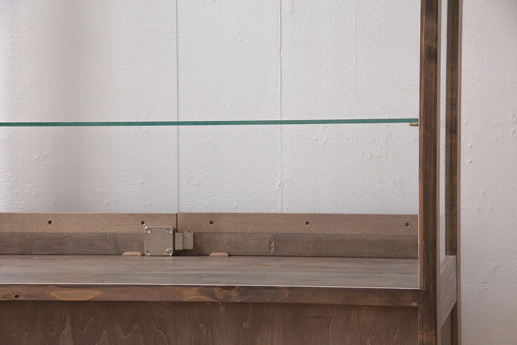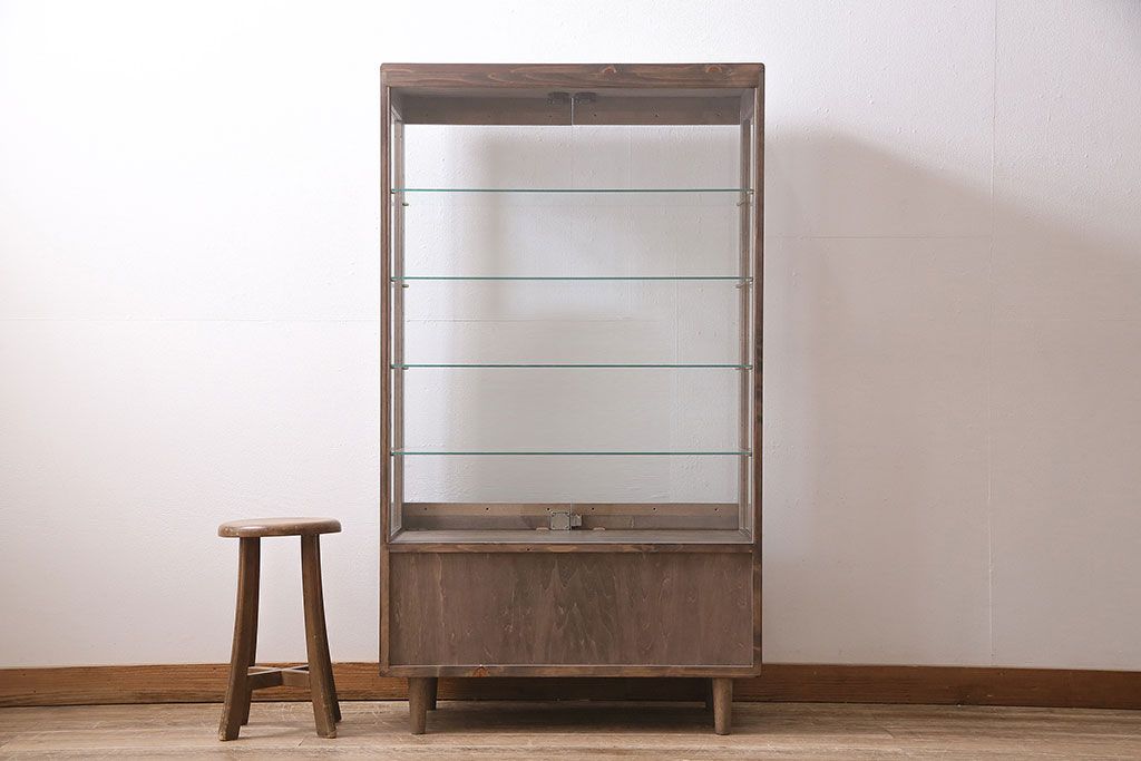 店舗什器 > ガラスケースを新規製作!ヒノキ材で製作。可動式のガラス棚板を設置。鍵と木製脚を取り付け。ウォルナット風に着色し仕上げ。(ショーケース、陳列棚)