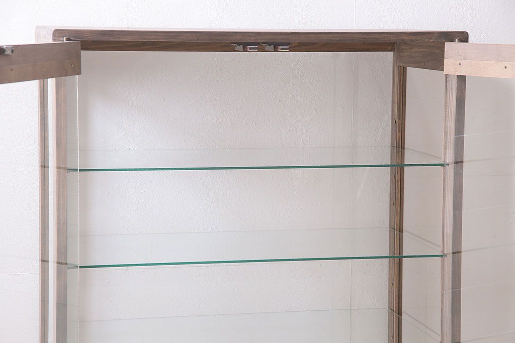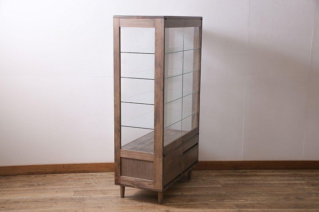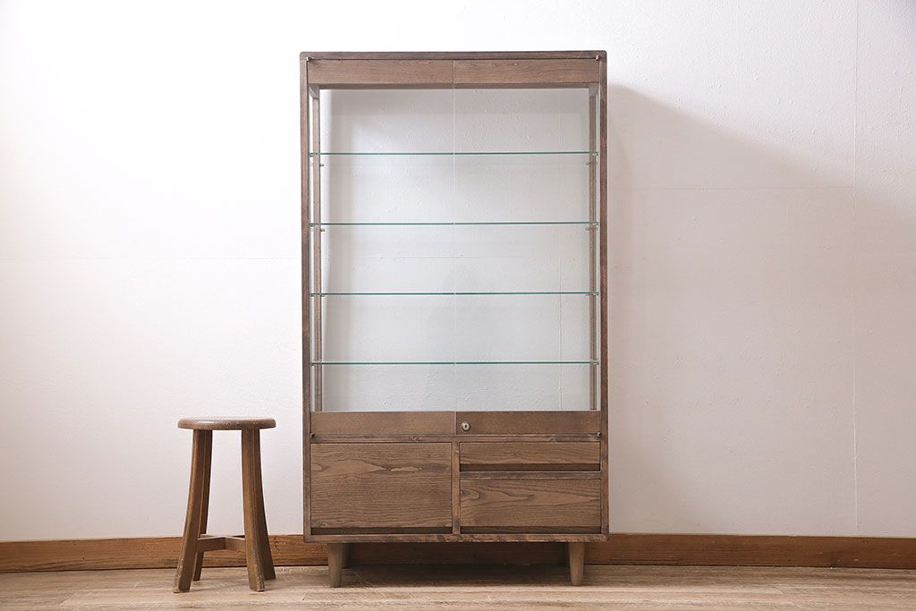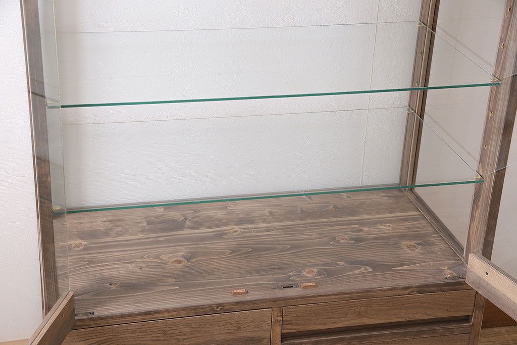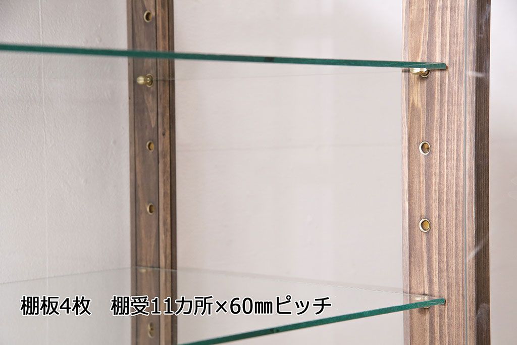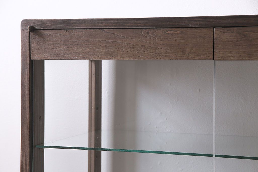 店舗什器 > ガラスケースを新規製作!ヒノキ材で製作。可動式のガラス棚板を設置。鍵と木製脚を取り付け。ウォルナット風に着色し仕上げ。(ショーケース、陳列棚)