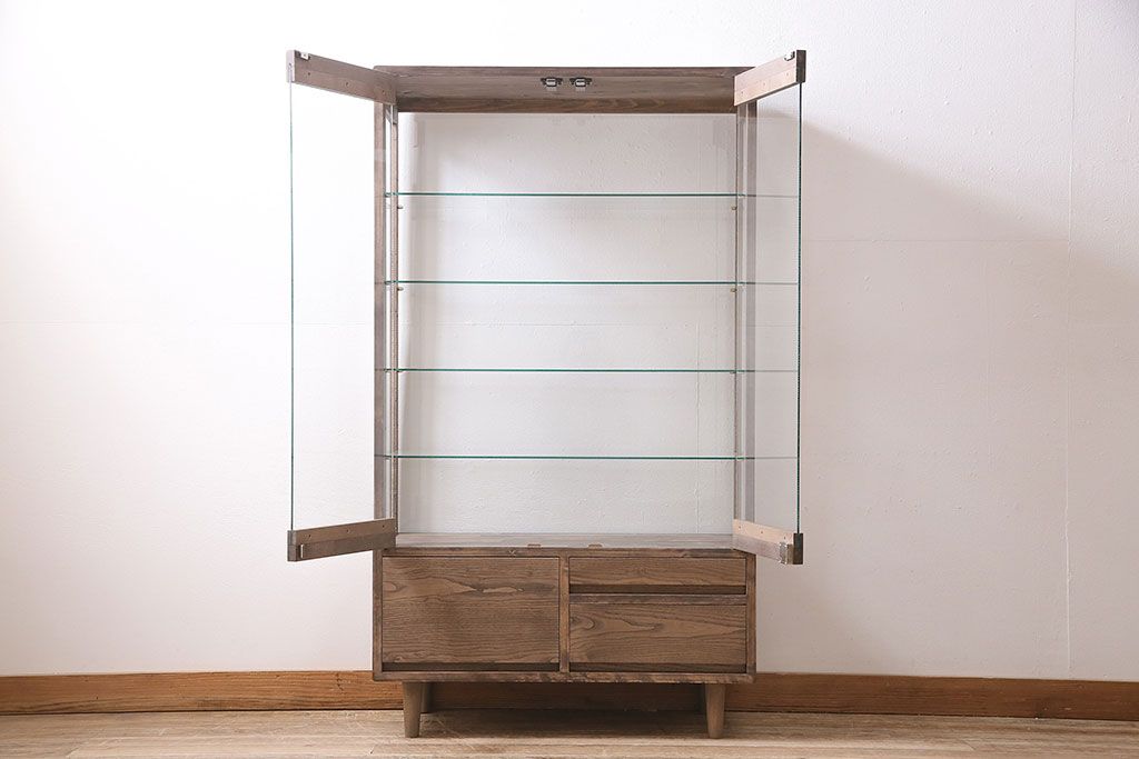 フルオーダー家具実績 > ガラスケースを新規製作!ヒノキ材で製作。可動式のガラス棚板を設置。鍵と木製脚を取り付け。ウォルナット風に着色し仕上げ。(ショーケース、陳列棚)