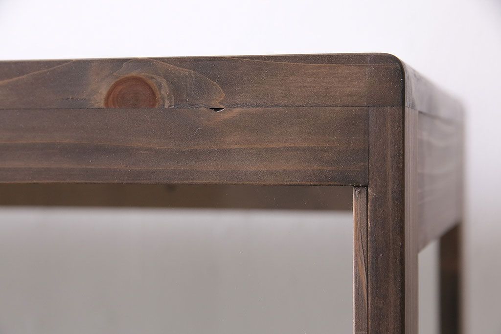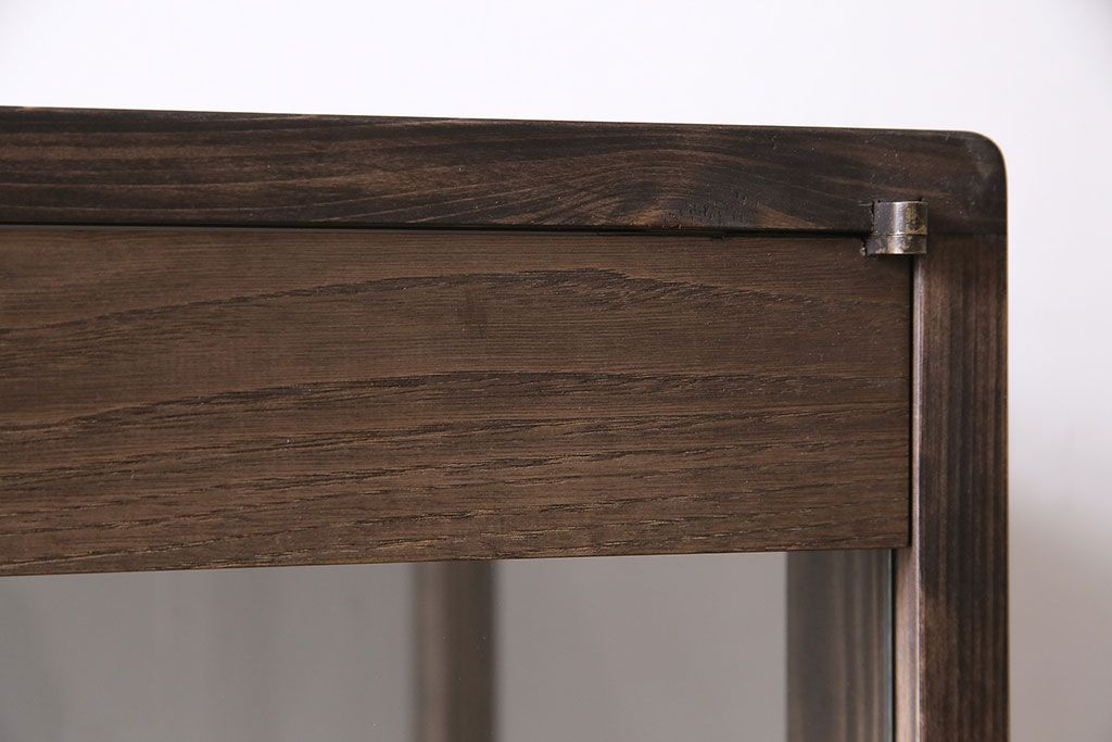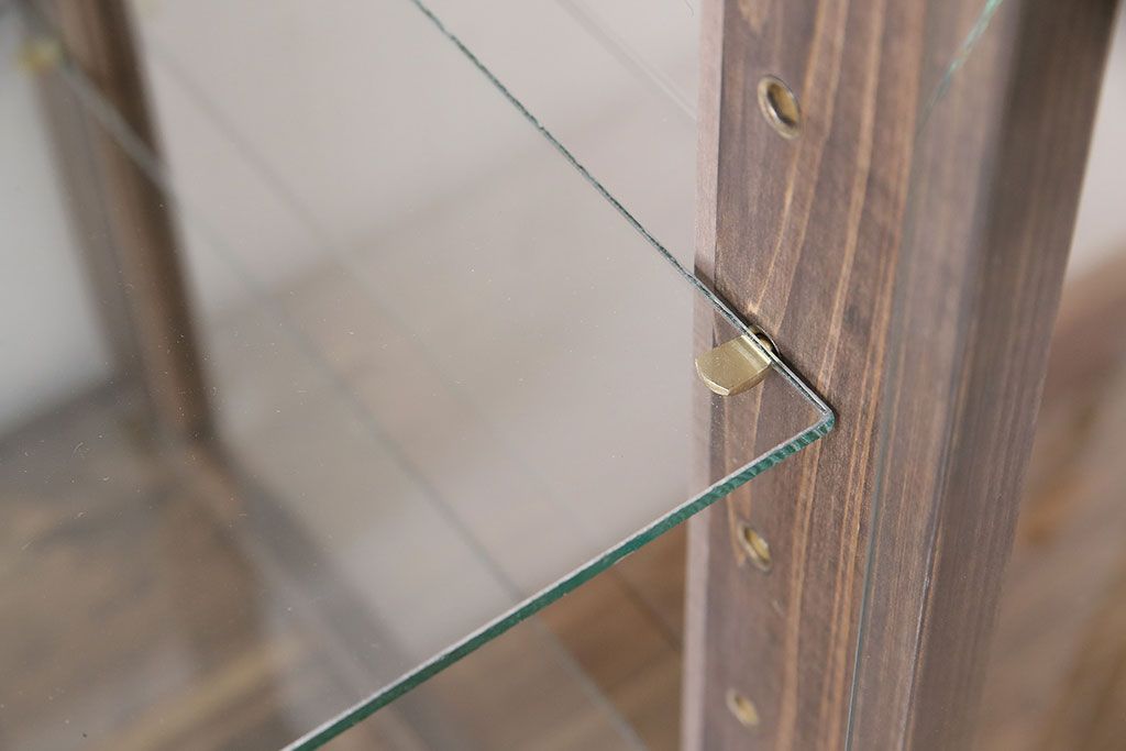ガラスケース・ショーケース > ガラスケースを新規製作!ヒノキ材で製作。可動式のガラス棚板を設置。鍵と木製脚を取り付け。ウォルナット風に着色し仕上げ。(ショーケース、陳列棚)