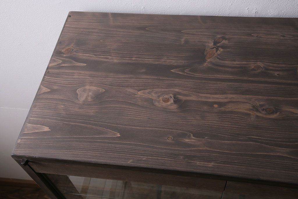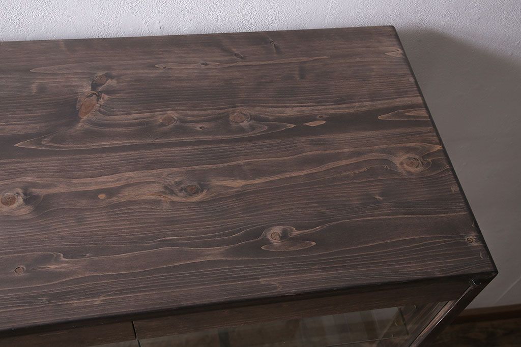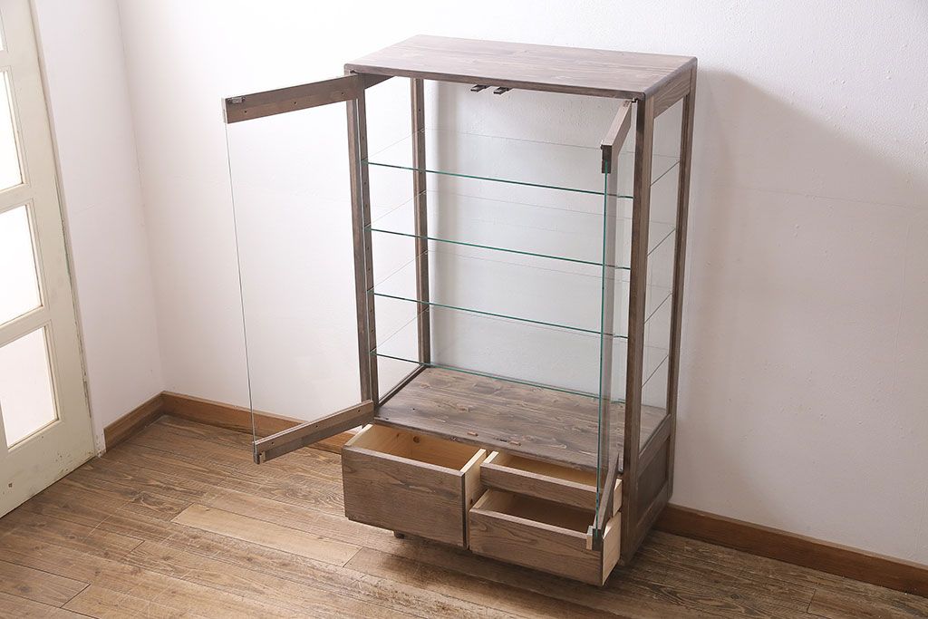 ガラスケースを新規製作!ヒノキ材で製作。可動式のガラス棚板を設置。鍵と木製脚を取り付け。ウォルナット風に着色し仕上げ。(ショーケース、陳列棚)