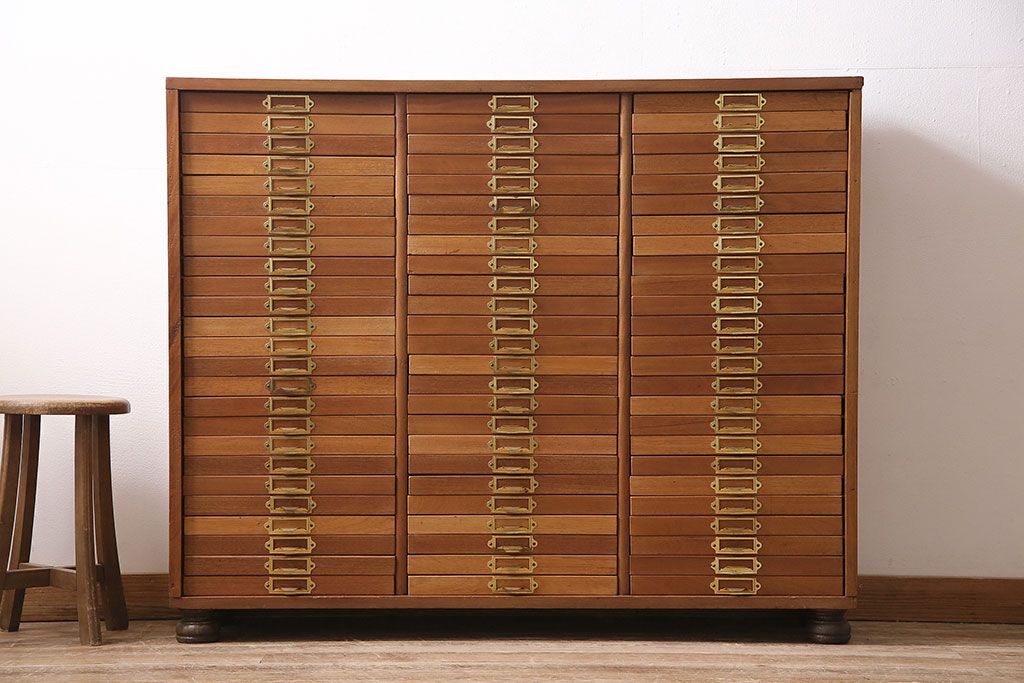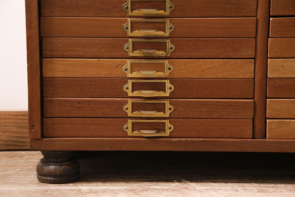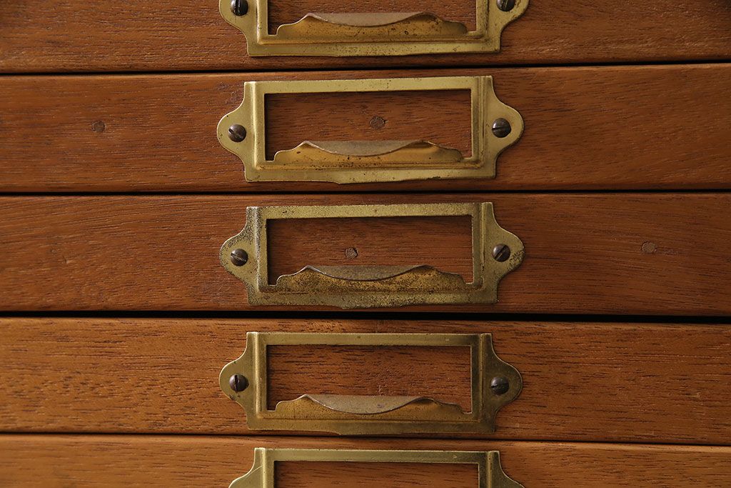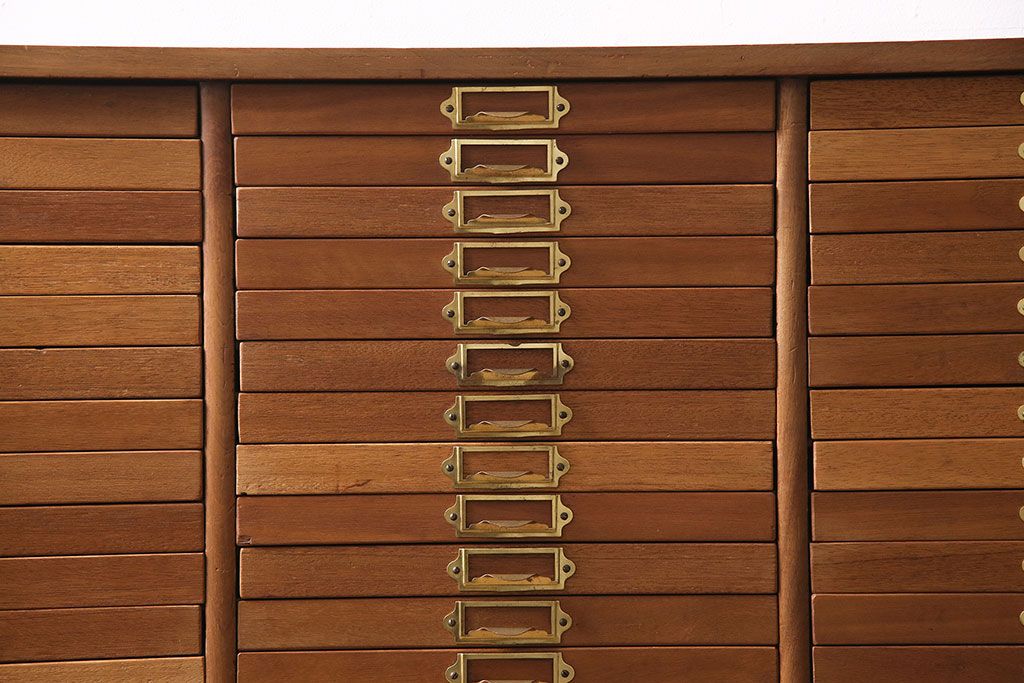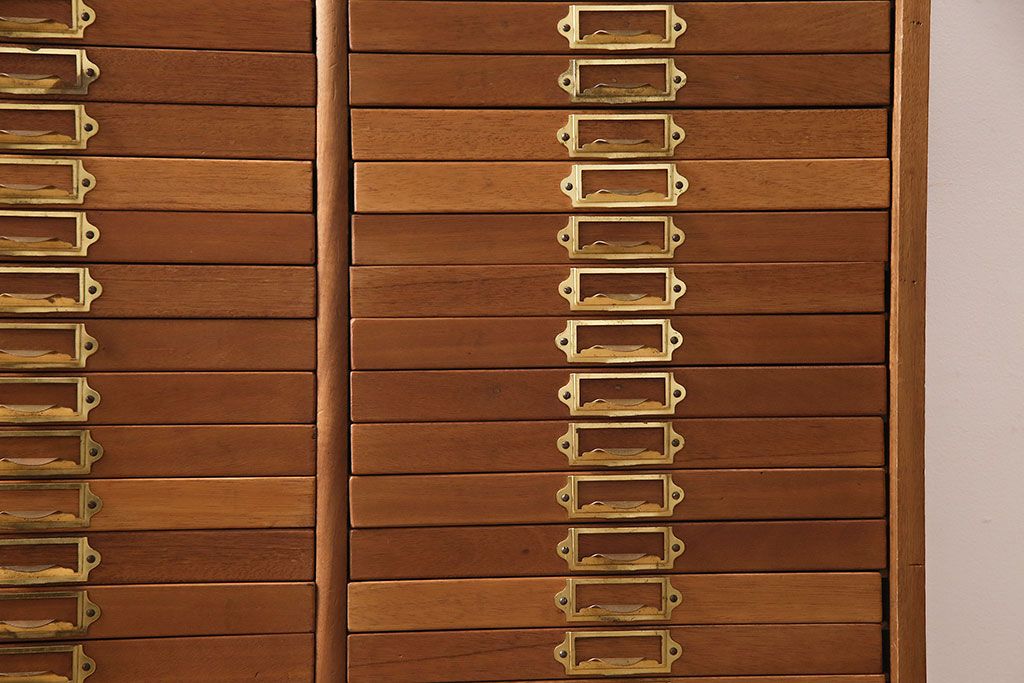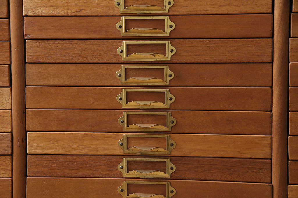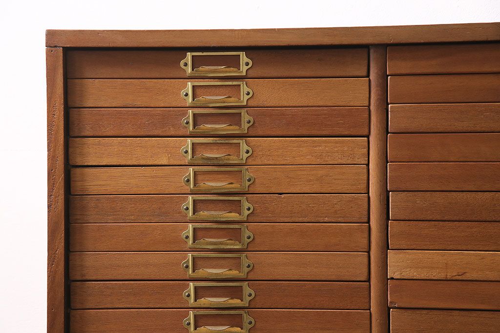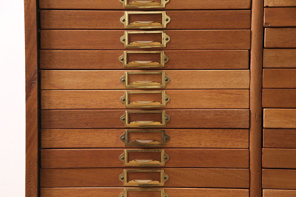 チェスト・引き出し > ヴィンテージ家具 イギリスビンテージ 前面チーク材 ネームプレート付き 引き出しが75杯も付いたチェスト(小物収納、書類収納)(R-046897)
