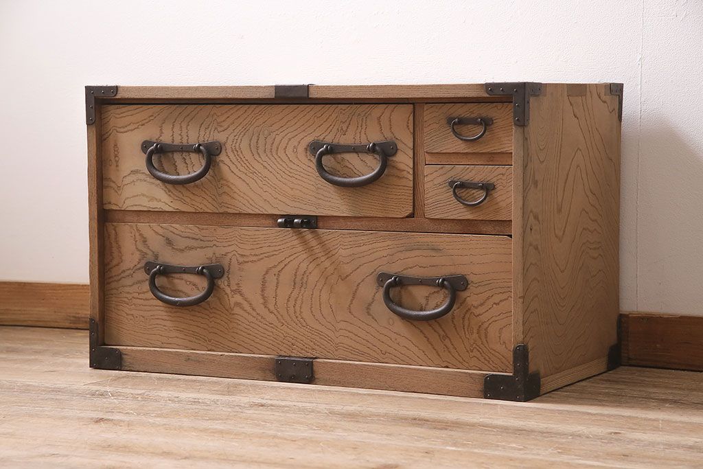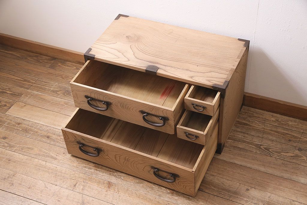 アンティーク家具 明治大正期 ストリップド(剥離) 三方ケヤキ材 厚手素材 古い木肌が味わいを感じさせる小タンス(引き出し、テレビ台、リビングボード)(R-046912)