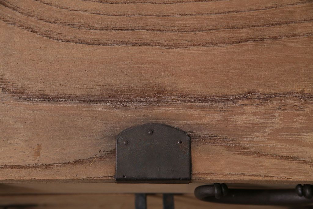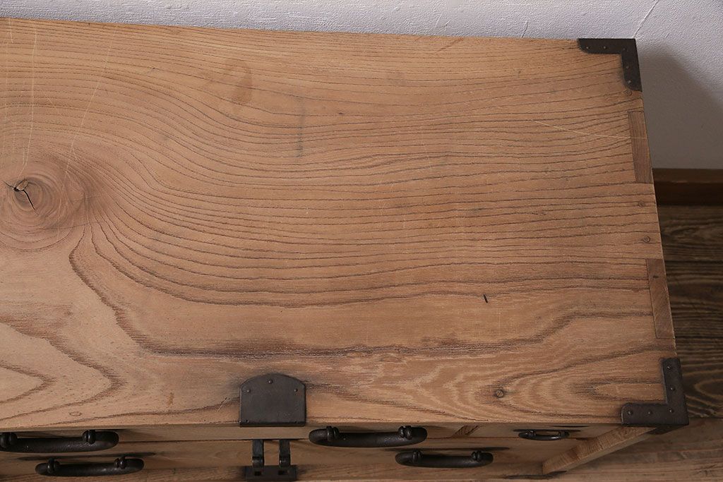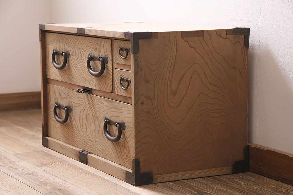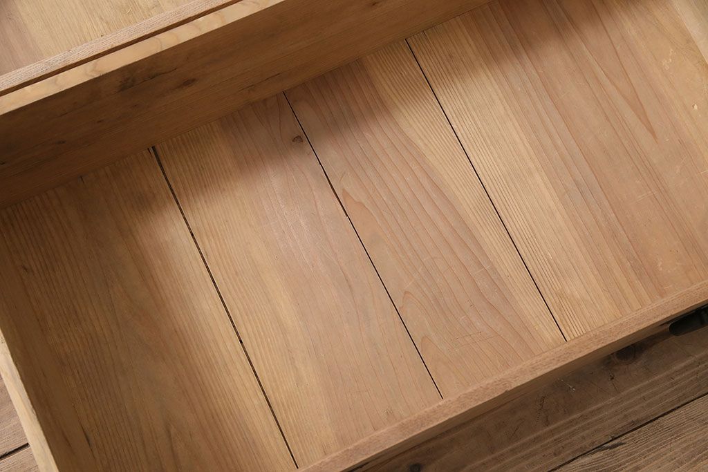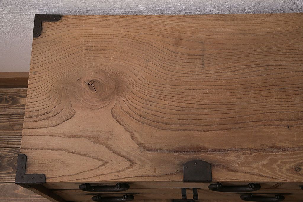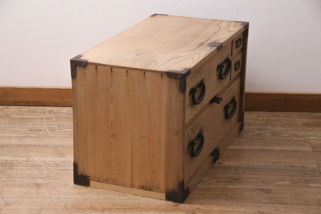 ラフジュ工房> ストリップド(剥離)家具 > アンティーク家具 明治大正期 ストリップド(剥離) 三方ケヤキ材 厚手素材 古い木肌が味わいを感じさせる小タンス(引き出し、テレビ台、リビングボード)(R-046912)